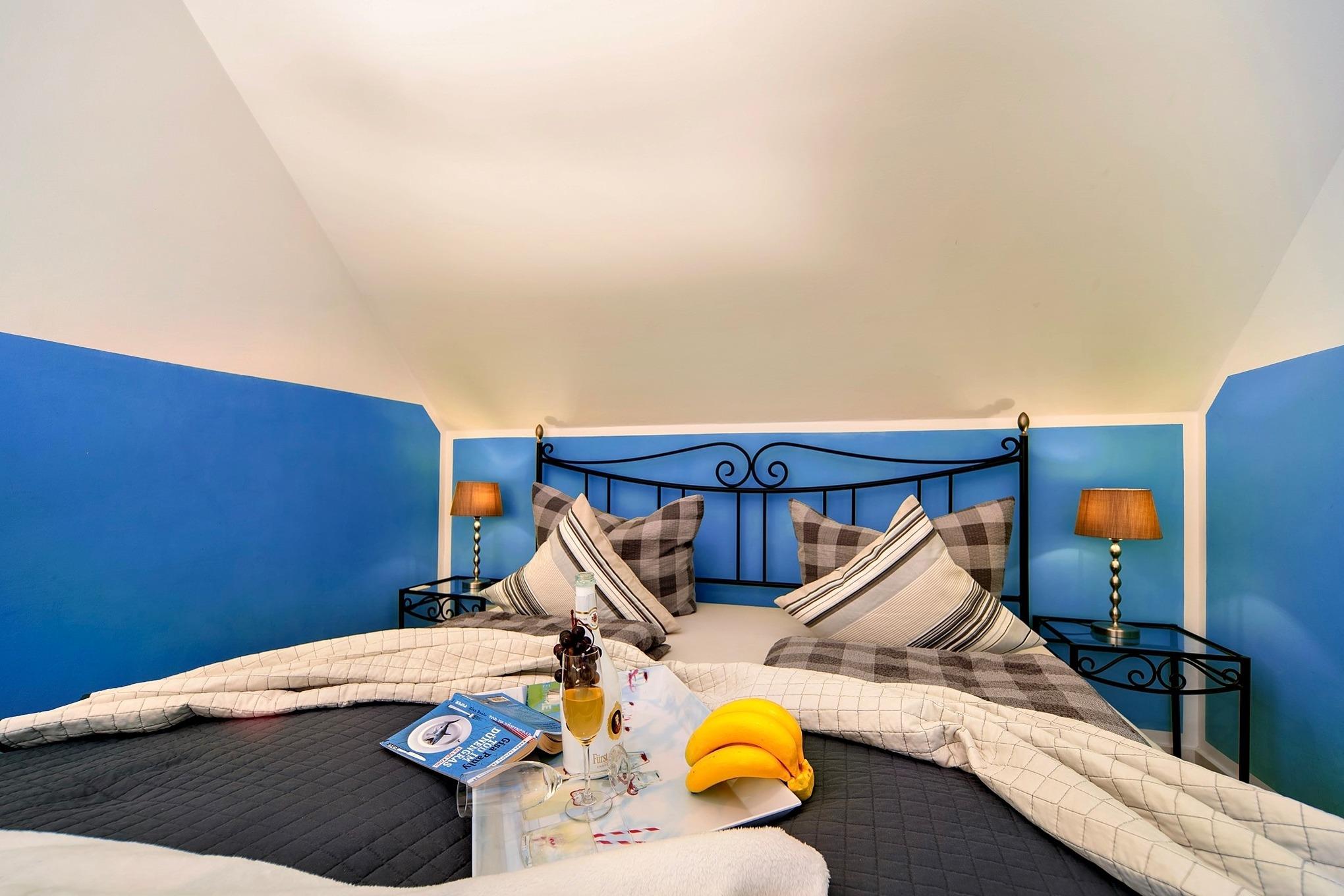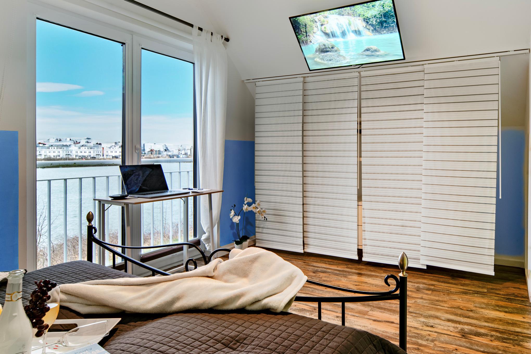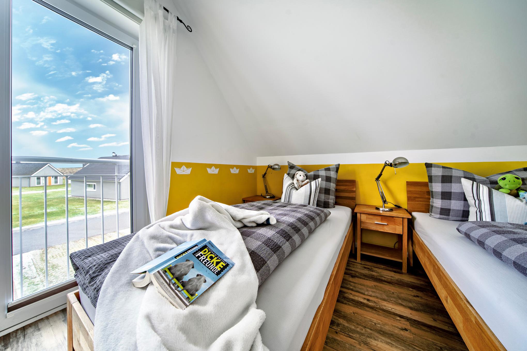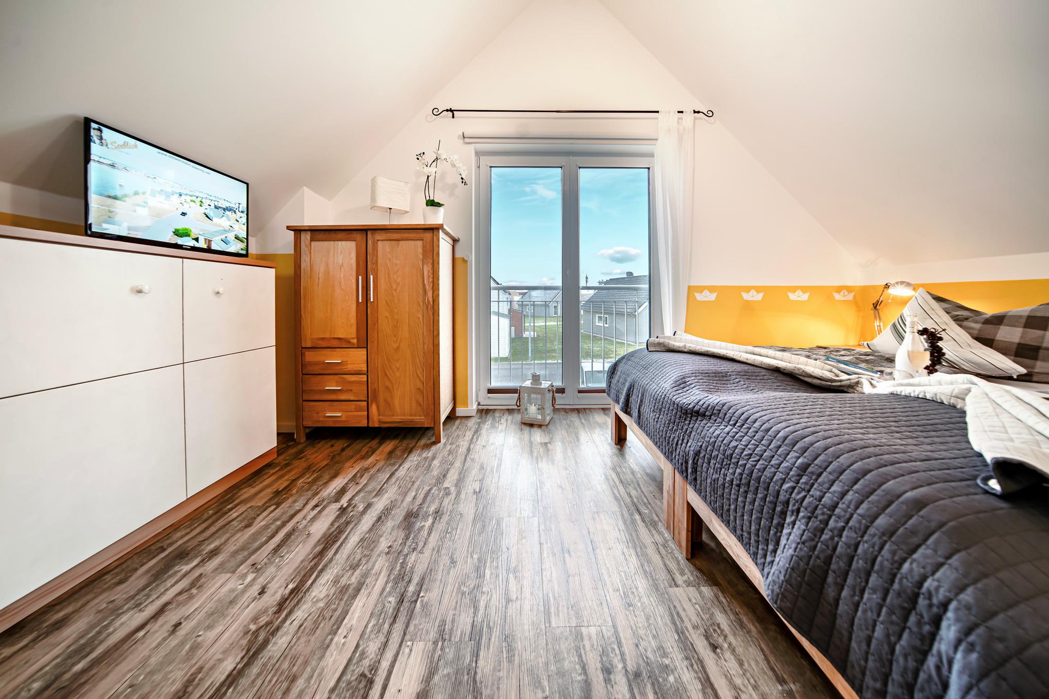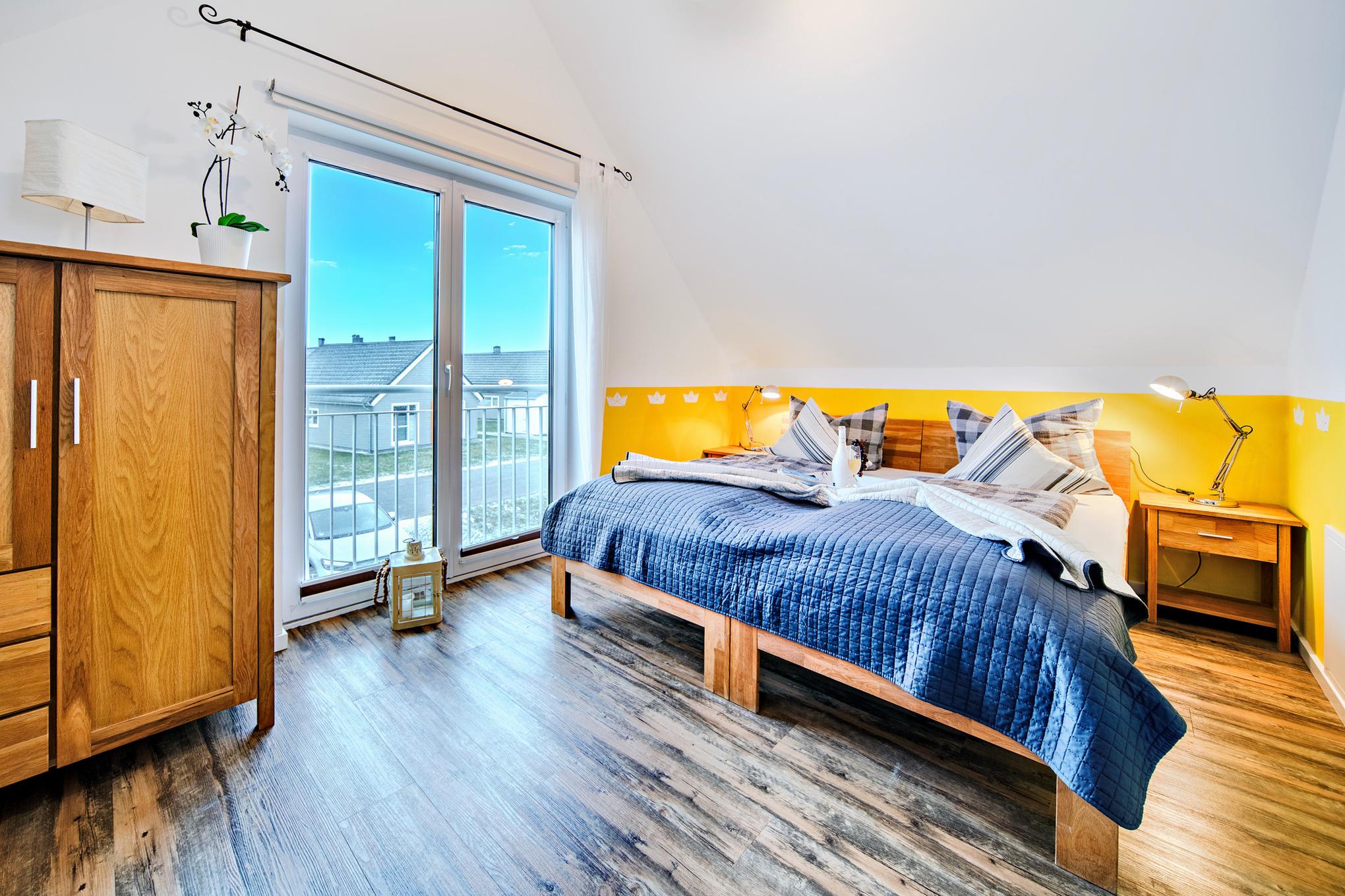 Im Obergeschoss des Ferienhauses finden Sie zwei Schlafzimmer vor, die zum Träumen einladen. Der Masterbedroom verwöhnt Sie mit einem komfortablen Doppelbett und einem atemberaubenden, direkten Wasserblick. Eine Deckenlampe mit Bluetoothfunktion versorgt unsere Gäste mit Musik. Das zweite Schlafzimmer verfügt über zwei Einzelbetten, die bei Bedarf auch zu einem Doppelbett umfunktioniert werden können, sowie ein hochwertiges Schrankbett. Ein Rausfallschutz für die kleinen Ostseeurlauber steht zur Verfügung.