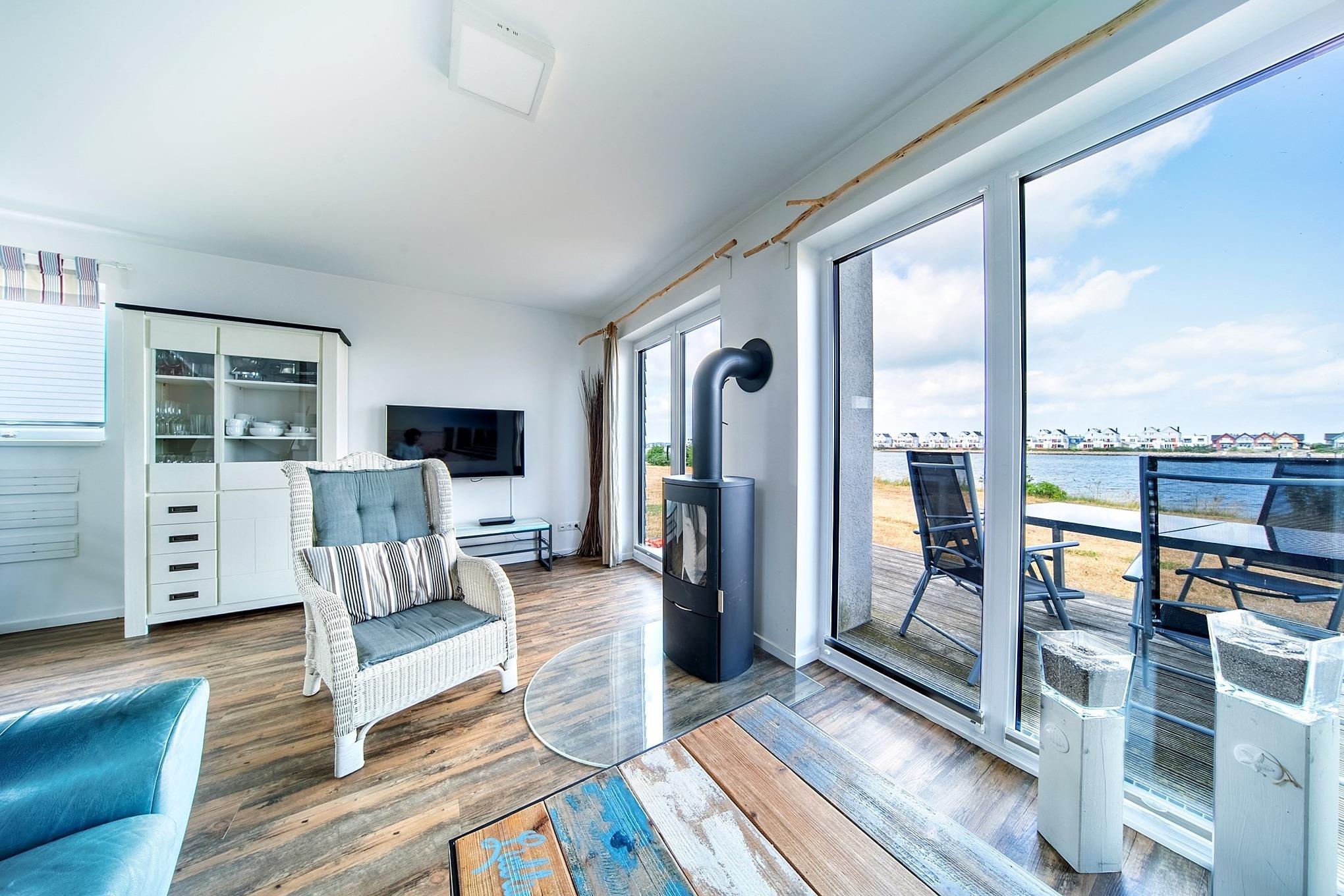 Das Ferienhaus Lieblingsplatz besticht durch eine liebevolle Einrichtung und eine familienfreundliche Ausstattung, die jeden begeistern wird. Der offene Wohn- und Essbereich im Erdgeschoss begeistert mit seiner Helligkeit und den bodentiefen Fenstern, die einen atemberaubenden Blick auf das Hafenbecken ermöglichen. Genießen Sie gemütliche Abende vor dem knisternden Kamin auf dem Ledersofa und entspannen Sie sich in dieser einladenden Atmosphäre. Gesellschaftsspiele und Bücher stehen für gemütliche Familienabende bereit.