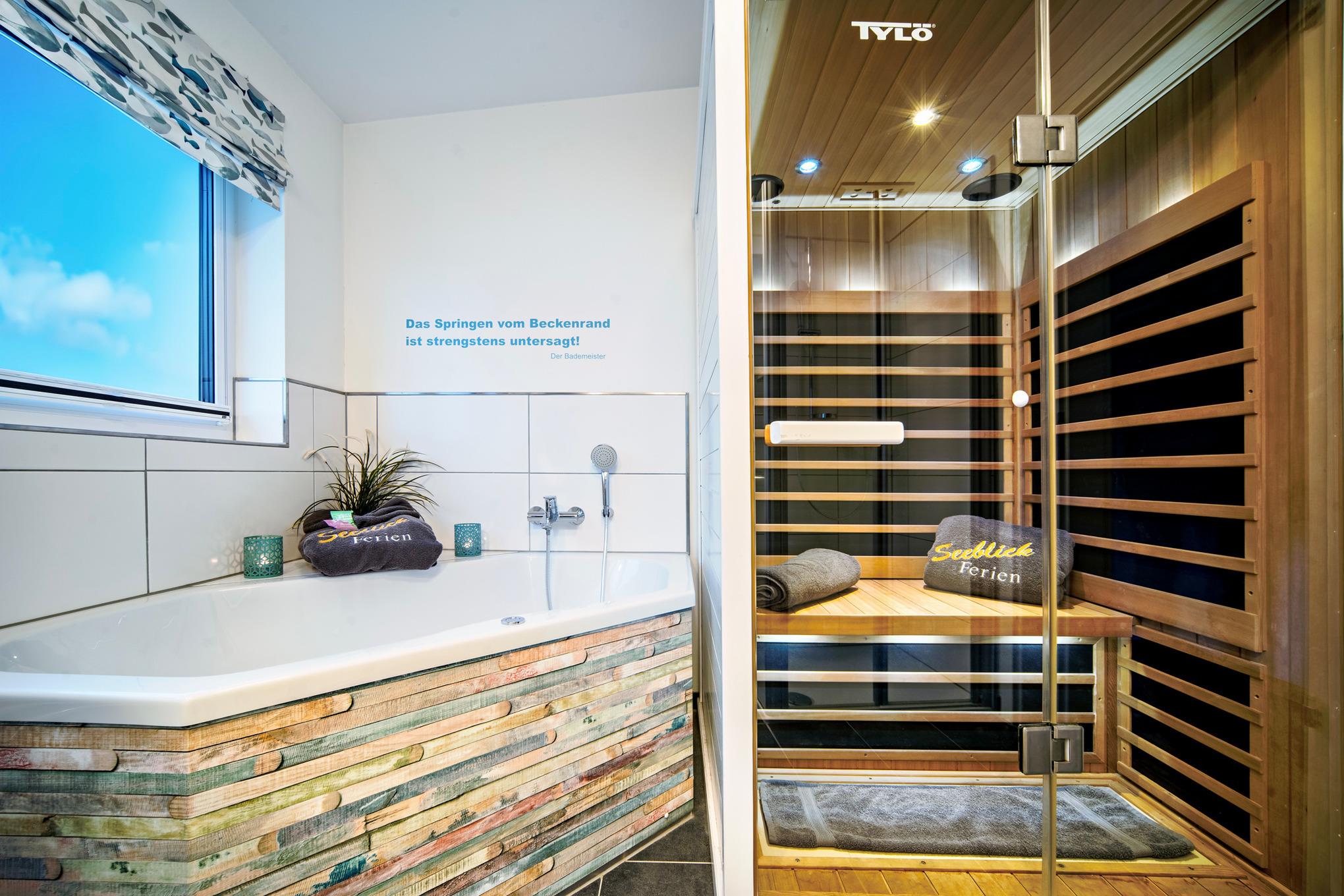 Das Obergeschoss bietet zudem ein vollausgestattetes Bad mit Whirlpoolwanne, bodengleicher Dusche, Infrarotsaunakabine mit LED-Farblichttherapie und HiFi-System mit Anschluss für MP3-Player, USB, Radio und Lautsprecher - ein wahrer Wellnessbereich mit Blick auf das Wasser.