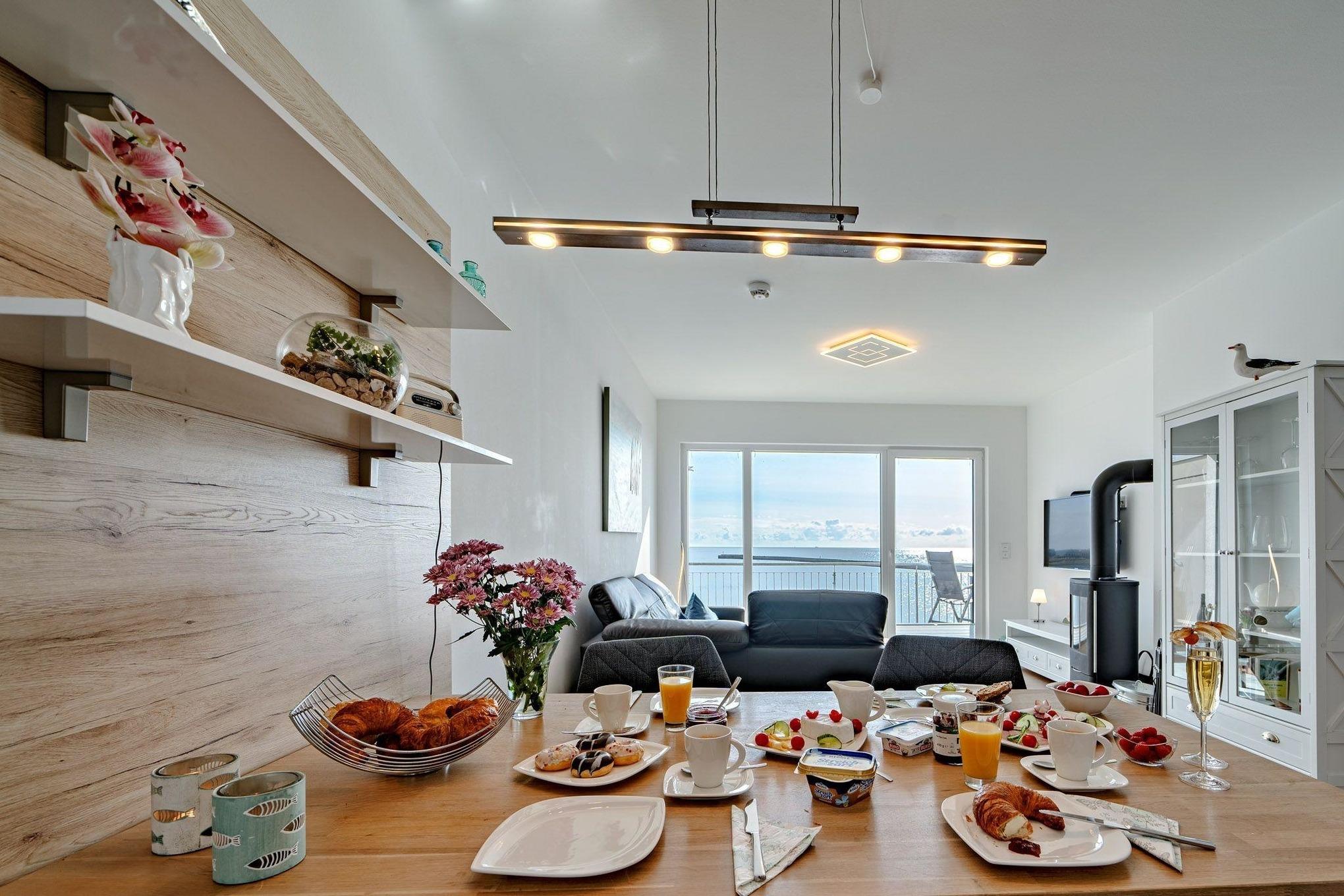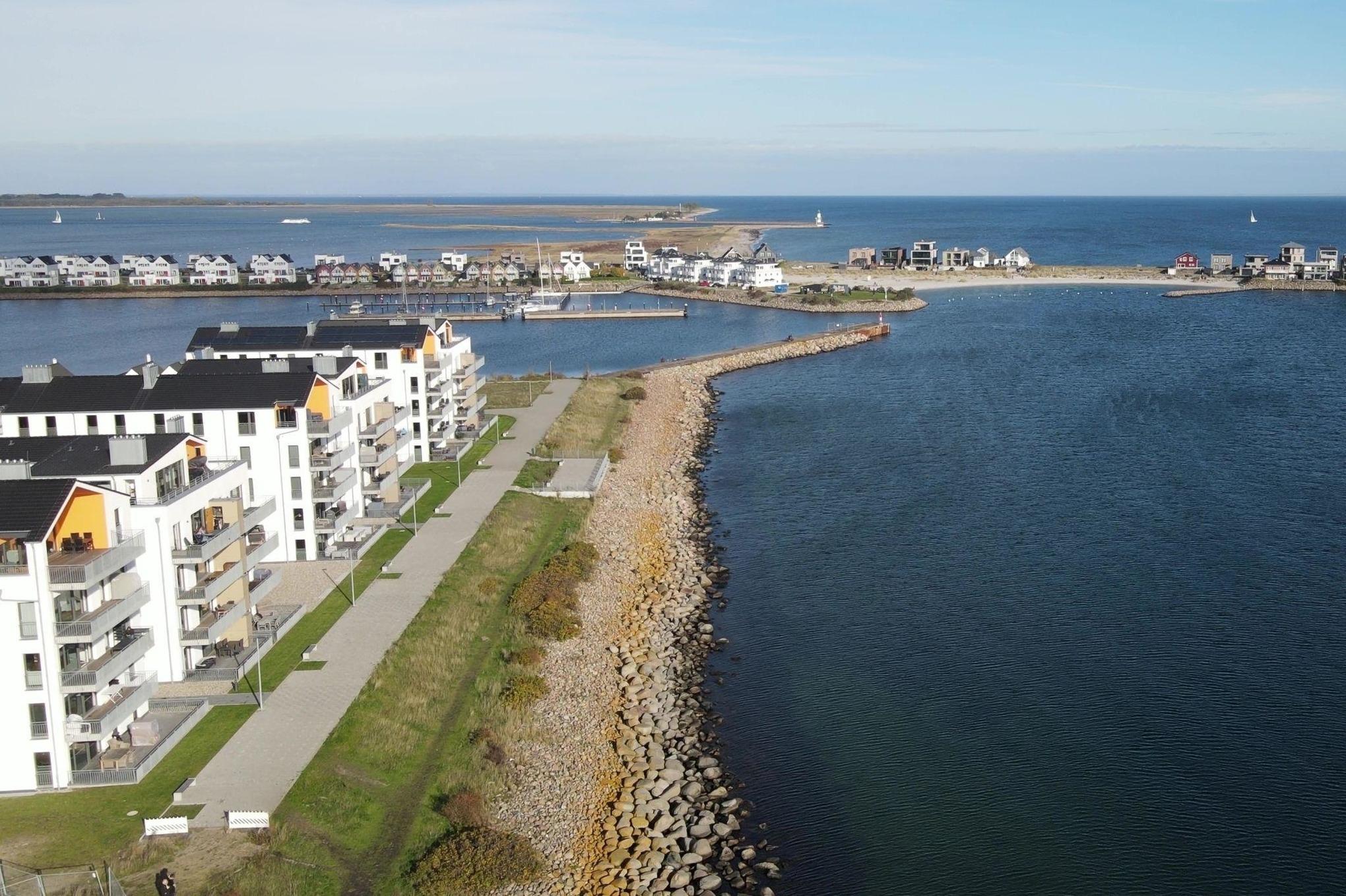 Die elegante Wohnung ist im modernen maritimen Landhausstil gehalten und verspricht zu jeder Jahreszeit Gemütlichkeit und Wohlfühlatmosphäre. Der offene Wohn-Essbereich ist lichtdurchflutet durch große bodentiefe Fenster, die das helle Echtholzparkett perfekt zur Geltung bringen. An kühlen Tagen sorgt die Fußbodenheizung in allen Räumen für wohlige Wärme. Bei stürmischem Wetter können Sie es sich auf der allergikerfreundlichen, aus Textilleder bestehenden, gemütlichen Wohnlandschaft bequem machen und dem Wellentreiben an der Hafeneinfahrt zuschauen, während im Kamin ein gemütliches Feuer knistert.