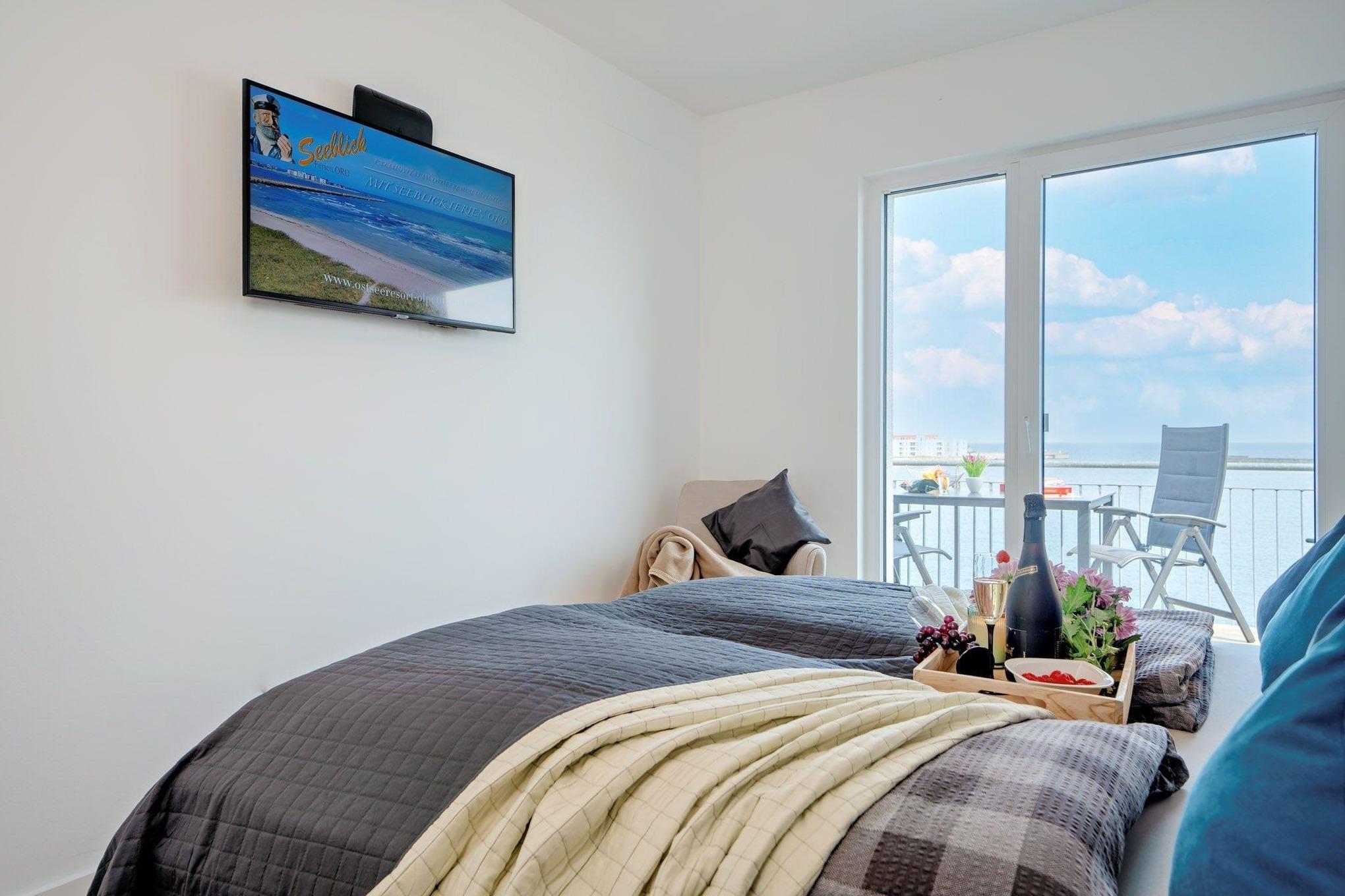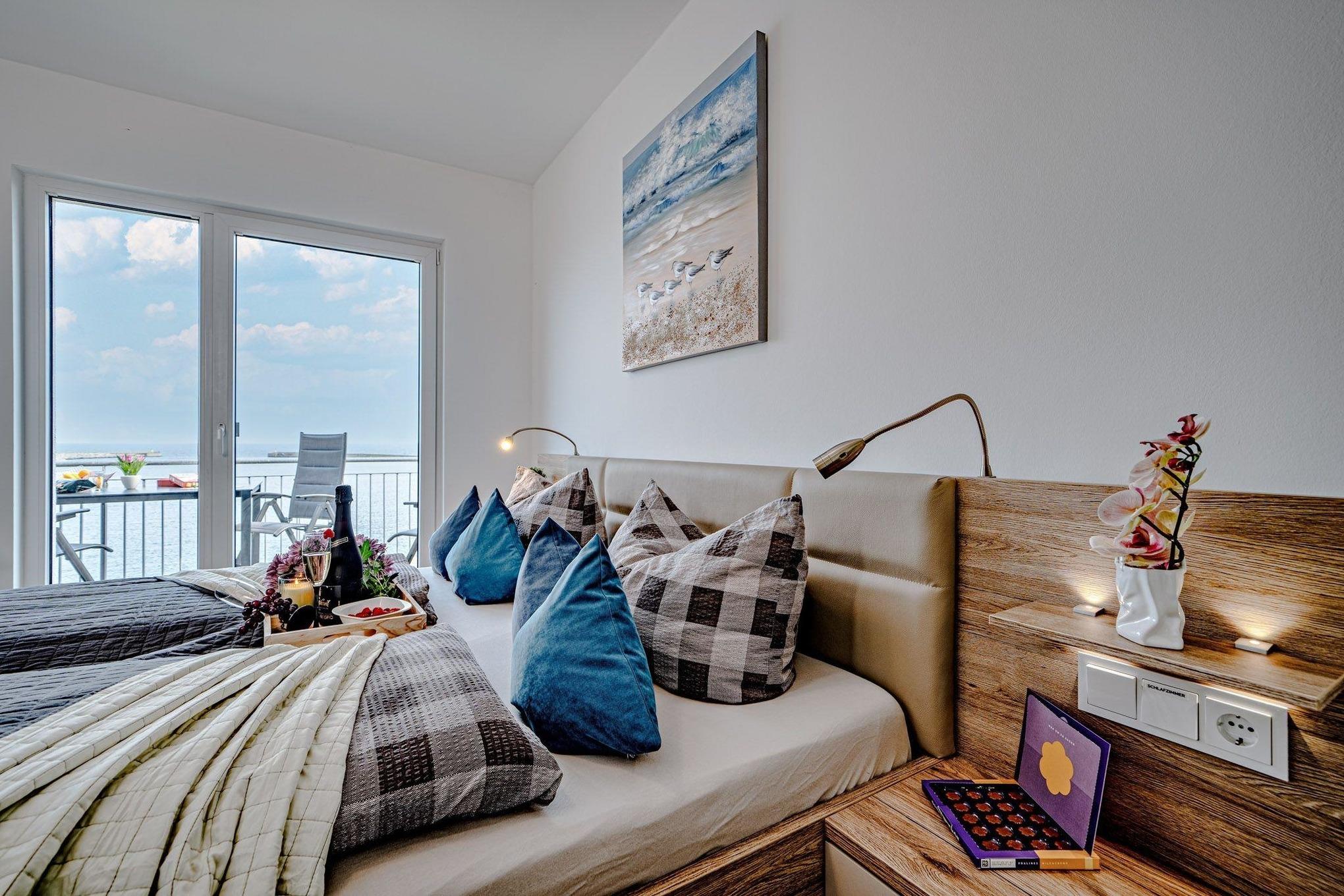 Beide Schlafzimmer bieten dank bodentiefer Fenster einen grandiosen Meerblick und haben direkten Zugang zu Balkonen. Das eine Schlafzimmer führt auf den Hauptbalkon, während das größere Schlafzimmer einen eigenen separaten Balkon besitzt. Hochwertige Doppelbetten mit individuell verstellbaren Lattenrosten garantieren erholsamen Schlafkomfort.