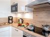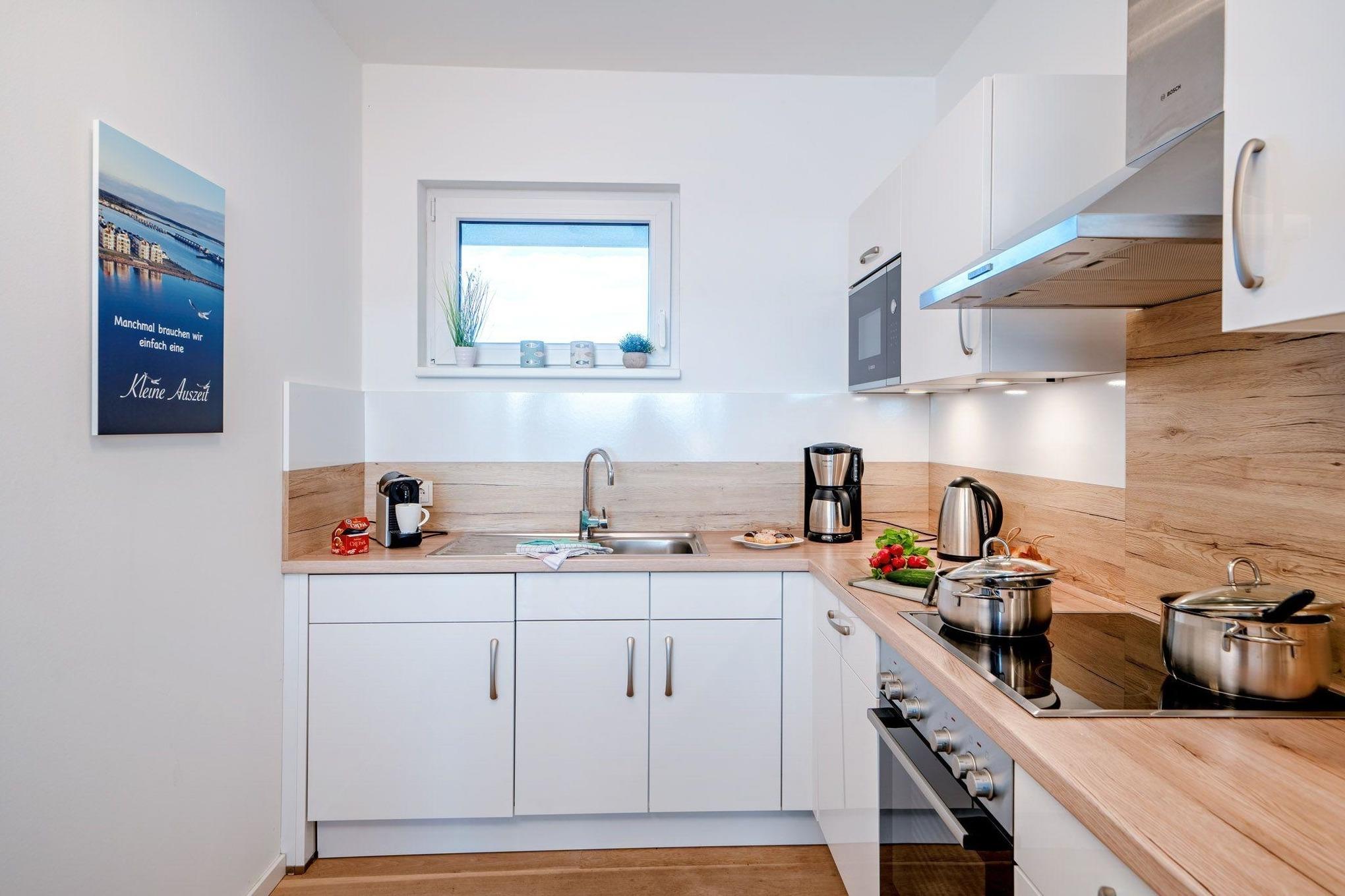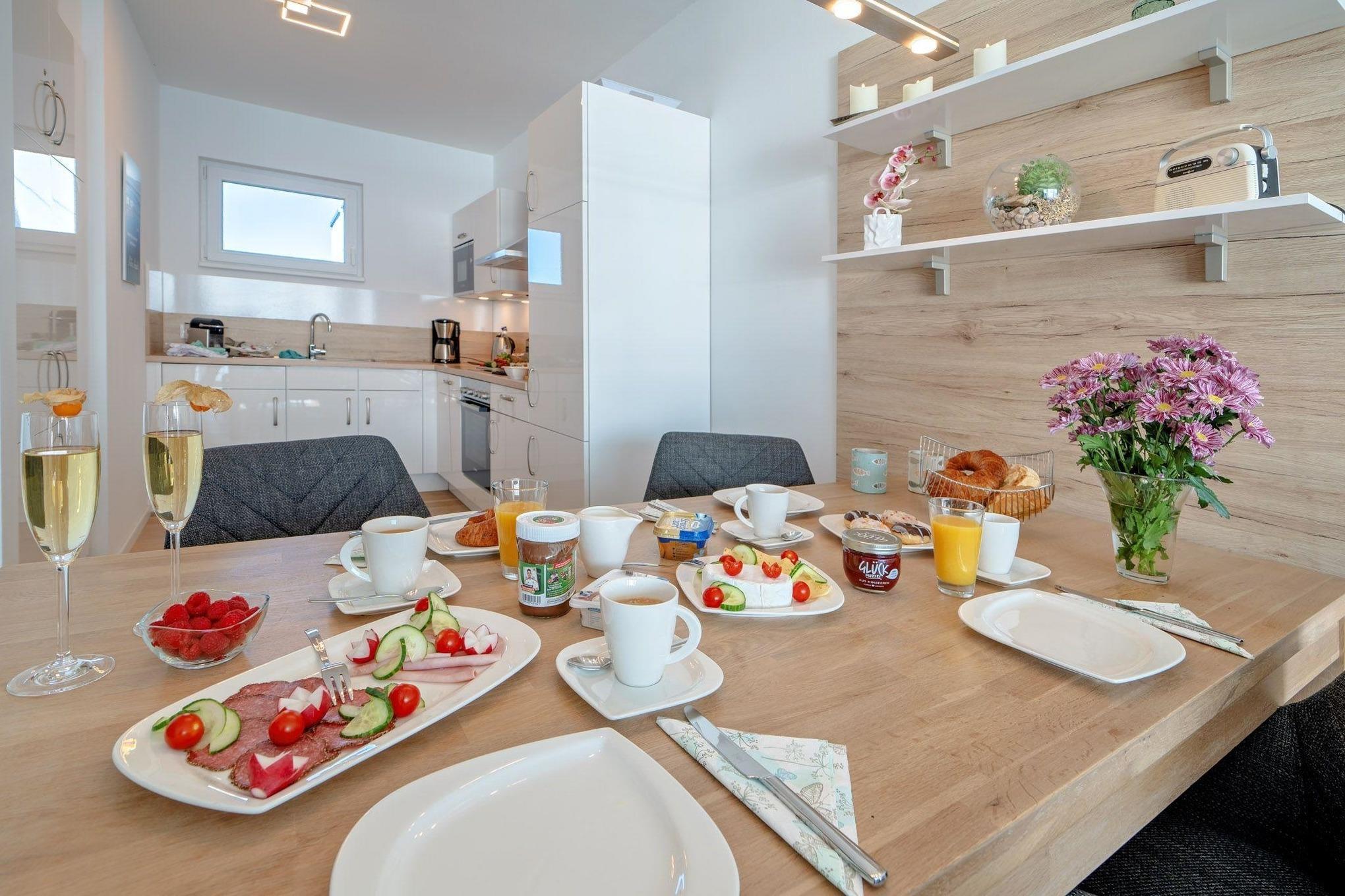 Die moderne, voll ausgestattete Küche lässt keine Wünsche offen und der angrenzende Essbereich bietet viel Platz für kulinarische Erlebnisse. Der große Balkon, der direkt ans Wasser grenzt, lädt ebenfalls zum Essen und Verweilen ein, natürlich sind auch Liegestühle vorhanden.