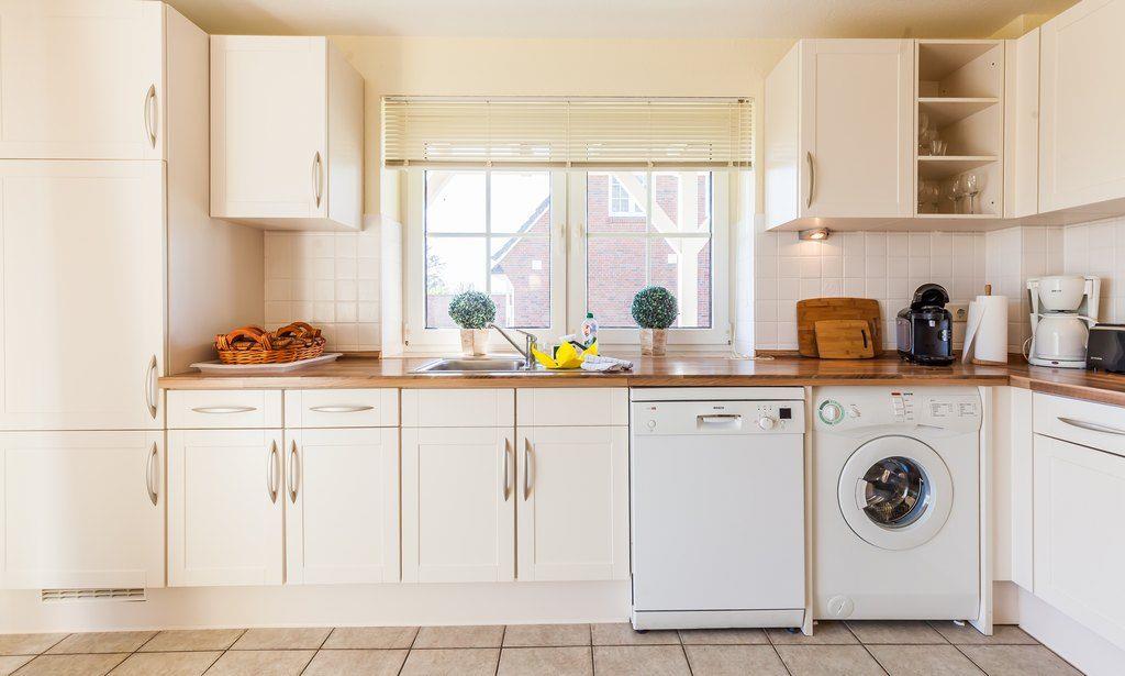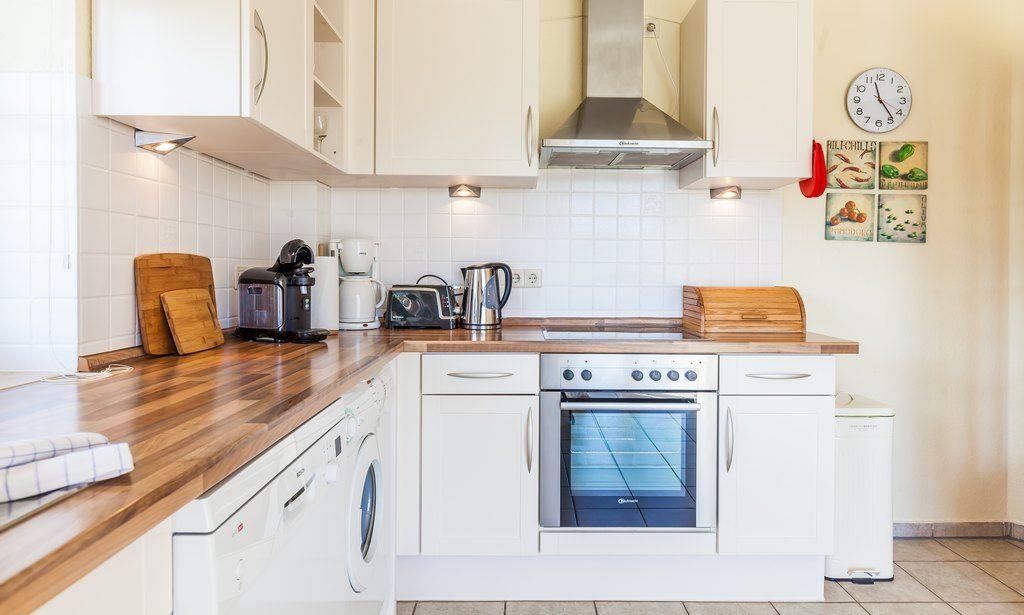 Die Ausstattung umfasst einen Wohn- und Essraum mit Schlafsofa für 2 Personen, zwei Doppel-Schlafzimmer, eine großzügige Einbauküche mit Spüle, Ceranfeld, Backofen, Kühlschrank, Geschirrspüler und Waschmaschine, sowie ein Duschbad/WC.