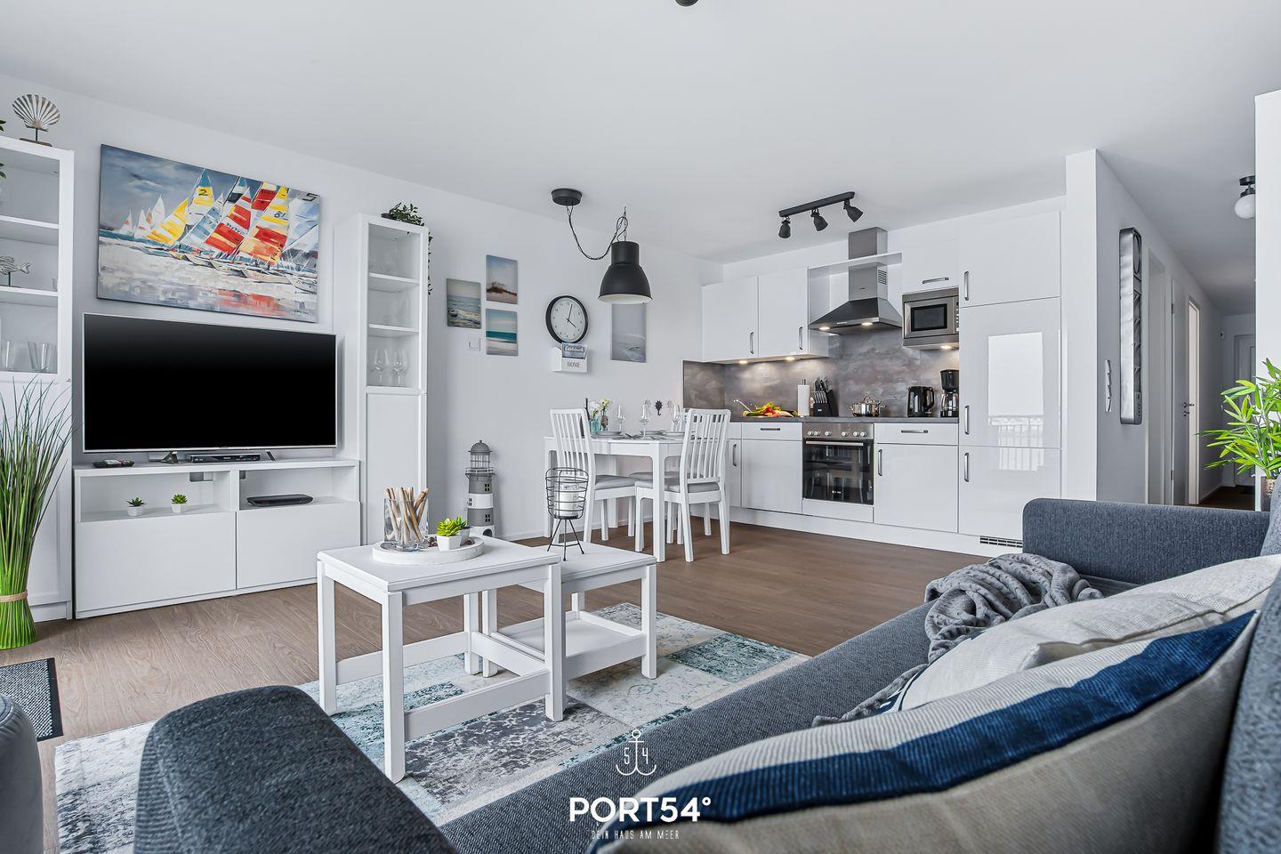 Der loftartige Wohn- und Essbereich der „Hafenmelodie“ beeindruckt mit bodentiefen Fenstern, die den Raum in helles Tageslicht tauchen und eine freundliche Atmosphäre schaffen. Dieser einladende Bereich lädt Dich zu jeder Tageszeit zum Verweilen ein, sei es bei einem gemütlichen Frühstück am Morgen oder einem entspannten Abendessen mit Blick auf den malerischen Hafen.