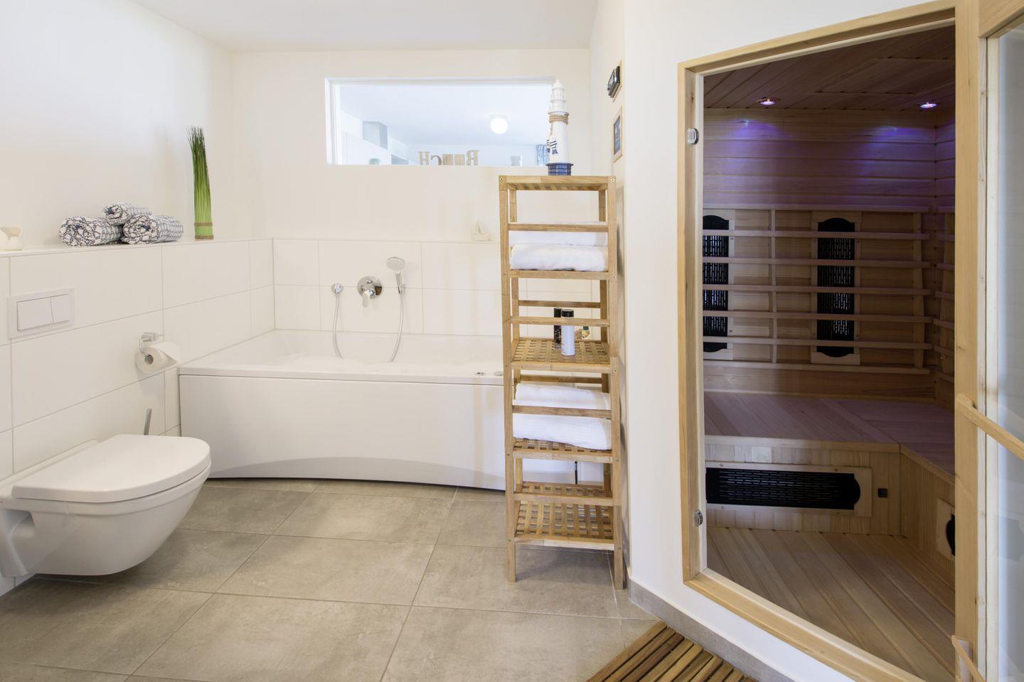 In den kalten Monaten kannst Du Dich nach einem erfrischenden Spaziergang in der Infrarot-Sauna aufwärmen und in der Whirlpool-Badewanne regenerieren. Eine separate Dusche rundet das Wellness-Angebot ab, sodass Du Dich rundum verwöhnt fühlen kannst.