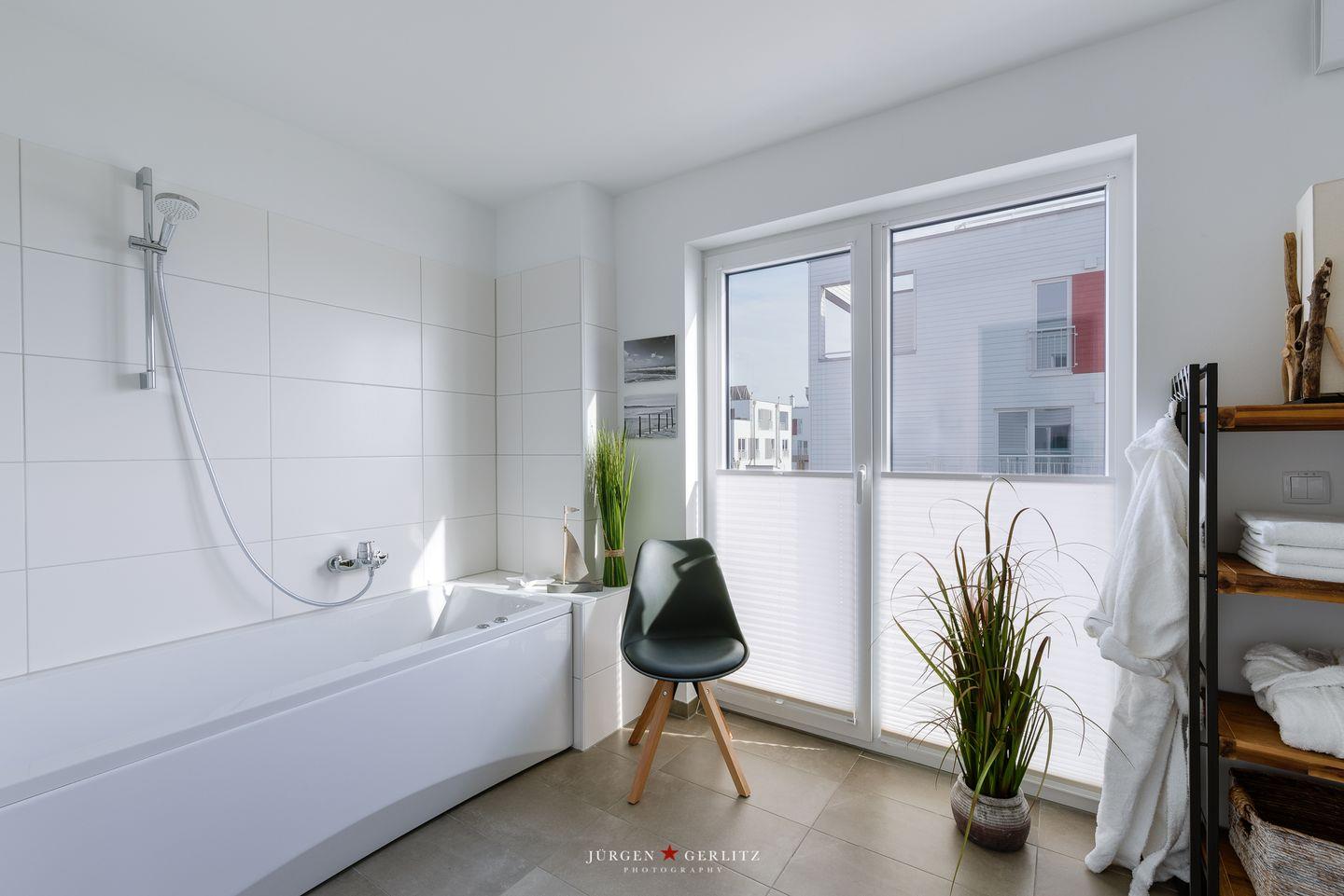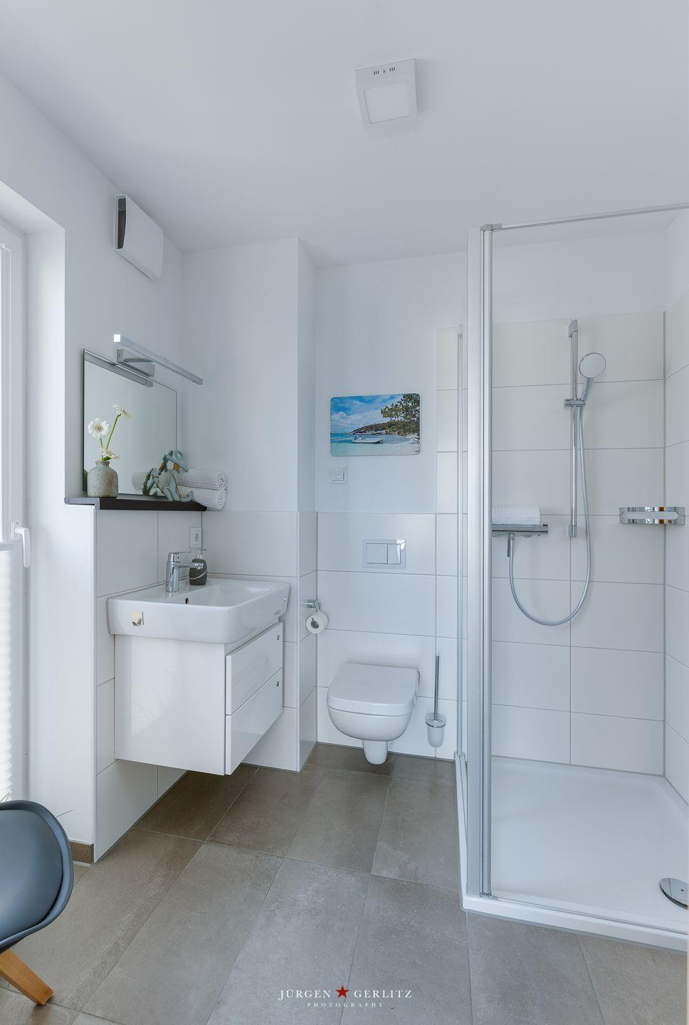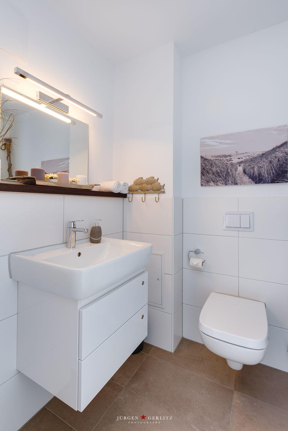 Auf jeder Schlafebene befindet sich ein Badezimmer. Im Erdgeschoss steht Dir außerdem ein Gäste-WC mit Waschmaschine, Trockner und Arbeitsplatte zur Verfügung. Fußbodenheizung, Kaminofen und ein privater Wellnessbereich mit finnischer Sauna sorgen insbesondere in der kalten Jahreszeit für wohlige Wärme und entspannte Stunden nach ausgedehnten Spaziergängen.