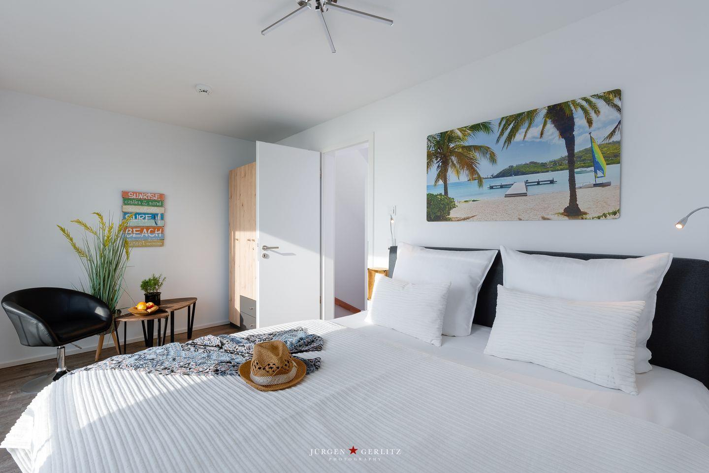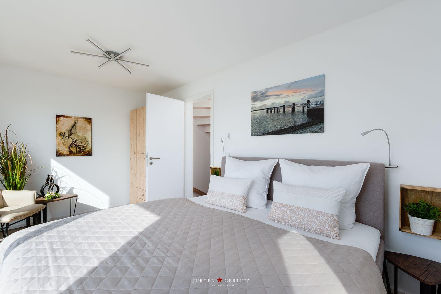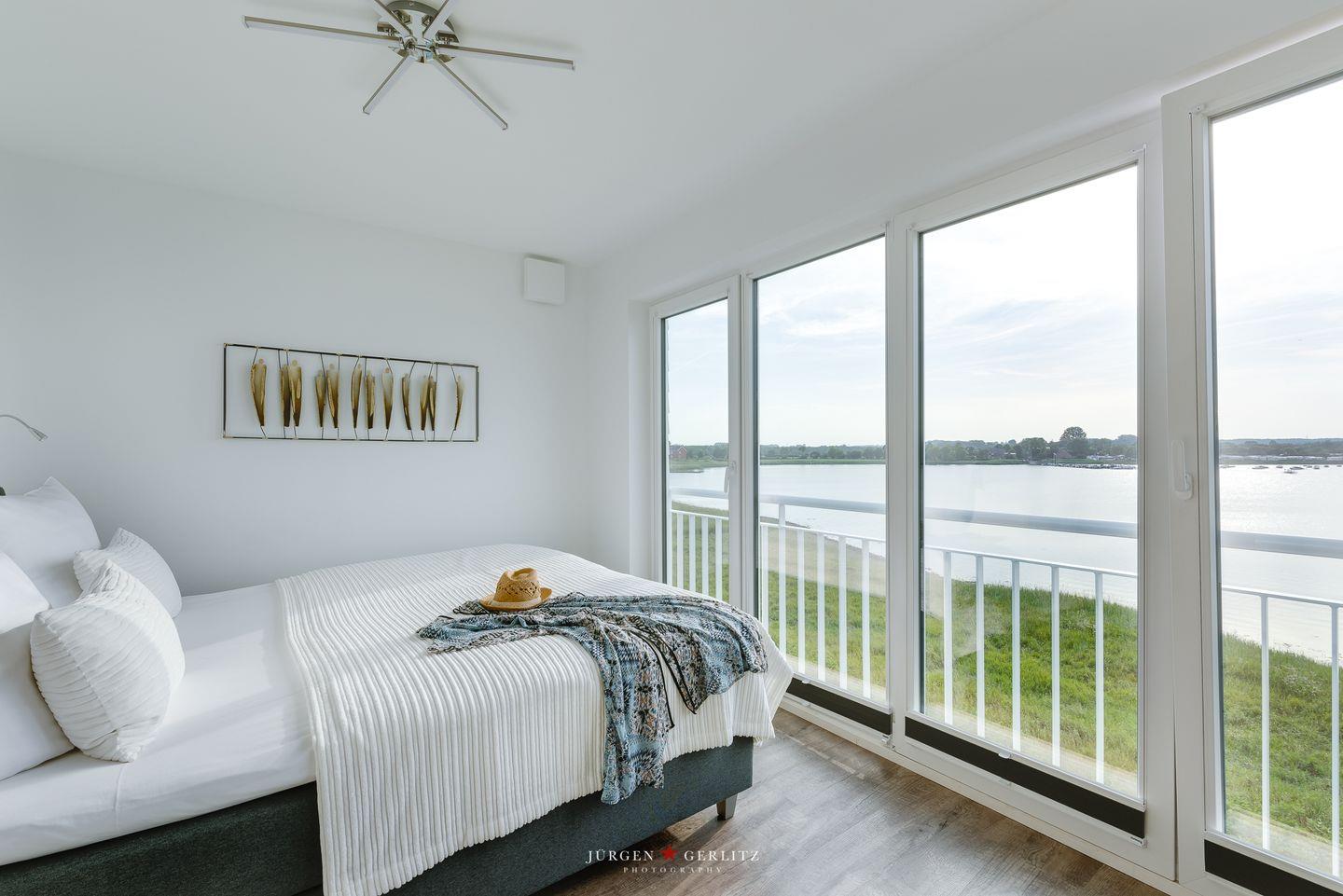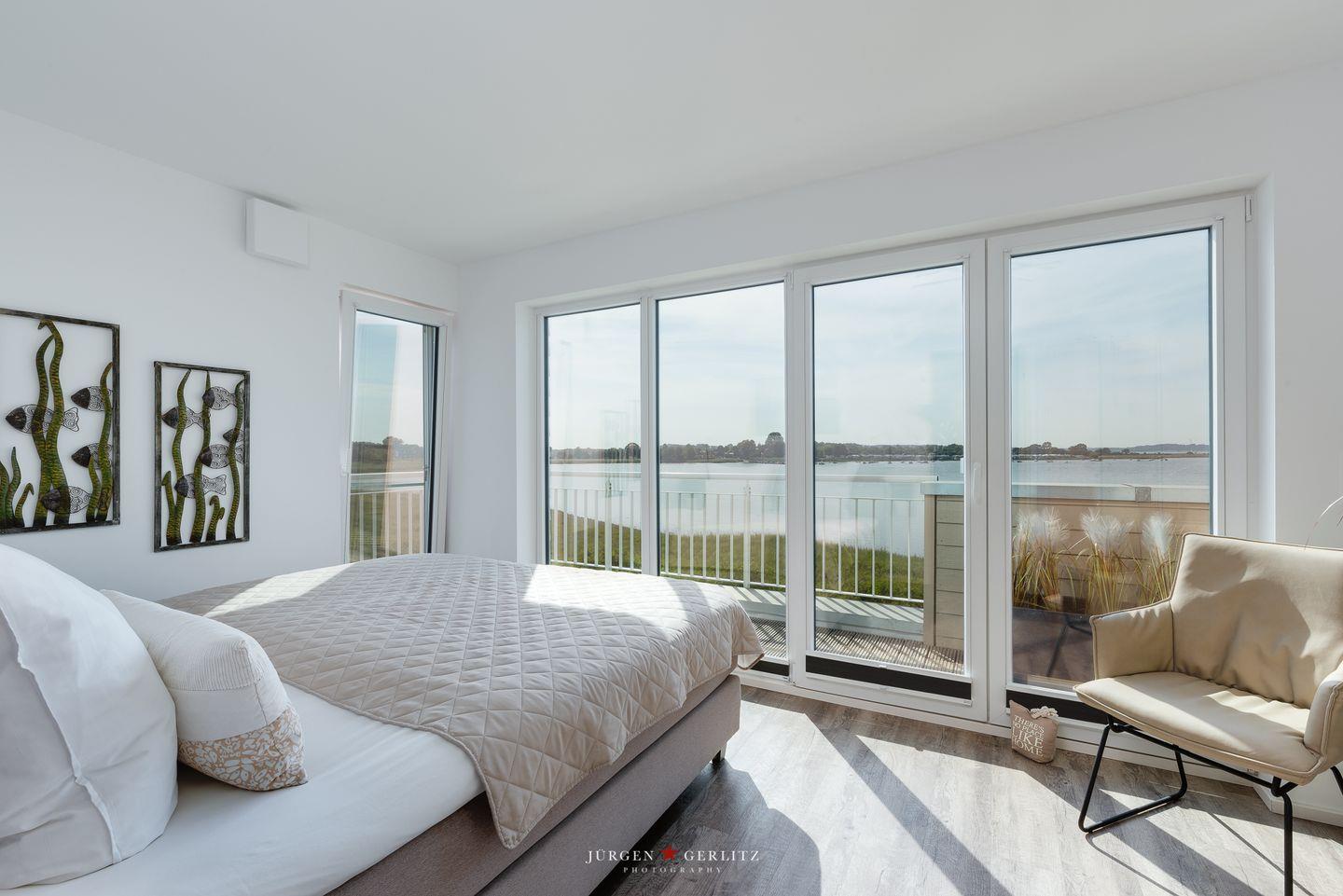 „Emmas Home“ verfügt über drei Schlafzimmer, die jeweils mit einem Boxspringbett ausgestattet sind. Alle Schlafzimmer besitzen bodentiefe Fenster, sodass der traumhafte Wasserblick jederzeit erhalten bleibt, sowie Kleiderschränke und Verdunkelungsplissees. Eines der beiden Schlafzimmer im ersten Obergeschoss bietet einen direkten Zugang zur Terrasse, sodass Du direkt nach dem Aufstehen die Natur und die frische Ostseeluft genießen kannst. Das andere Schlafzimmer ist zusätzlich mit einem zweiten TV und einem Schreibtisch ausgestattet.