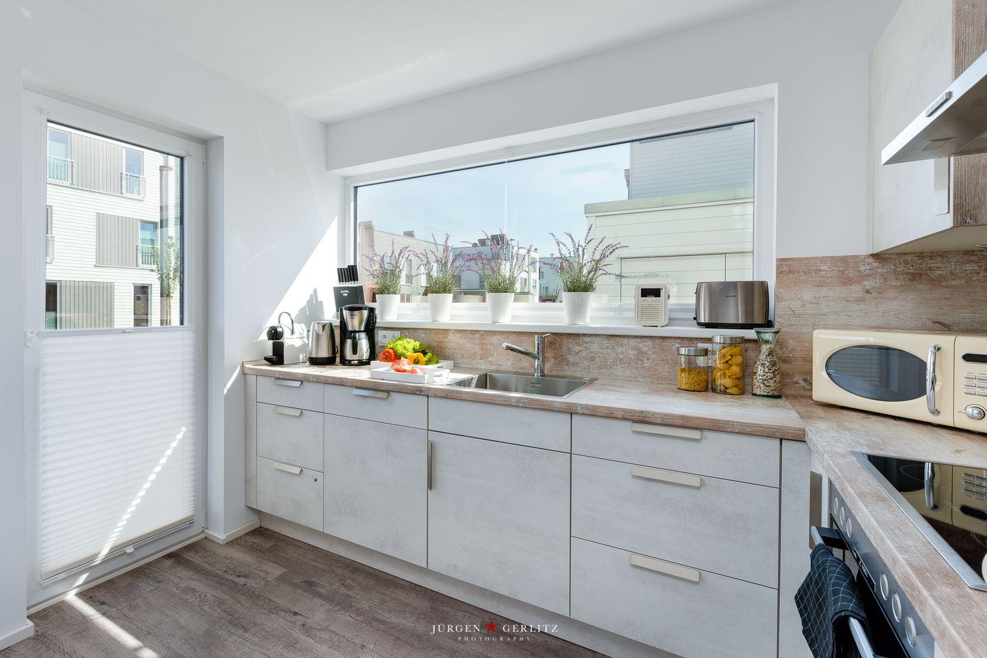 Die gesamte Einrichtung ist stilvoll und hochwertig. Die Wohnküche bietet Dir alles, um einen gemeinsamen Kochabend zu veranstalten. Alternativ kannst Du in geselliger Runde an dem großen Holztisch einen schönen Spieleabend verbringen. Ein Thermomix erleichtert und versüßt Dir das Kochen im Urlaub.