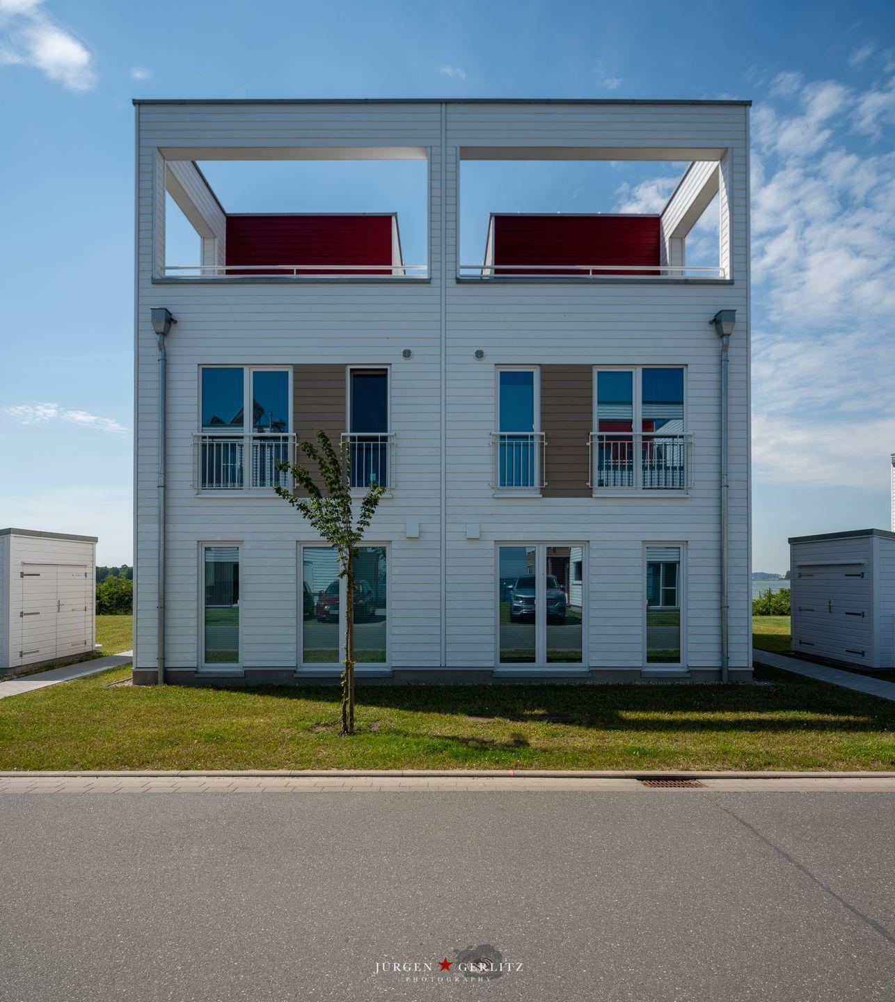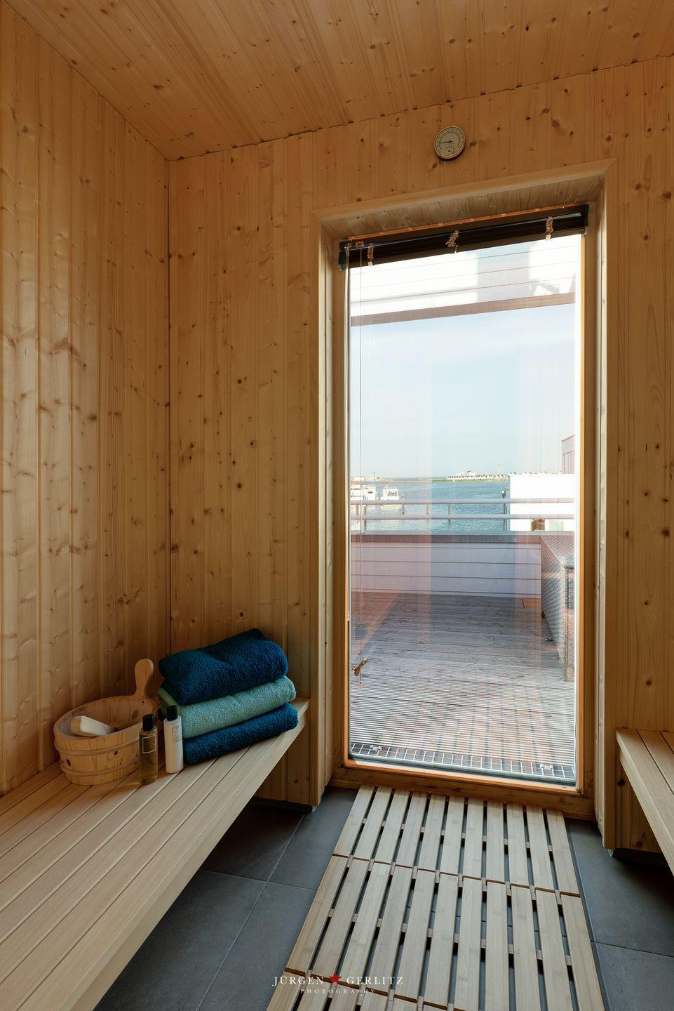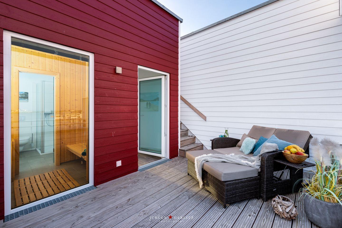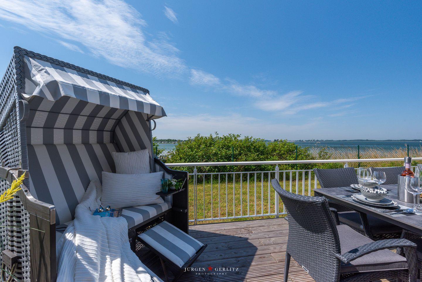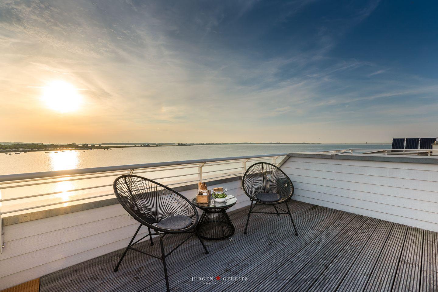 Auf jeder Wohnebene befindet sich eine Terrasse mit einem atemberaubenden Blick auf das Wasser der Schlei, nach Maasholm, auf die Ostsee und den Hafen des Resorts. Hier kannst Du im Strandkorb Deinen Kaffee trinken, bei einem gemeinsamen Barbecue zusammensitzen, Sonnenuntergänge in der Loungeecke auf der Dachterrasse genießen oder es Dir auf dem Lounge-Daybed gemütlich machen und das Hafentreiben beobachten.