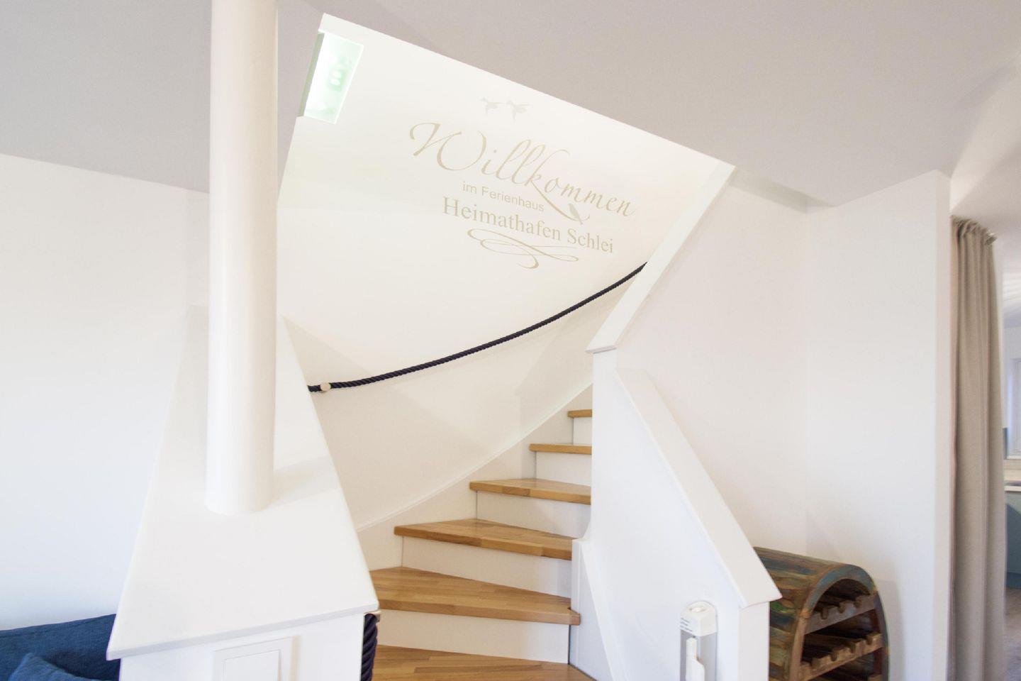 Nach Betreten befindest Du Dich im lichtdurchfluteten Wohn- und Essbereich, der modern und exklusiv eingerichtet ist. Dank der bodentiefen Panoramafenster genießt Du einen atemberaubenden Ausblick über die Schleimündung und die Ostsee. Auch der Kamin trägt zu einer angenehmen Wohlfühlatmosphäre bei.