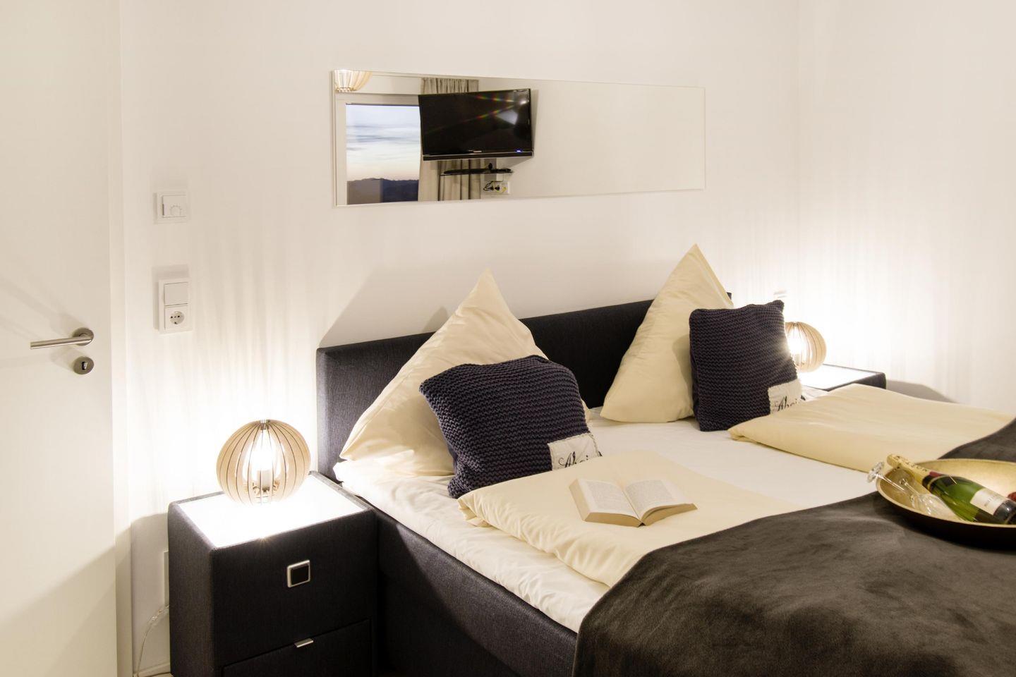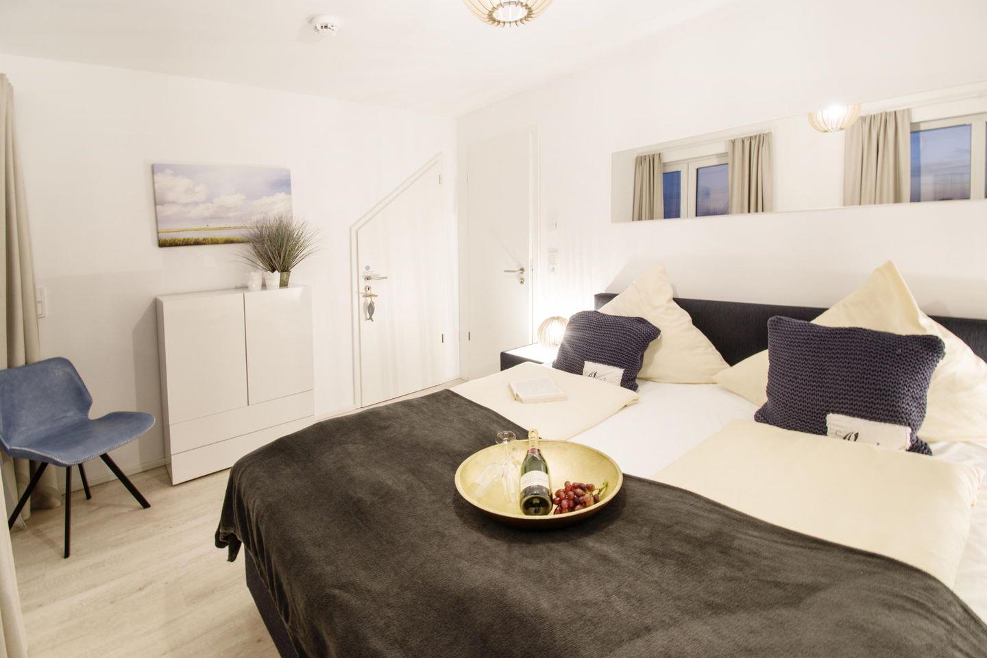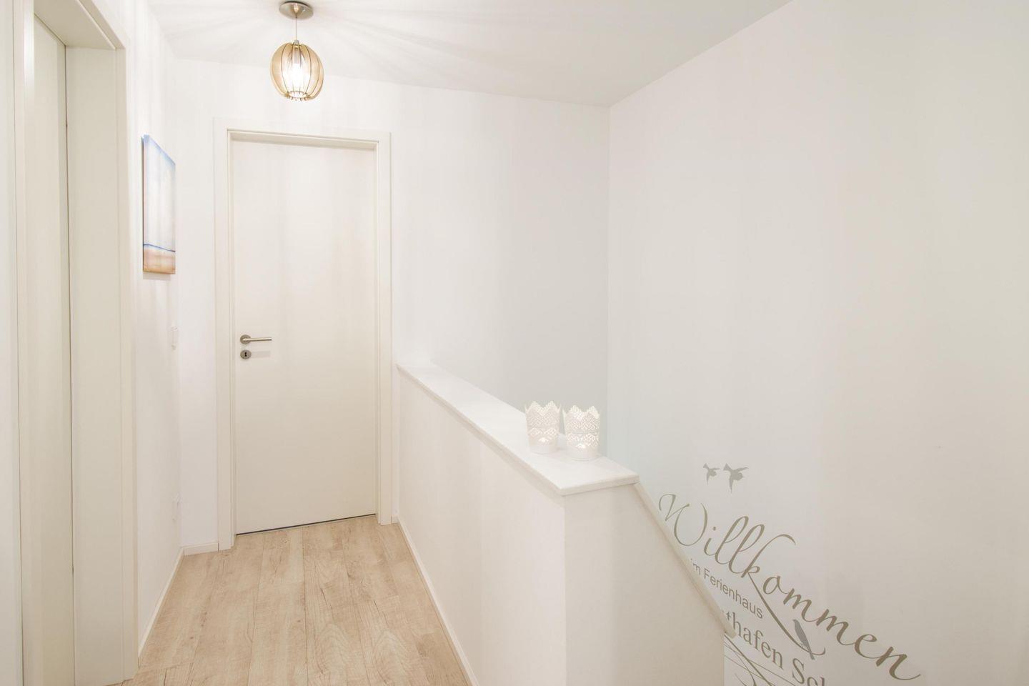 Vom Wohnzimmer aus führt eine Treppe in das 1. Obergeschoss. Hier befinden sich die beiden Schlafzimmer, die jeweils mit einem gemütlichen Boxspringbett ausgestattet sind.