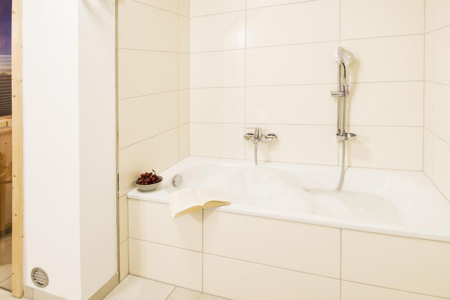Das große Wellnessbad mit eigener finnischer Sauna ist ein absolutes Highlight. Mit Blick auf den Hafen des Resorts kannst Du hier wunderbar vom Alltagsstress abschalten.