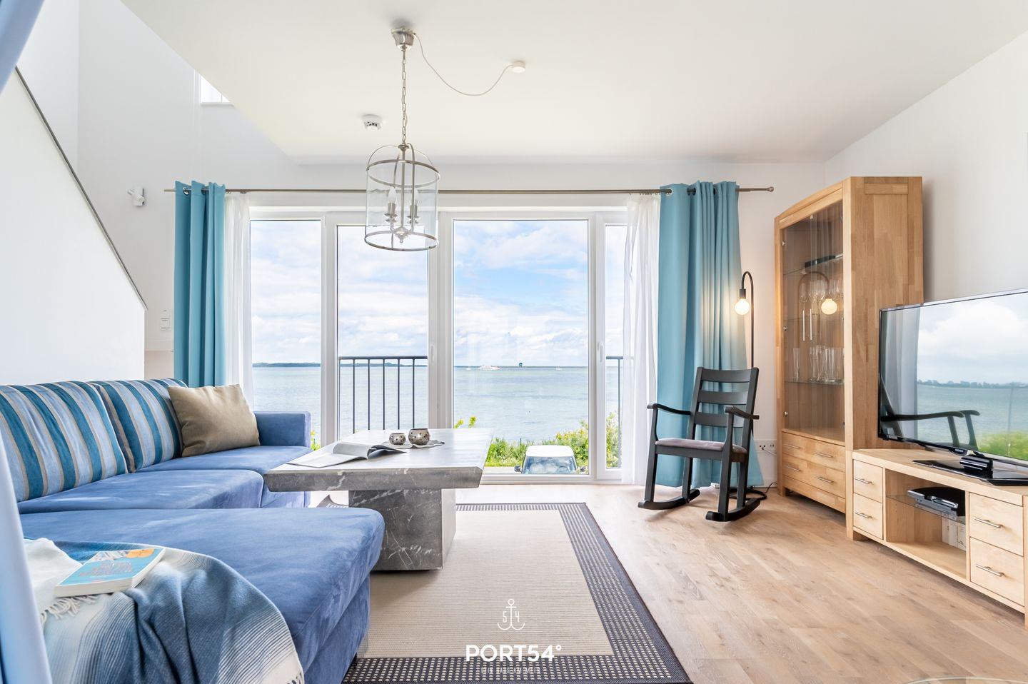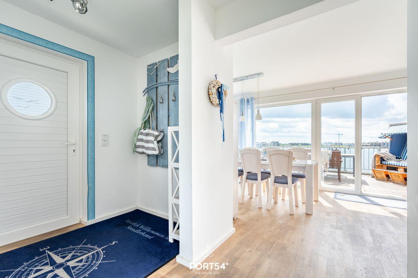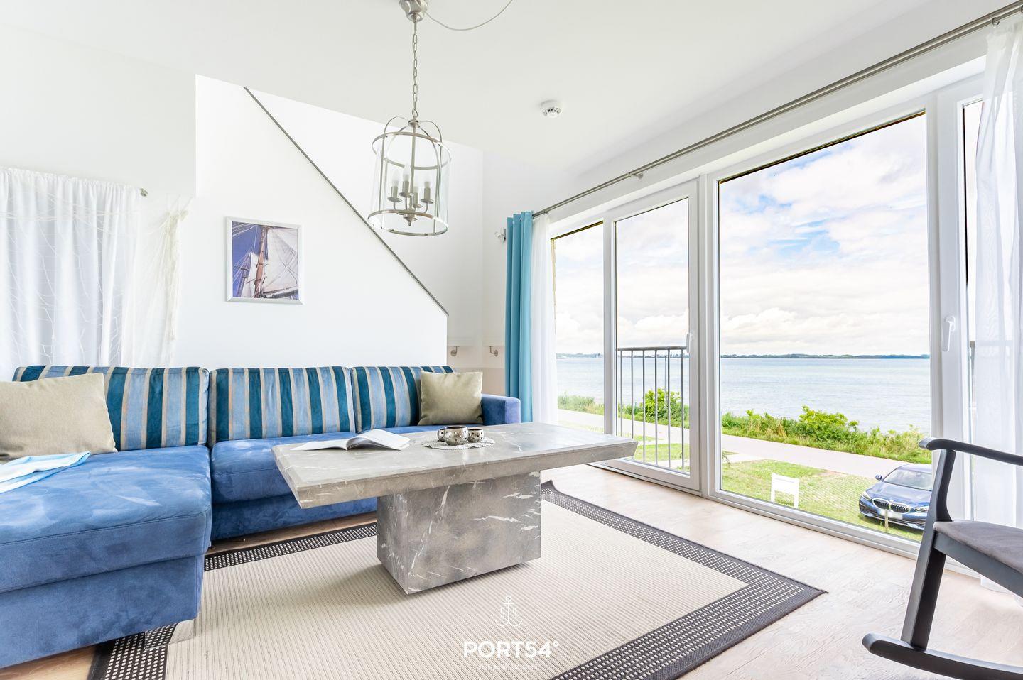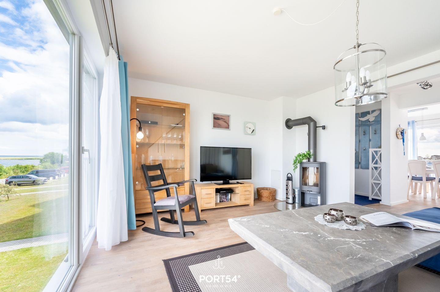 Der Essbereich der Wohnung erstrahlt in wunderbarem Tageslicht, das durch die großzügigen Panoramafenster strömt. Auf dem angrenzenden Balkon mit Blick auf den Hafen von Olpenitz kannst Du köstliche Speisen aus der voll ausgestatteten Küche oder vom Grill genießen. Der Wohnbereich lädt Dich mit einem einladenden Kamin zum Entspannen ein und ist ideal für gemütliche Abende nach ausgedehnten Spaziergängen. Die Fußbodenheizung sowie die behagliche Einrichtung sorgen zusätzlich für hohen Wohnkomfort. Ein modernes Duschbad rundet das Angebot im Erdgeschoss ab.