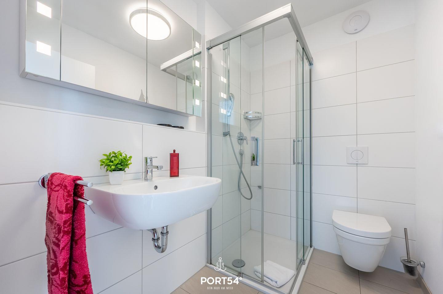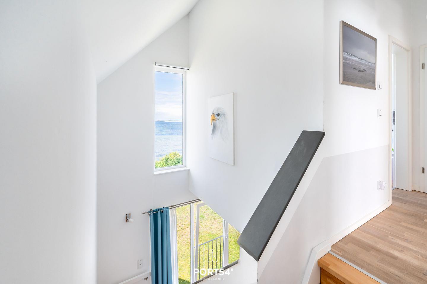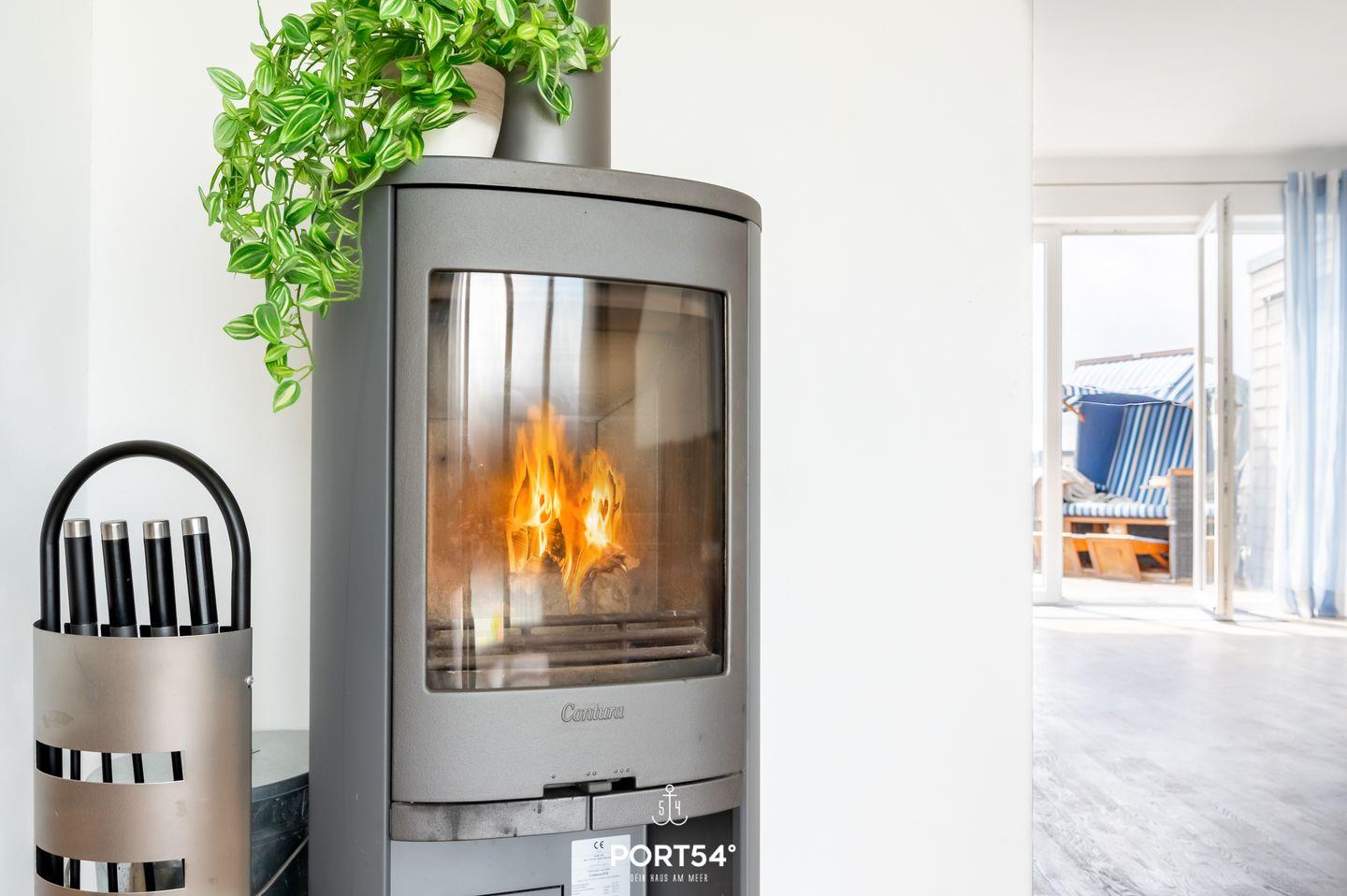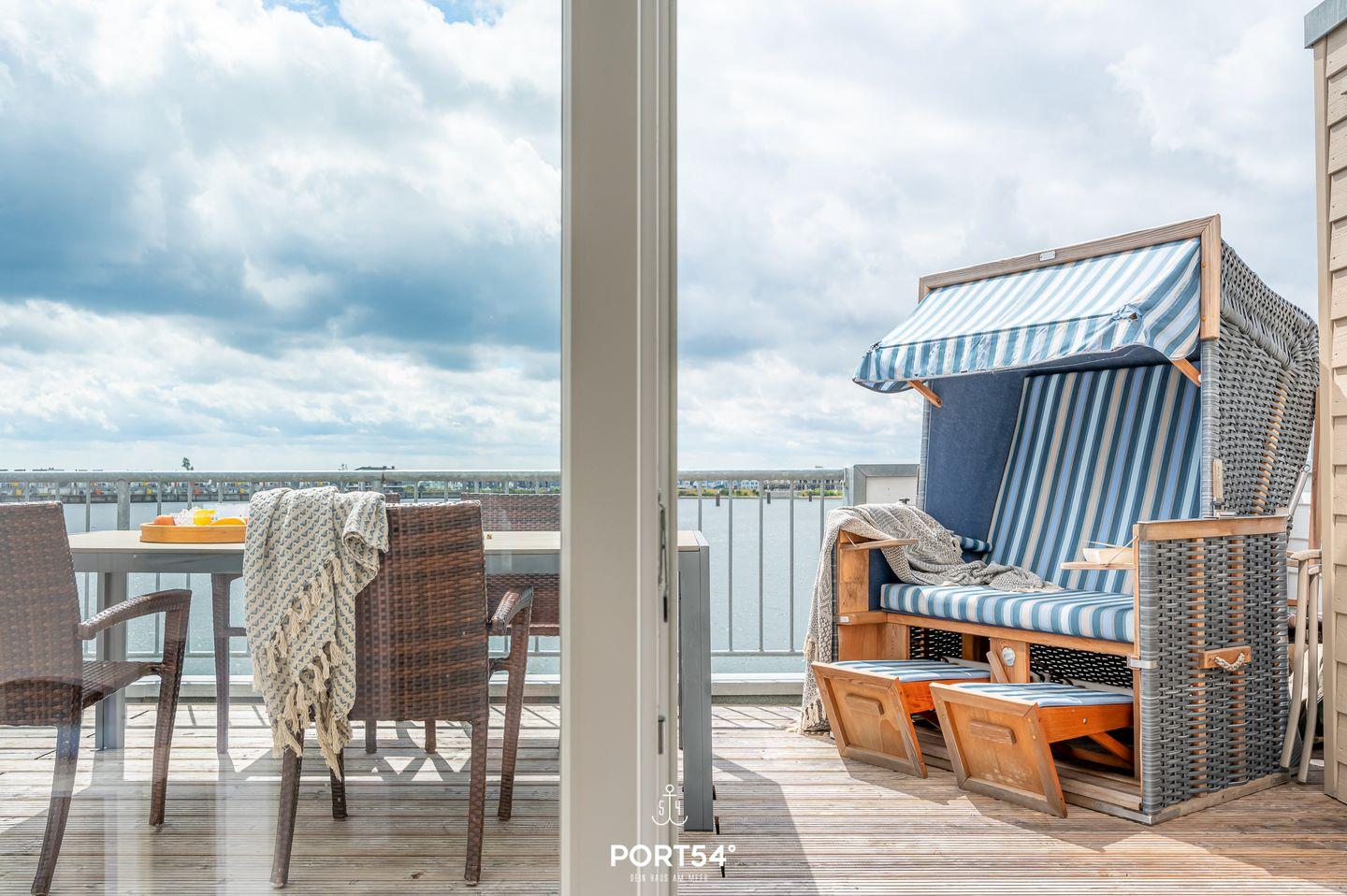 Der Essbereich der Wohnung erstrahlt in wunderbarem Tageslicht, das durch die großzügigen Panoramafenster strömt. Auf dem angrenzenden Balkon mit Blick auf den Hafen von Olpenitz kannst Du köstliche Speisen aus der voll ausgestatteten Küche oder vom Grill genießen. Der Wohnbereich lädt Dich mit einem einladenden Kamin zum Entspannen ein und ist ideal für gemütliche Abende nach ausgedehnten Spaziergängen. Die Fußbodenheizung sowie die behagliche Einrichtung sorgen zusätzlich für hohen Wohnkomfort. Ein modernes Duschbad rundet das Angebot im Erdgeschoss ab.
