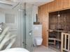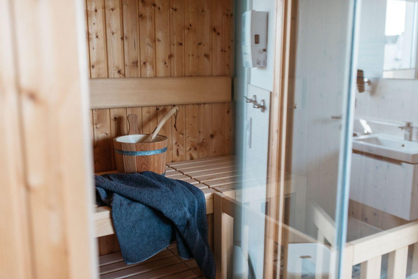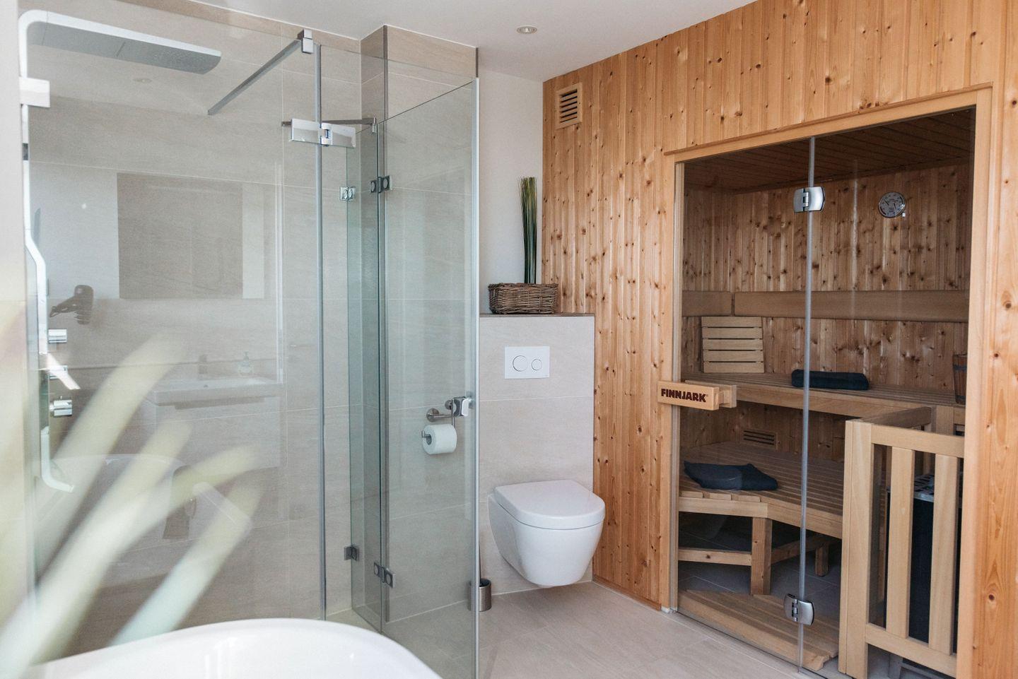 Das helle Badezimmer bietet eine Duo-Badewanne, ebenerdige Erlebnisdusche mit einem Regenduschkopf und eine finnische Sauna für Wellness-Begeisterte. Mit der Fußbodenheizung ist auch in kalten Jahreszeiten für wohlige Wärme gesorgt.