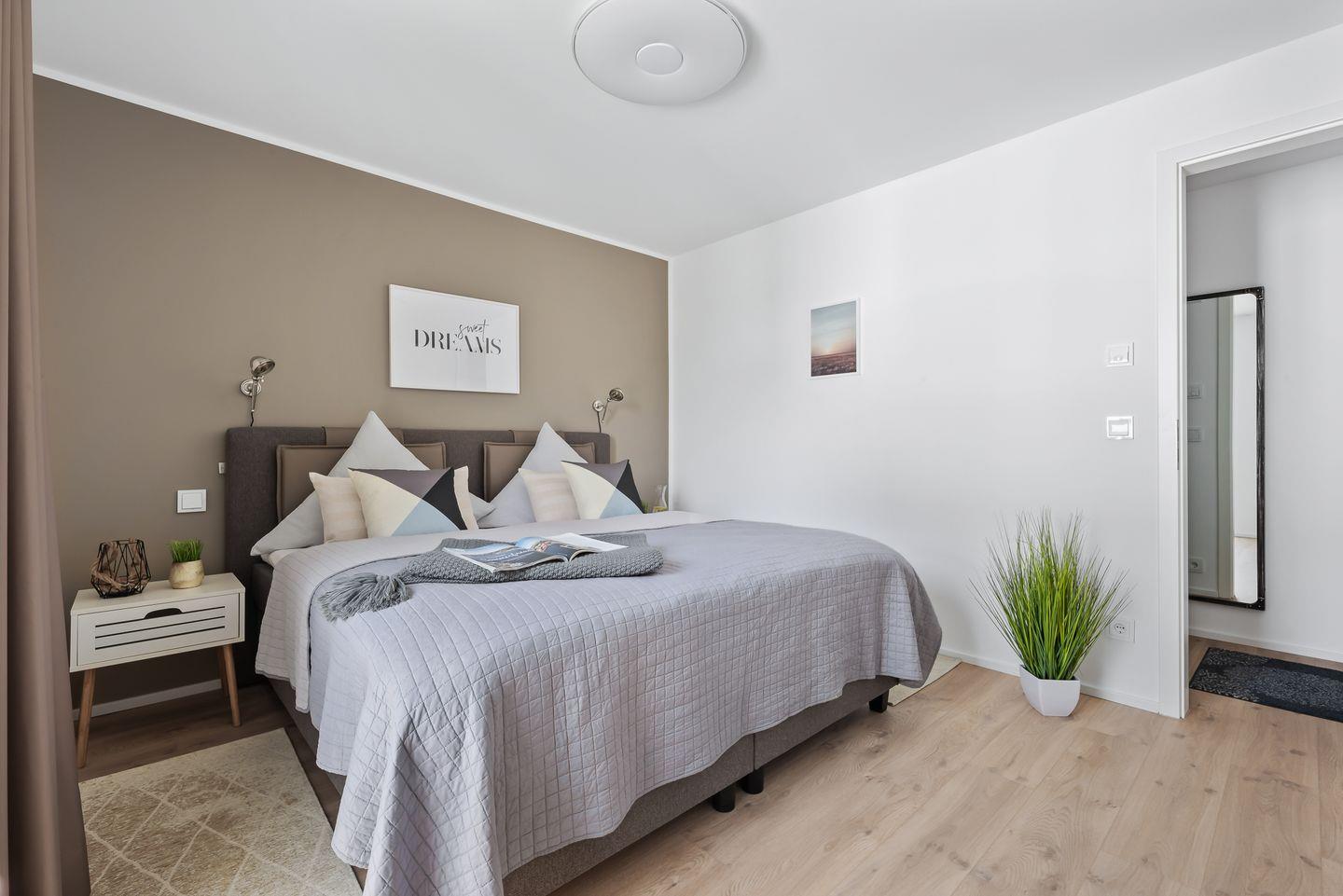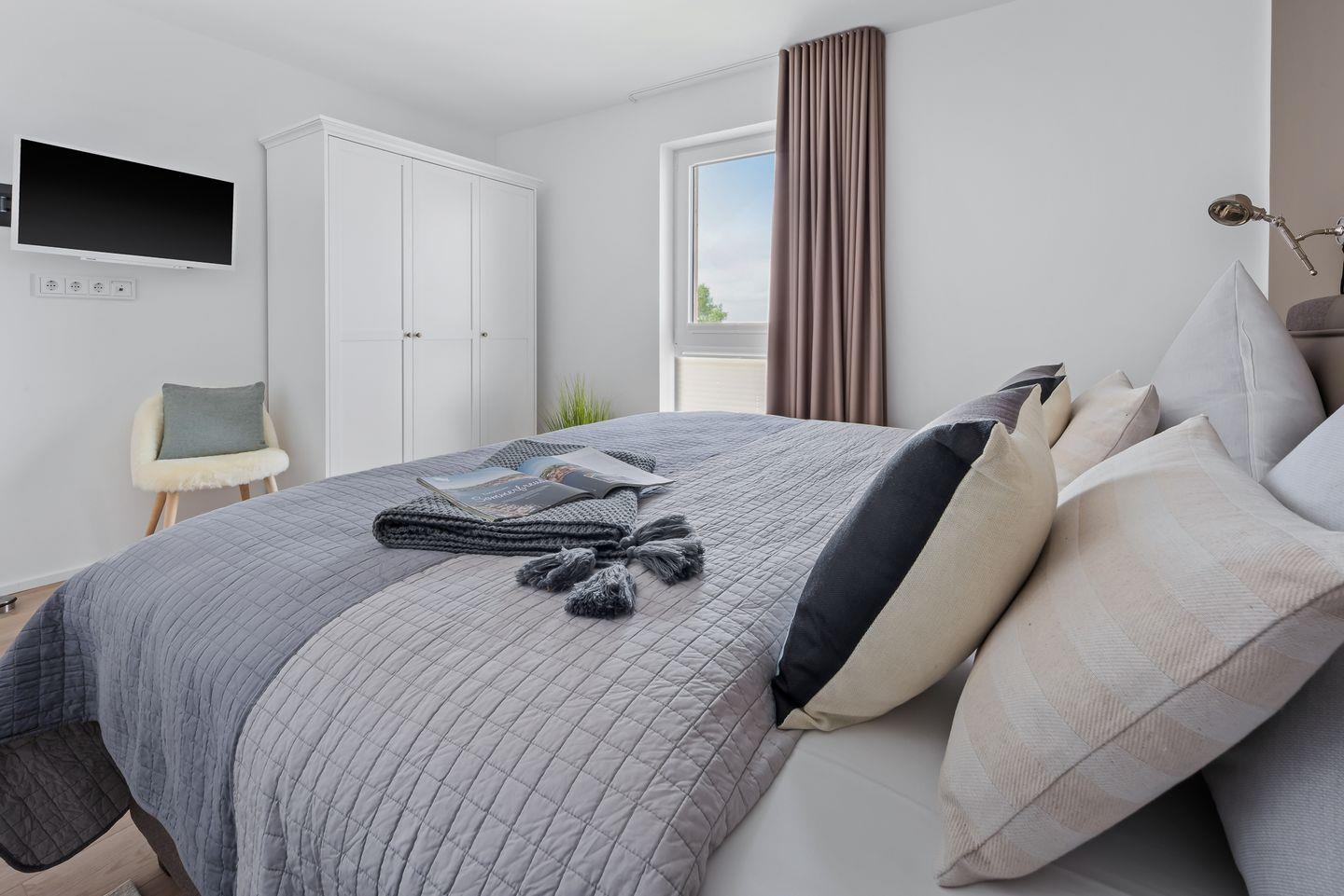 Im Schlafzimmer erwarten Dich ein komfortables Doppelbett (180 × 200 cm) sowie zusätzlich ein TV.