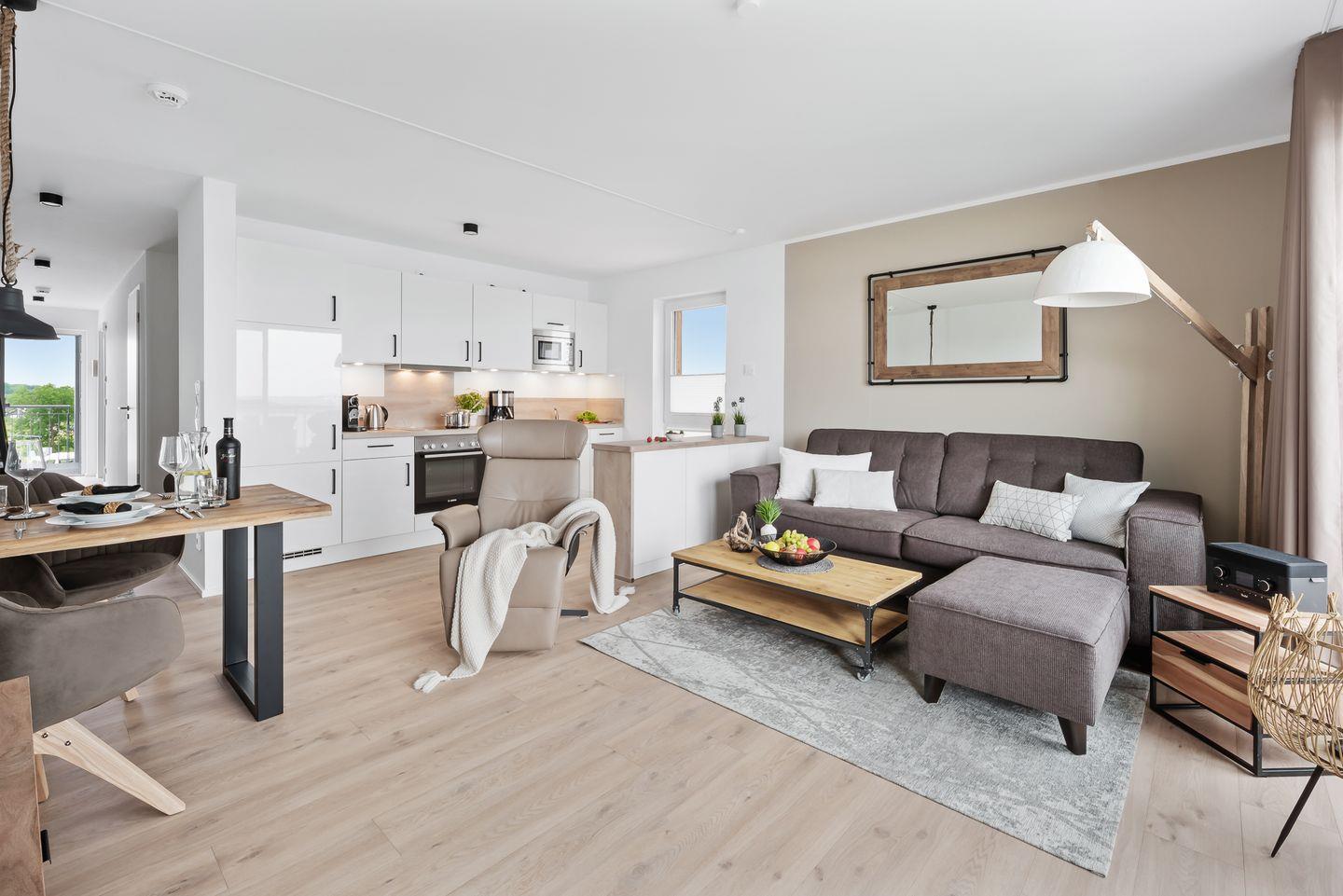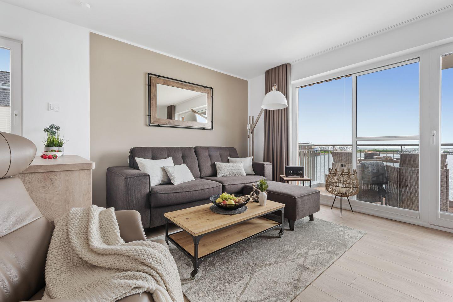 Ganz gleich, ob Du Essen in der Küche zubereitest, am Tisch die Mahlzeit einnimmst oder auf dem bequemen Sofa entspannst – durch die bodentiefen Fenster hast Du immer den traumhaften Blick auf HAFEN & MEER.