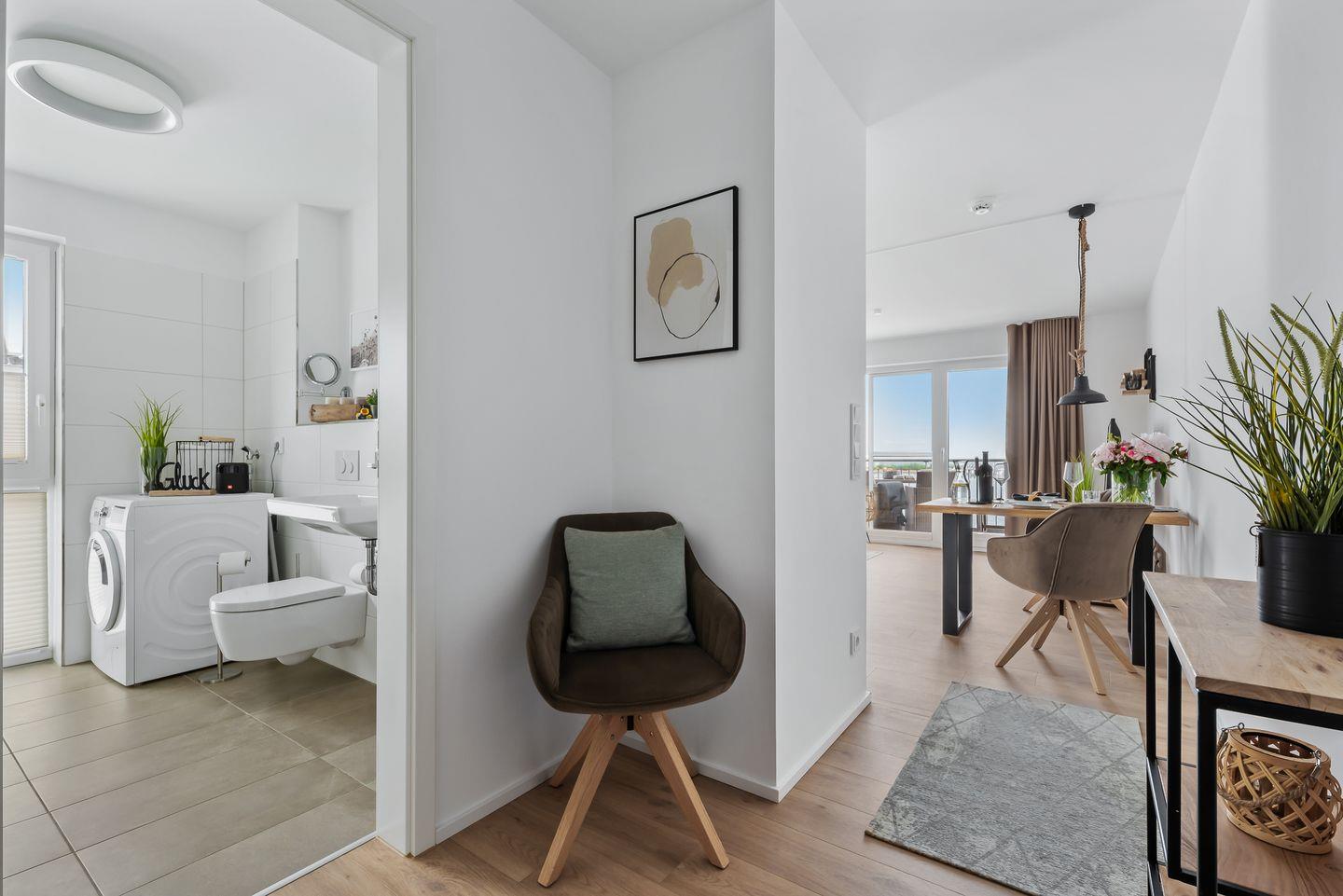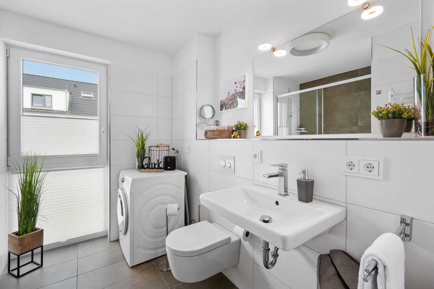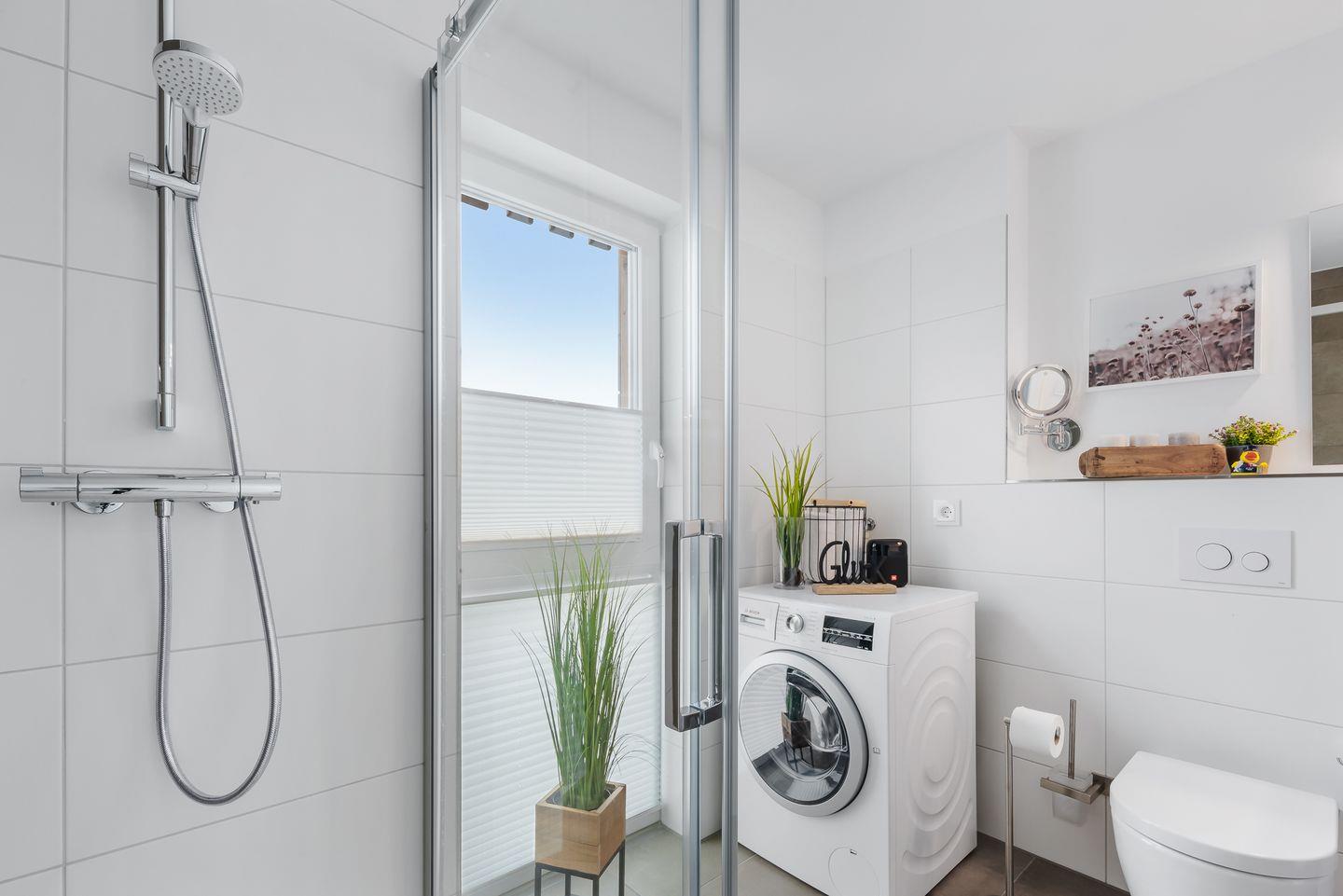 Aufgrund der exklusiven Lage bietet die Wohnung ein Tageslichtbad, das nicht nur mit einer bodengleichen Dusche aufwarten kann, sondern auch mit Waschmaschine und Trockner.