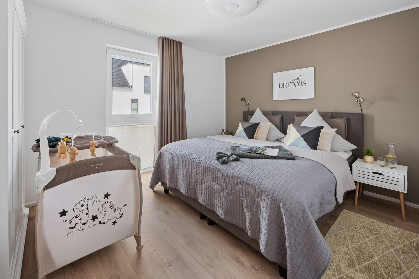 Außerdem bietet das Schlafzimmer ein Babybett mit Wickelmöglichkeit.