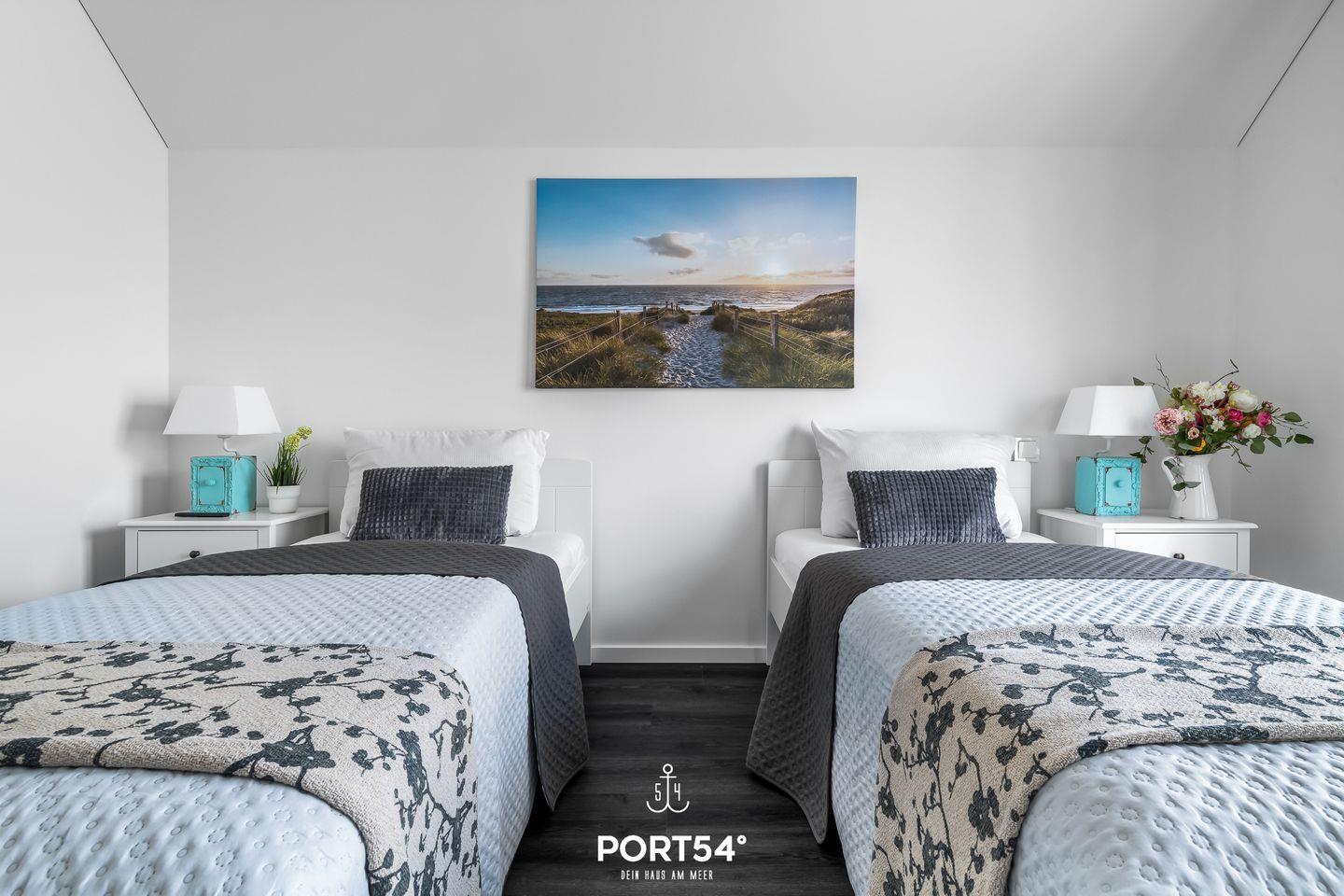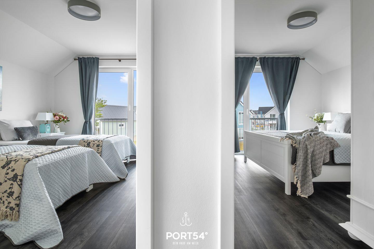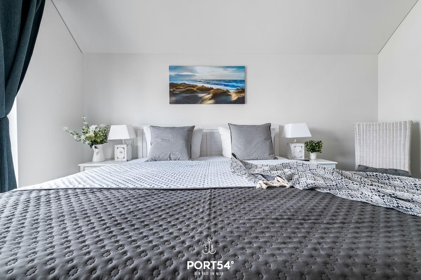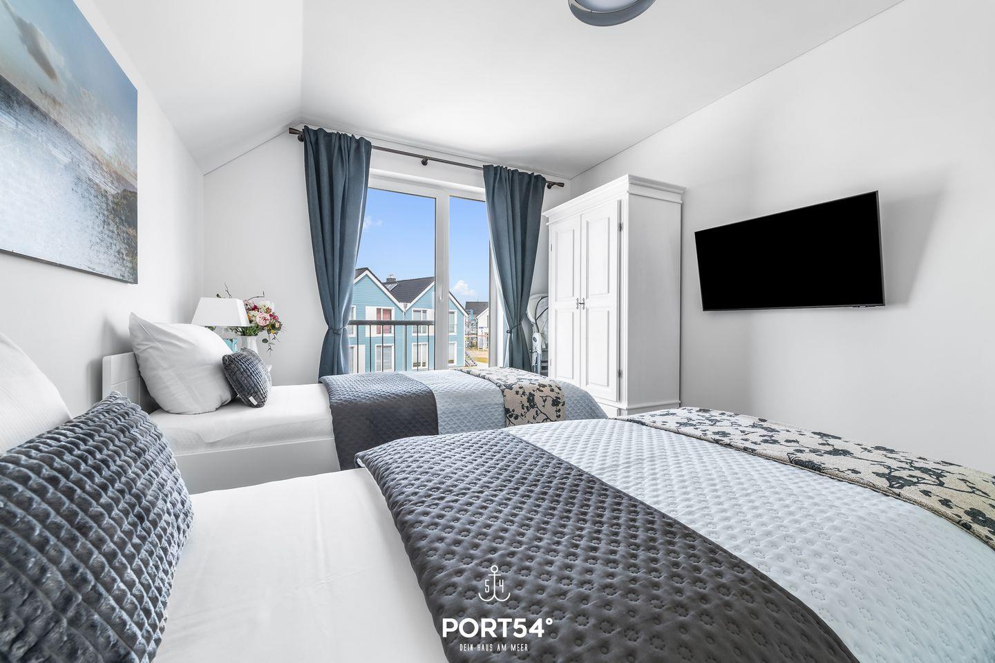 Dir stehen zwei Schlafzimmer zur Verfügung, eines mit einem Doppelbett (180 × 200 cm) und eines mit zwei Einzelbetten (90 × 200 cm). Für erholsame Nächte sorgen die Verdunklungsmöglichkeiten vor den Fenstern, sodass Ausschlafen garantiert ist. Wenn Du danach noch liegen bleiben möchtest, kannst Du entspannt vom Bett aus fernsehen.