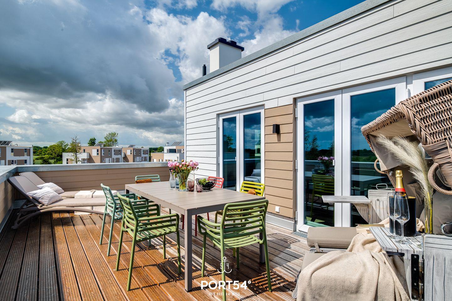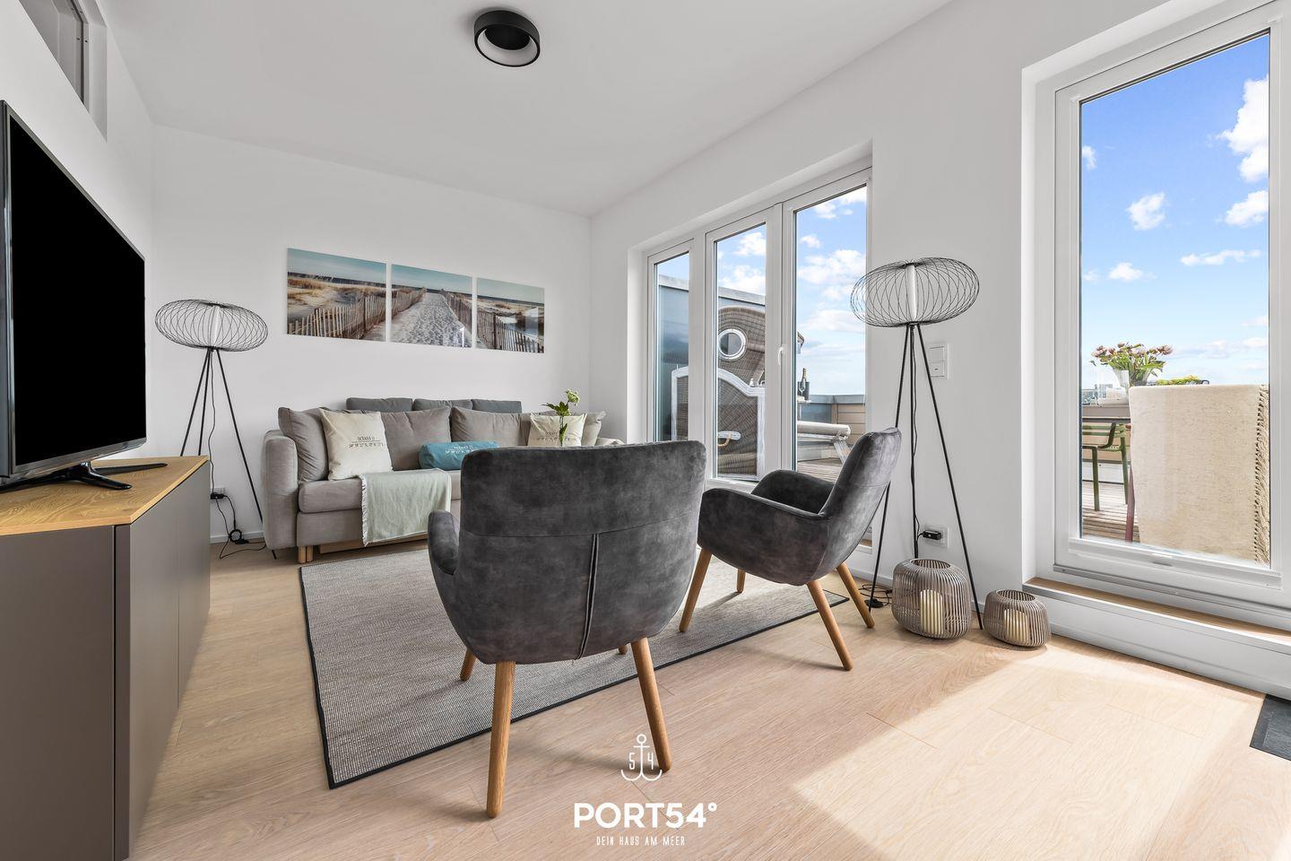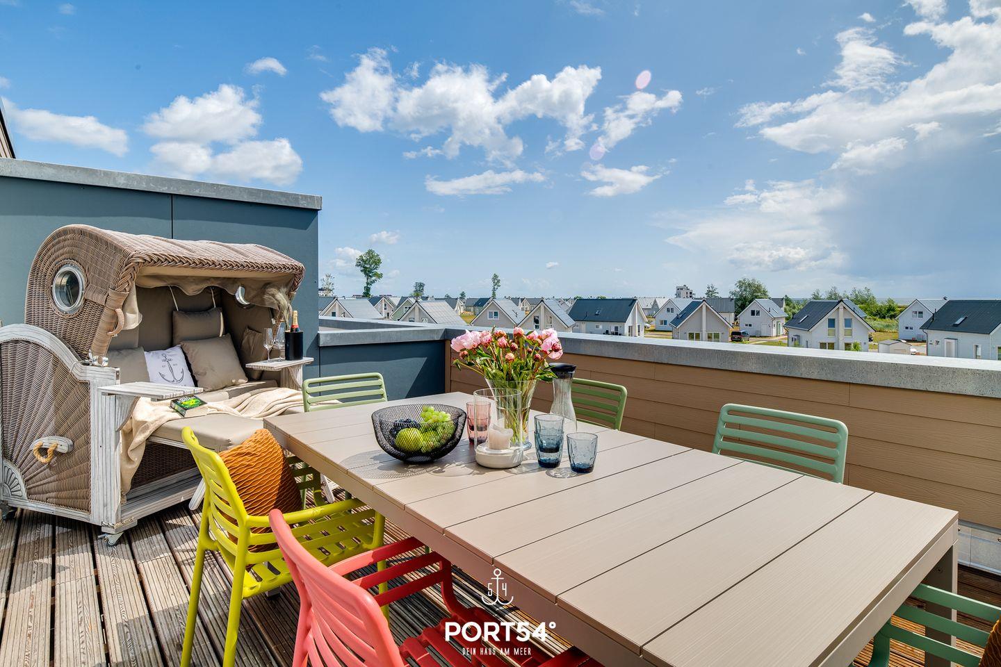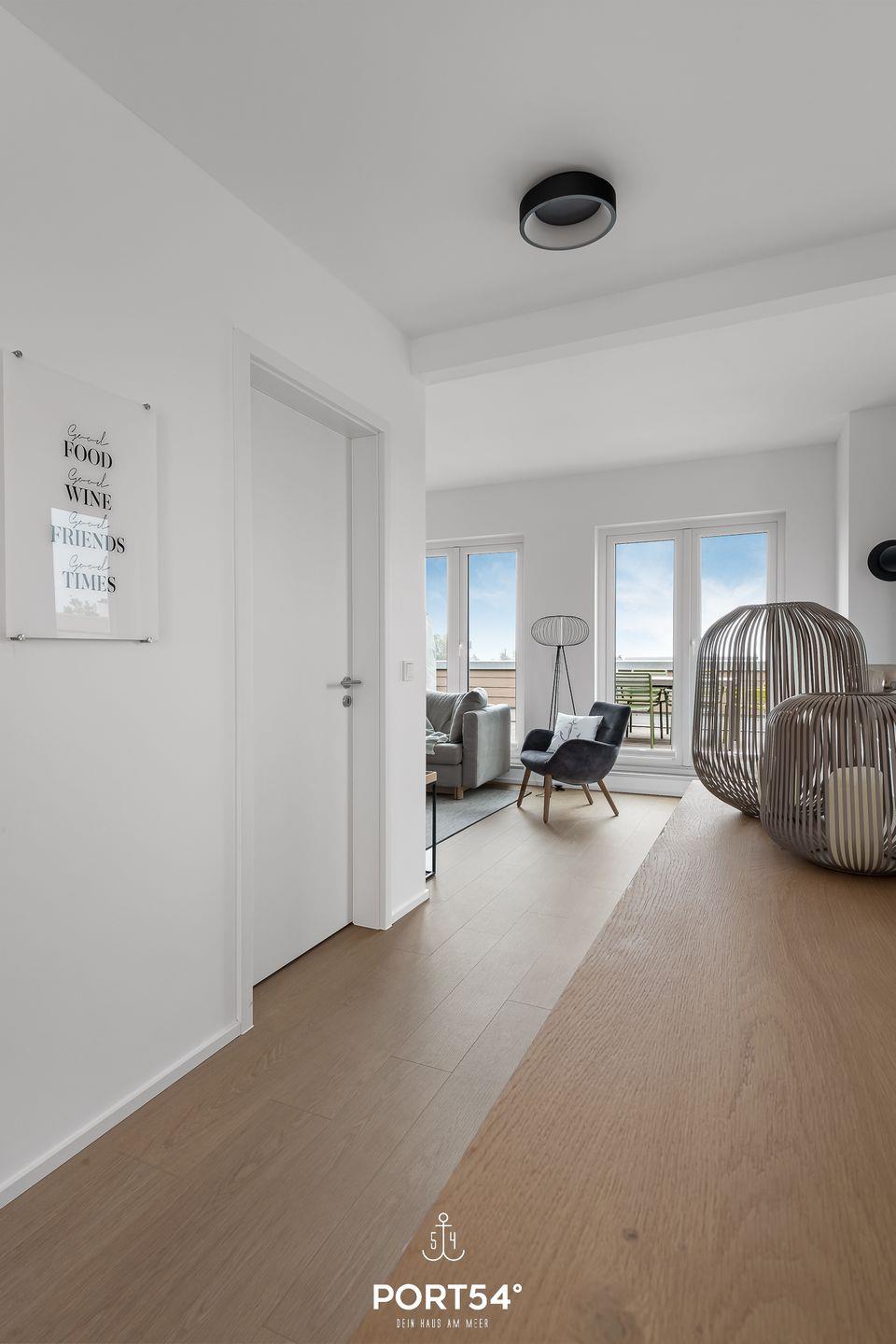 Über die breite Fensterfront des Wohnzimmers gelangst Du auf das Highlight der Wohnung – den knapp 30 m² großen Balkon. Dort laden ein Esstisch für acht Personen, ein Strandkorb, zwei Sonnenliegen sowie ein Weber-Elektrogrill zu gemütlichen Stunden an der Ostseeluft ein. Von hier aus genießt Du einen atemberaubenden Ausblick über die unter Naturschutz stehenden Salzwiesen bis zum Meer. Lehne Dich zurück und genieße die weitläufige Natur.