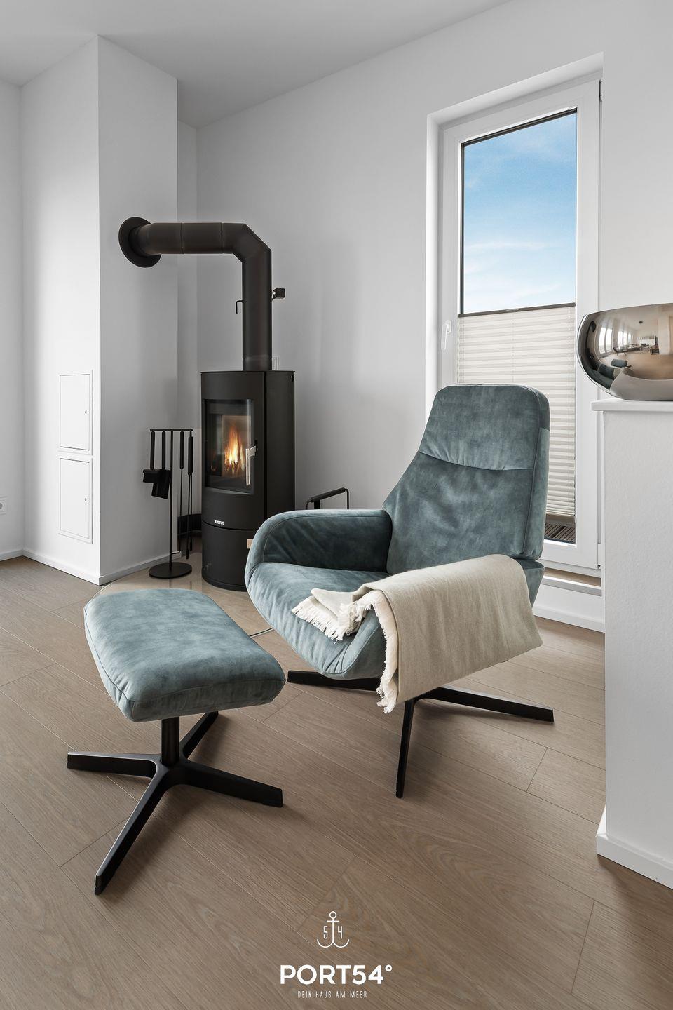 Das lichtdurchflutete Wohnzimmer verfügt über ein vollwertiges Schlafsofa (180 × 200 cm), einen Flachbildfernseher, eine Spielekonsole (Xbox One) sowie einen gemütlichen Kamin.