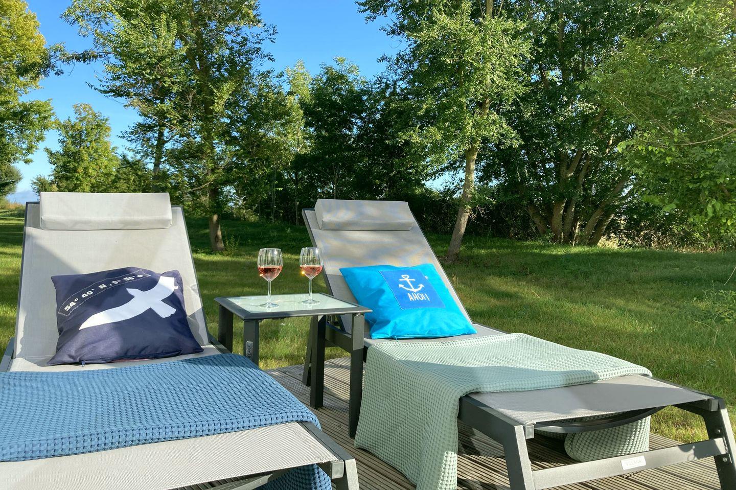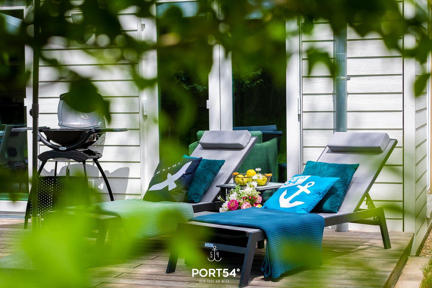 Über den Wohnbereich gelangst Du auf die große, möblierte Terrasse mit Südausrichtung. Hier hast Du einen freien Blick ins Grüne und kannst auf den Liegen und Sitzmöglichkeiten die Sonne genießen und herrlich entspannen. Dank des Elektrogrills lassen sich gesellige Grillabende veranstalten.