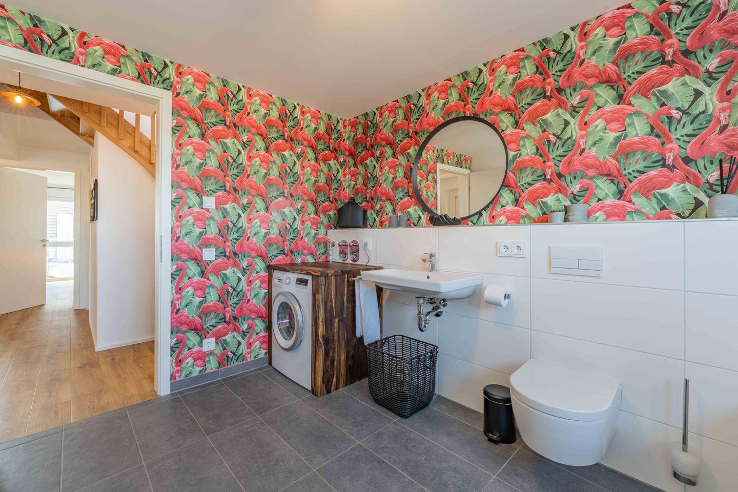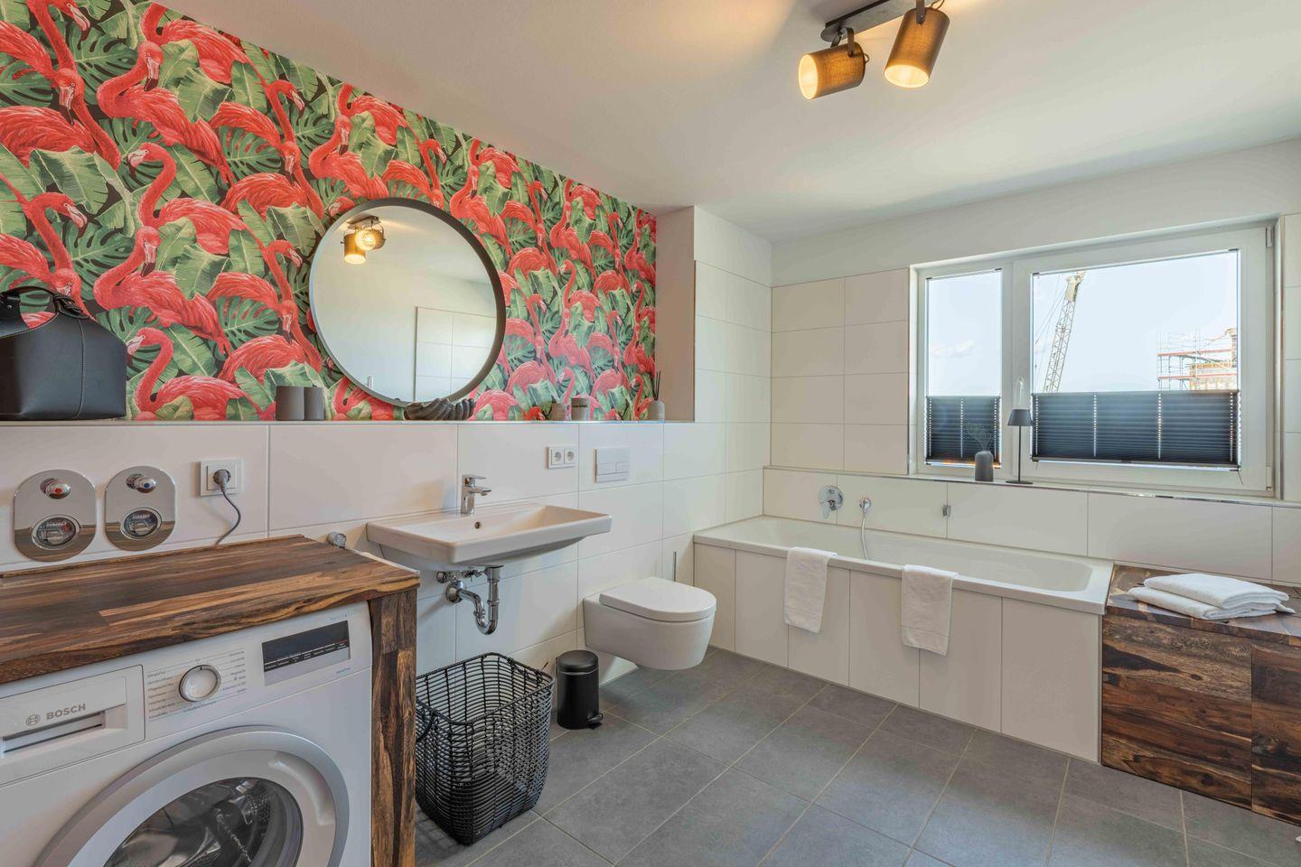 Die Ferienwohnung verfügt über zwei moderne und helle Badezimmer. Das eine Badezimmer bietet Dir eine Infrarot-Sauna, hier kannst Du dem Alltagsstress entfliehen und Dich entspannen, zudem gibt es eine ebenerdige Dusche. Das andere Badezimmer verfügt über eine Badewanne sowie über eine Waschmaschine.