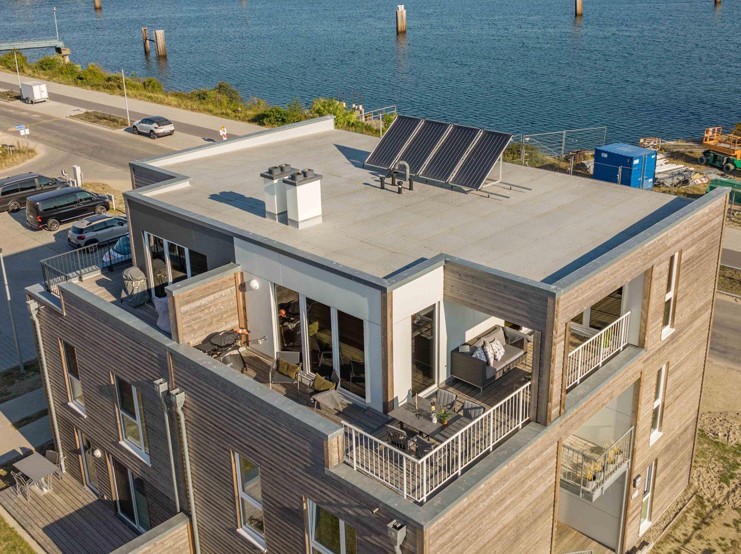 Auf den beiden Balkonen (einer davon teilüberdacht) kannst Du den tollen Ausblick, die frische Ostseeluft und Sonnenuntergänge genießen.