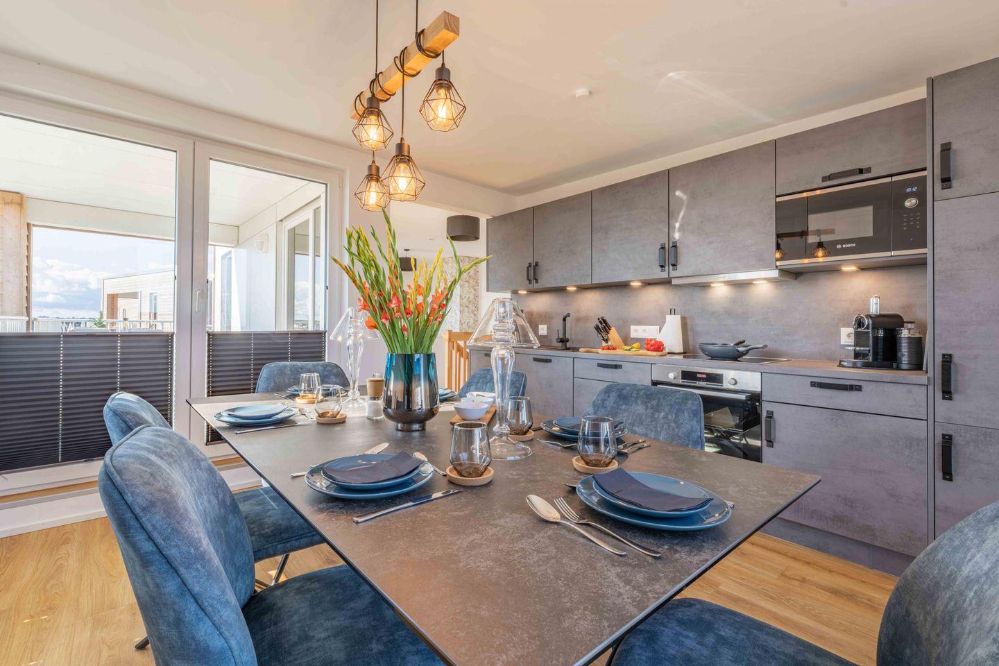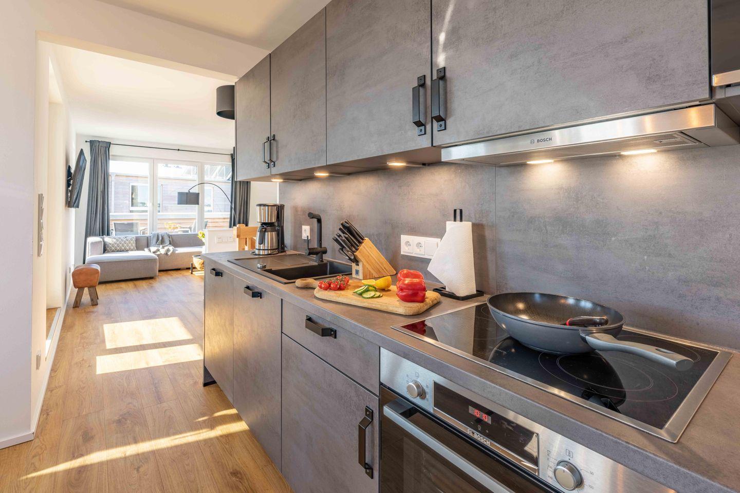 Die offen und modern gehaltene Küche ist hochwertig und voll ausgestattet und verfügt ebenso über einen tollen Ausblick direkt auf den Hafen.