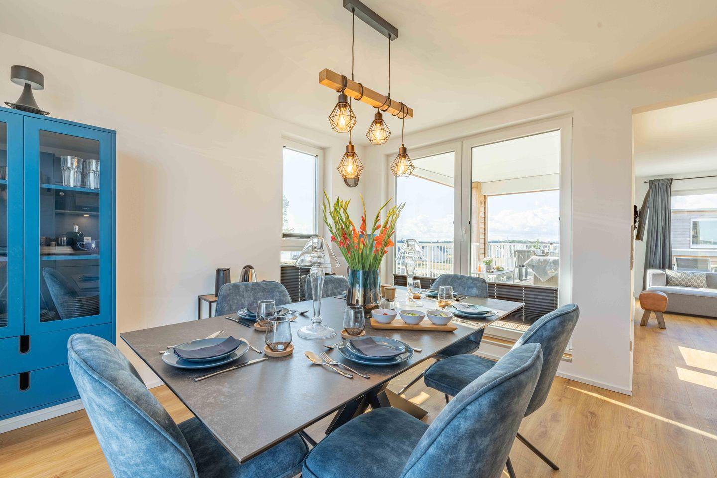Das große, stilvolle Wohn- und Esszimmer verführt Dich mit einem Kamin, einem gemütlichen Sofa & direktem Zugang zur großen Terrasse mit Ostseeblick.
