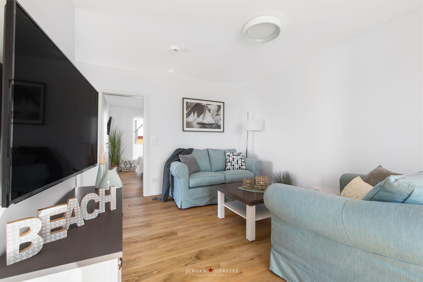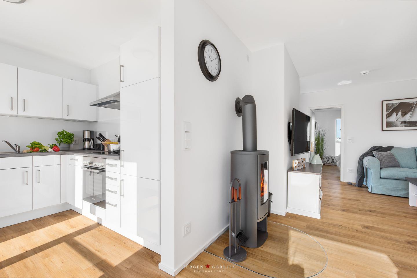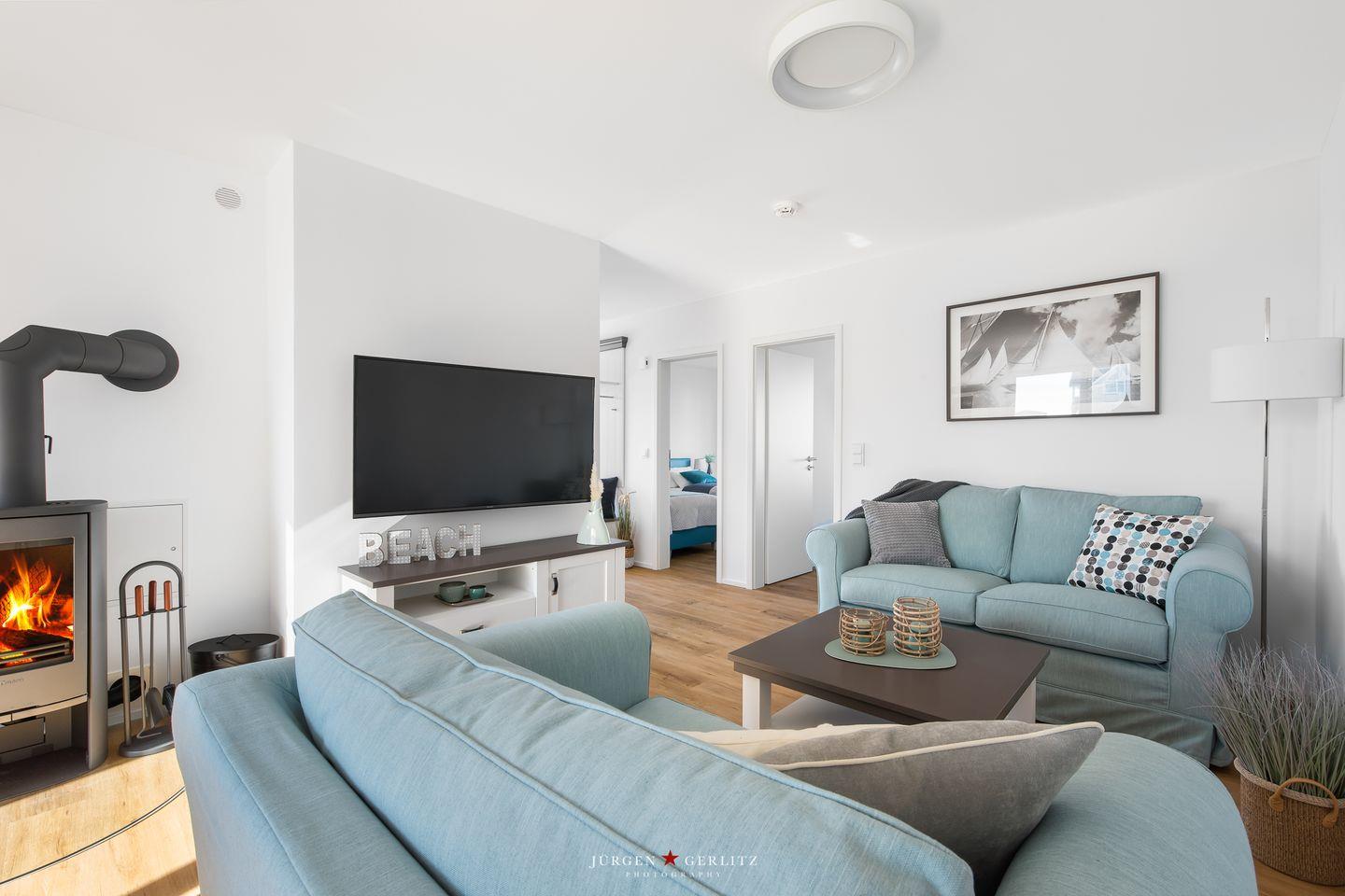 Das Wohnzimmer verfügt über einen Kaminofen und einen Flatscreen-TV (55 Zoll). Hier kannst Du es Dir gemütlich machen und Deinen Urlaub in vollen Zügen genießen.