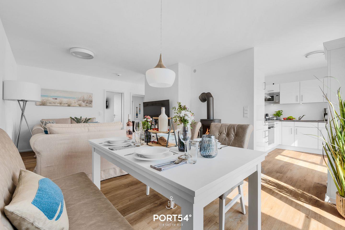 Der große offene Wohnraum mit Kaminofen und Flachbildfernseher (55 Zoll) lädt Dich zu geselligen Abenden ein.