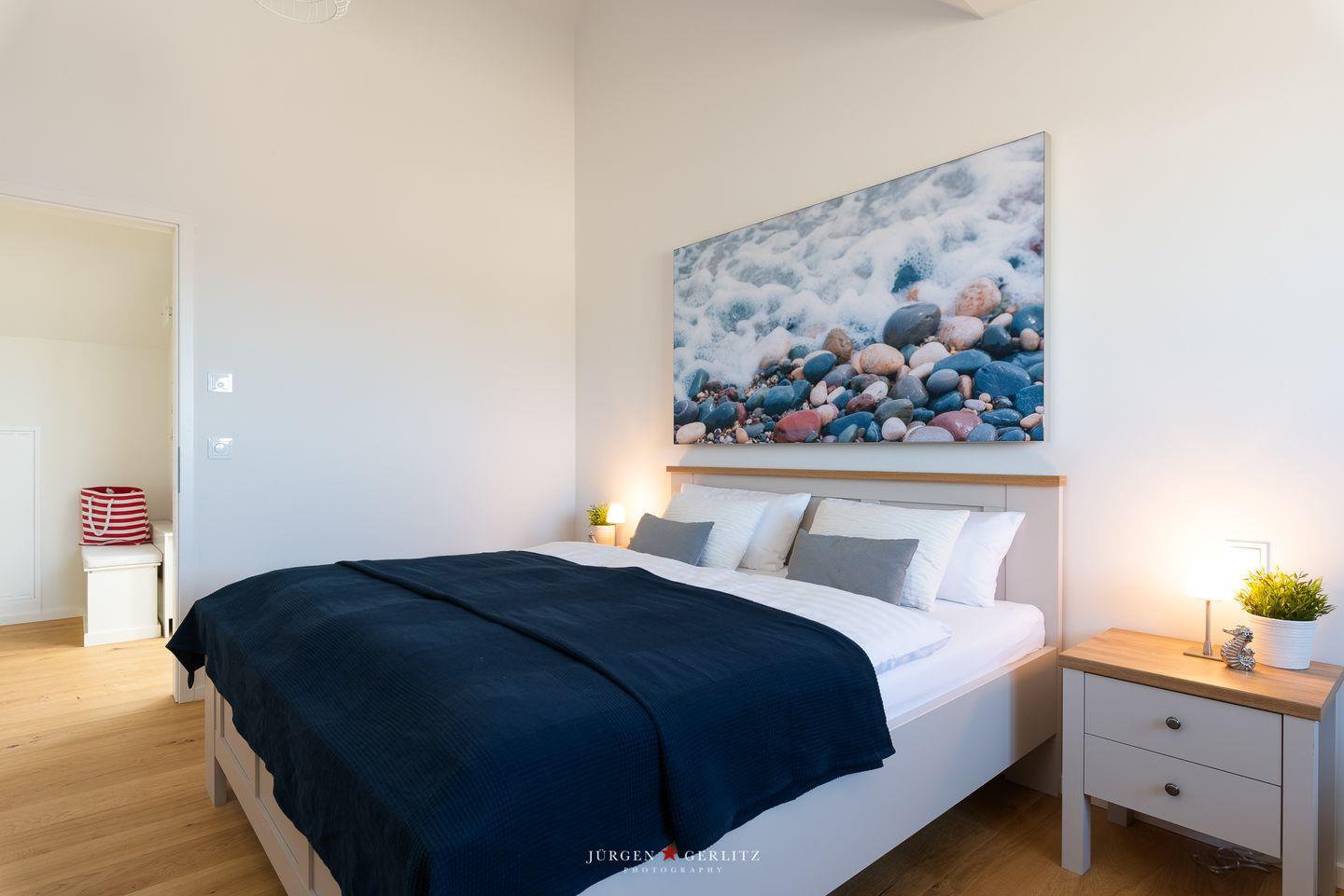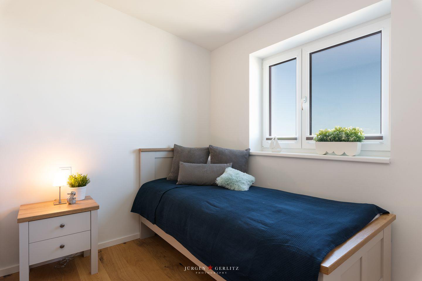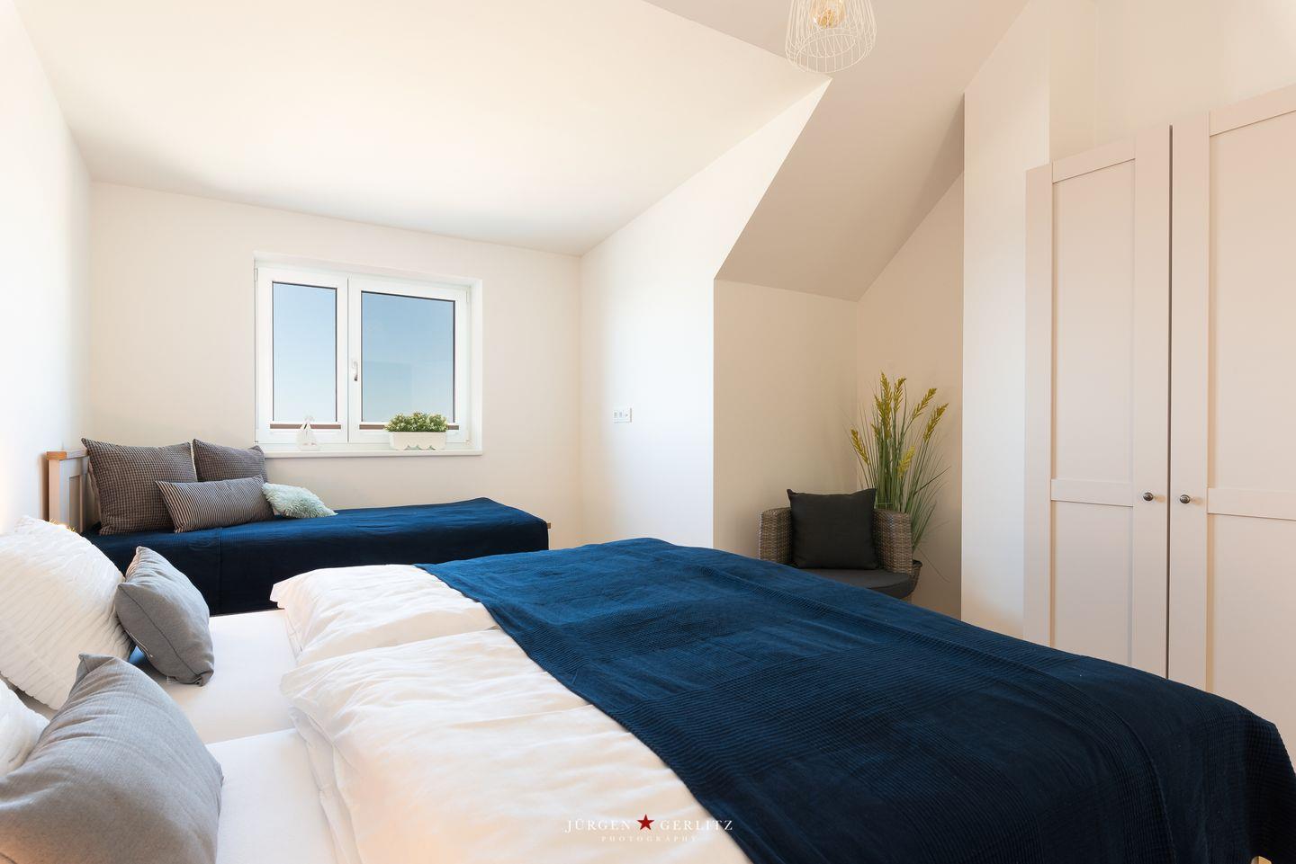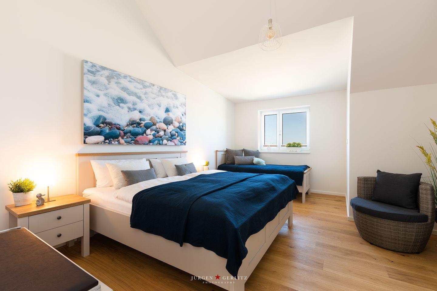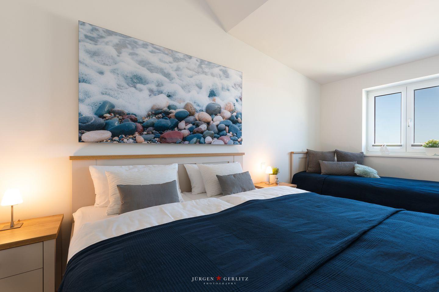 Das Schlafzimmer bietet Dir eine ruhige Rückzugsmöglichkeit mit einem bequemen Doppelbett sowie einem Einzelbett. Das Schlafsofa im Wohnbereich bietet Dir Platz für zwei weitere Gäste. Zudem stehen Dir ein Badezimmer mit bodengleicher Dusche und ausreichenden Ablagemöglichkeiten sowie praktische Annehmlichkeiten wie eine Waschmaschine und eine Fußbodenheizung zur Verfügung, die für zusätzlichen Komfort sorgen.