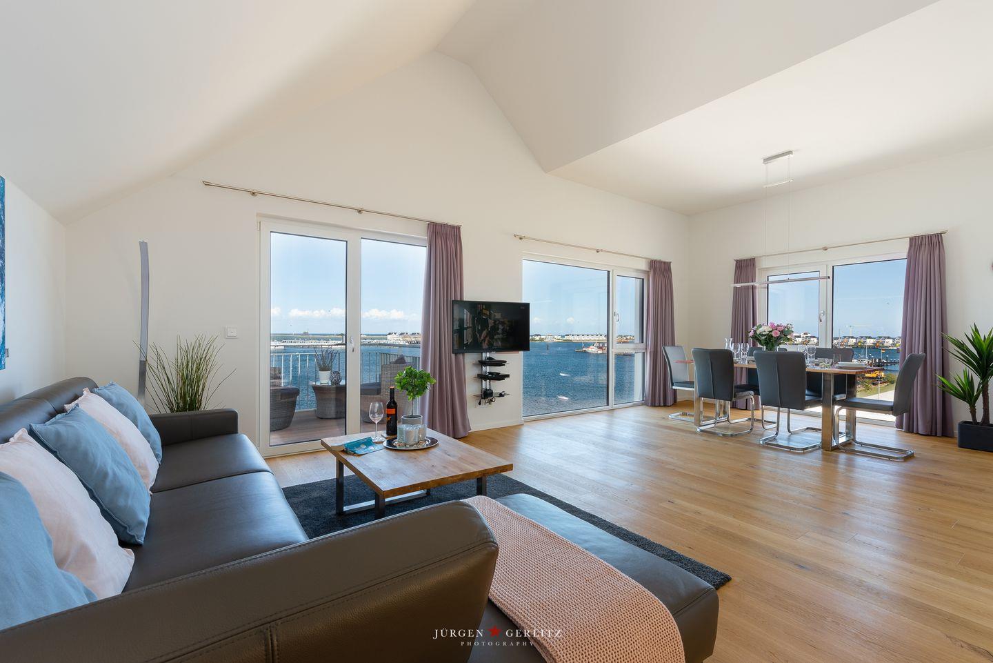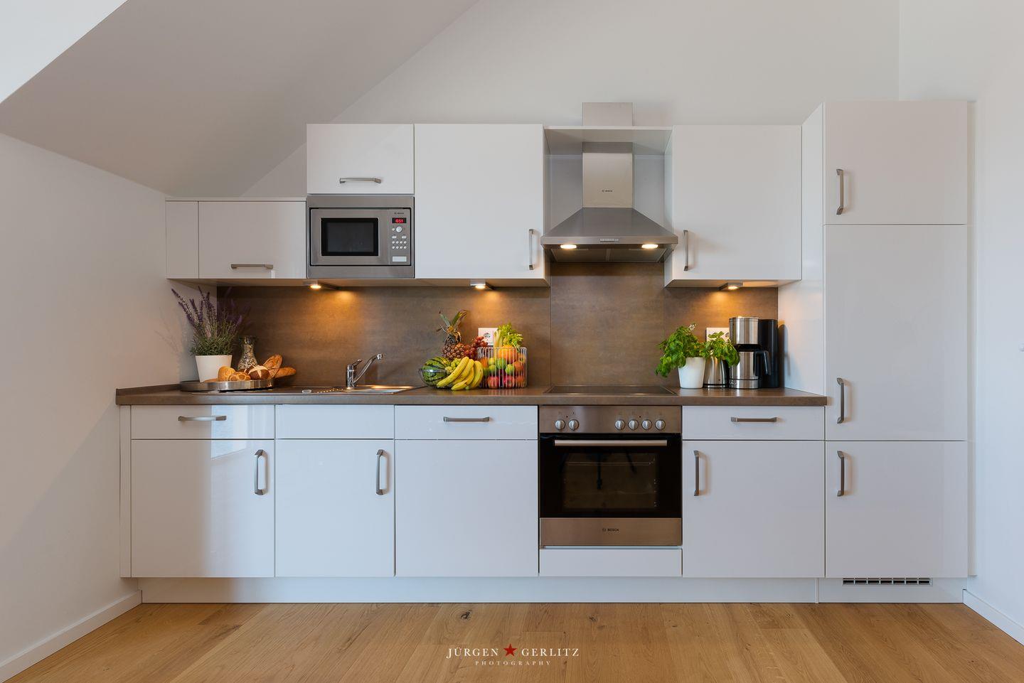 Die Wohnung verfügt über ein harmonisches, offenes Wohnkonzept. Im liebevoll gestalteten Wohnbereich findest Du ein gemütliches Sofa, auf dem Du Dich nach einem aktiven Tag vor dem Smart-TV entspannen kannst oder einfach dem Rauschen der Wellen lauschst, während Du den Sonnenuntergang über der Ostsee bewunderst. Die moderne Küche ist mit allem ausgestattet, was das Herz begehrt – von einem Cerankochfeld über eine Spülmaschine bis hin zu hochwertigen Küchenutensilien. Genieße gemeinsam am Esstisch köstliche Mahlzeiten, die Du in der voll ausgestatteten Küche zubereitest.