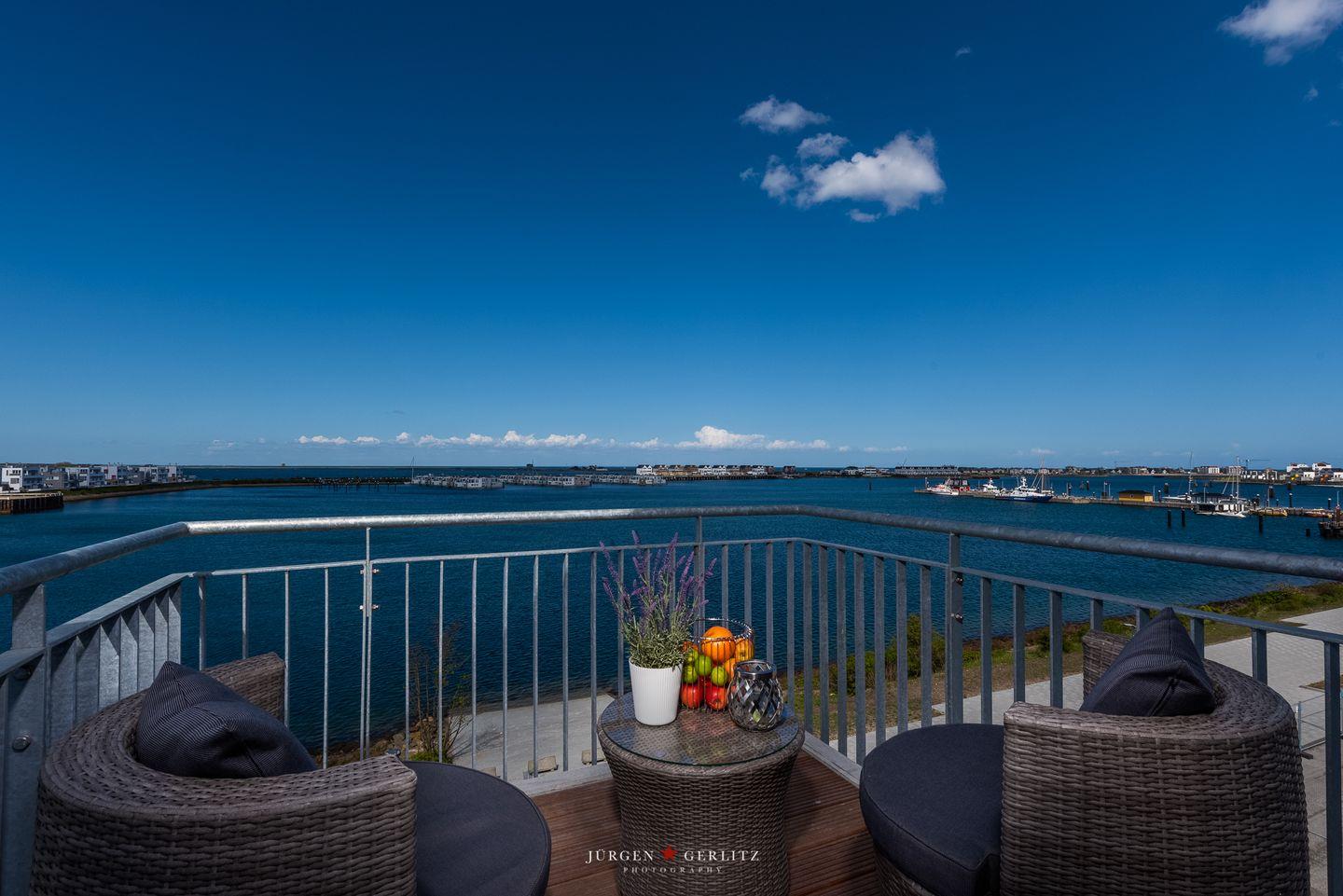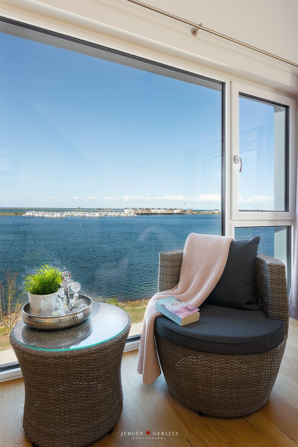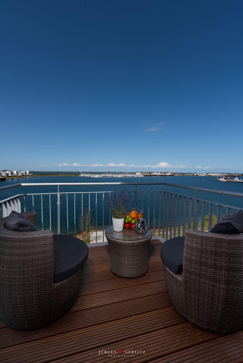 Ein weiteres Highlight ist der Balkon, auf dem Du die frische Meeresbrise genießen und den traumhaften Ausblick auf das Wasser erleben kannst. Die Gartenmöbel laden Dich dazu ein, hier ein gutes Buch zu lesen oder einfach nur die Seele baumeln zu lassen.