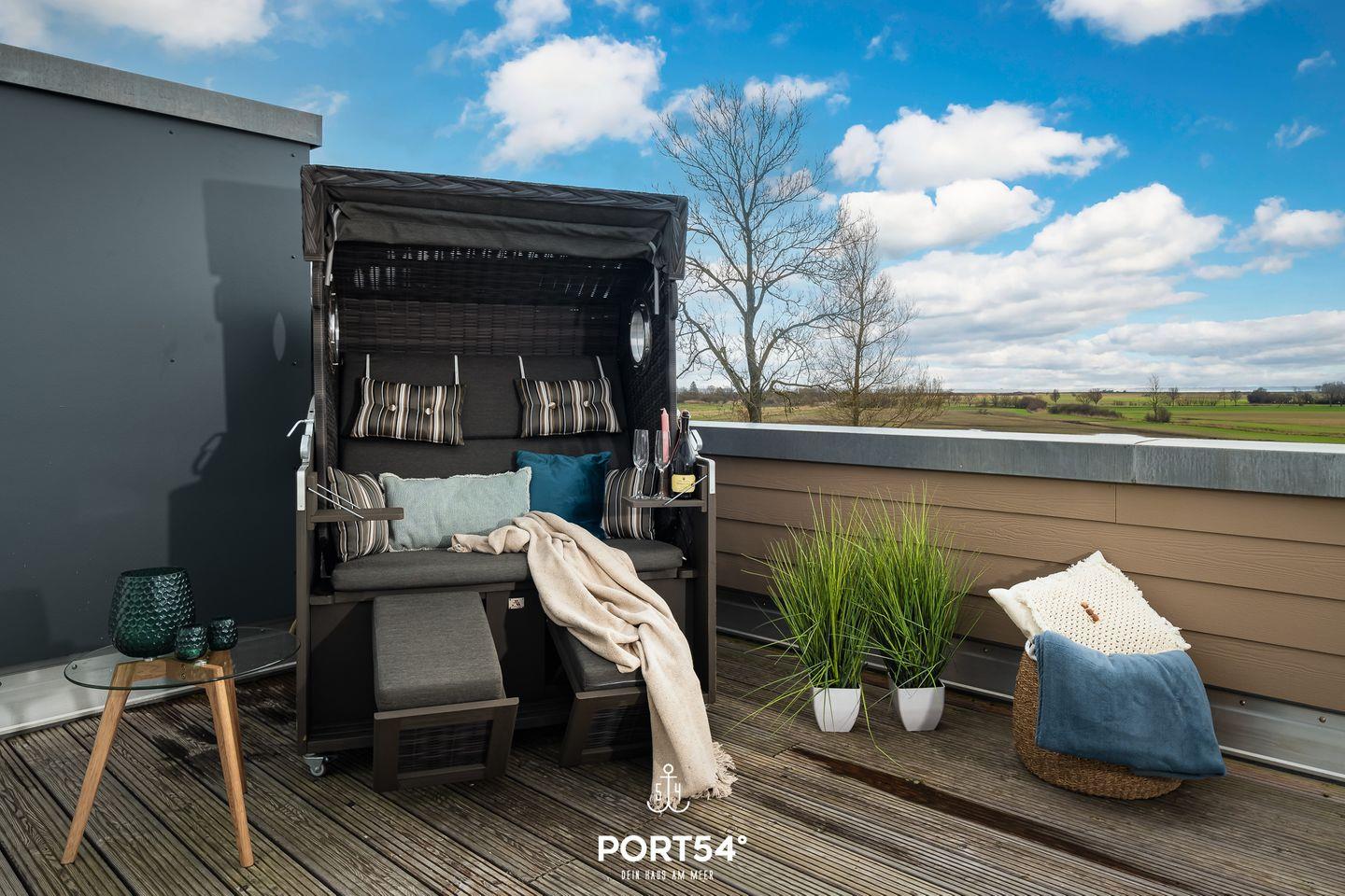Der Zutritt auf die möblierte Dachterrasse ist Dir direkt vom Wohnbereich aus möglich. Auf den gepolsterten Sitzmöglichkeiten lässt sich ein schöner Grillabend am Elektro-Grill verbringen.