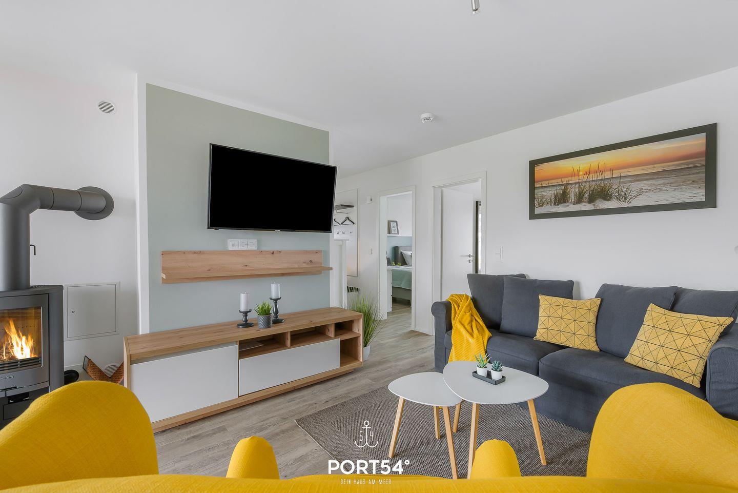 Das helle und einladende Wohnzimmer ist der perfekte Ort, um nach einem aufregenden Tag am Strand zu entspannen. Hier findest Du auch einen Kaminofen, der an kühleren Tagen für wohlige Wärme sorgt und eine gemütliche Atmosphäre schafft. In der kalten Jahreszeit kannst Du Dich zusätzlich in der Infrarot-Sauna und in der Whirlwanne erholen.