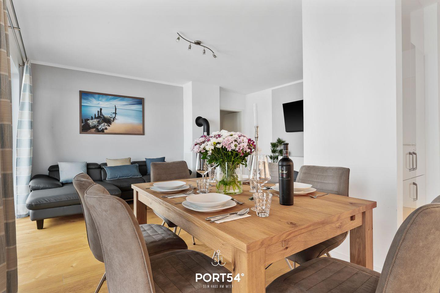 Der lichtdurchflutete Wohnbereich ist der Mittelpunkt geselliger Abende. Eine gemütliche Couch und ein Flachbild-TV laden Dich zum Relaxen ein, während Du durch die bodentiefen Fenster den Blick auf die Umgebung genießen kannst.