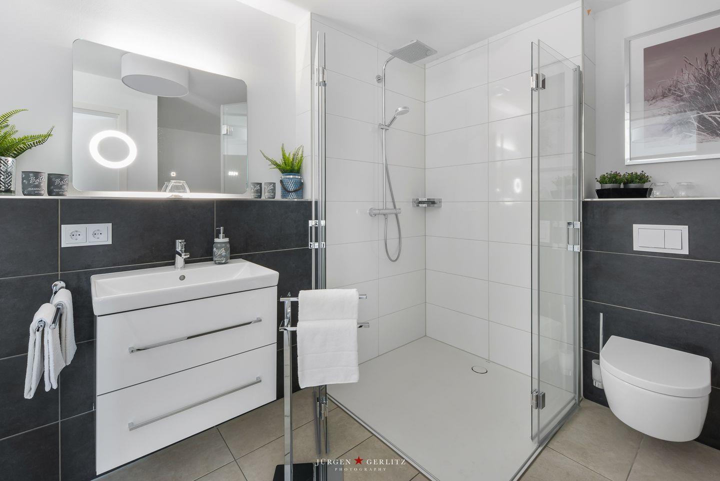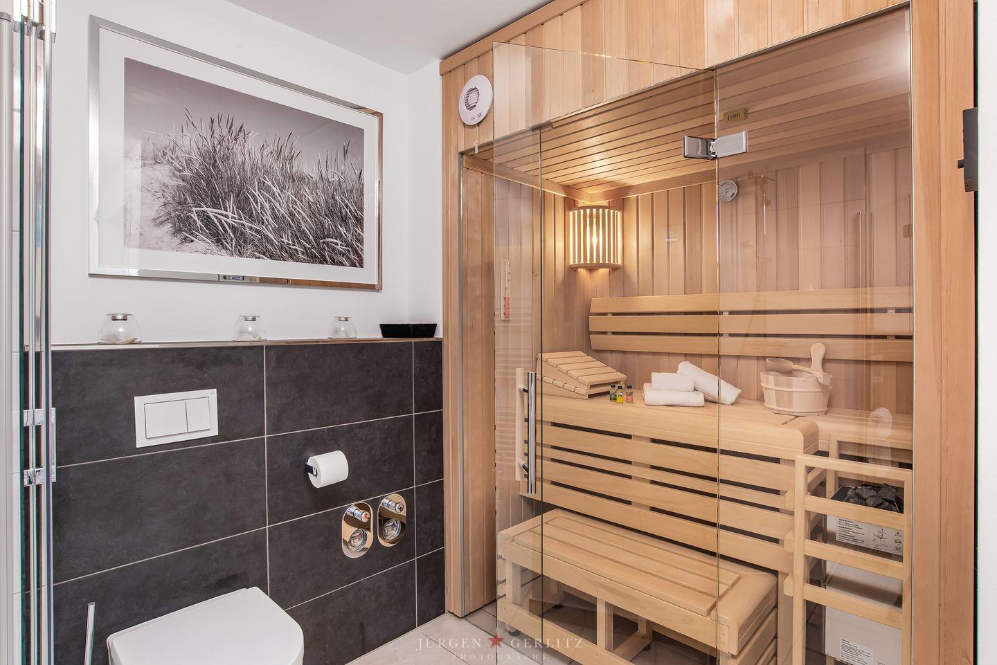 Das Badezimmer ist ebenfalls modern gestaltet und bietet als ganz besonderes Highlight eine finnische Sauna, in der Du zusätzliche Entspannung finden kannst.