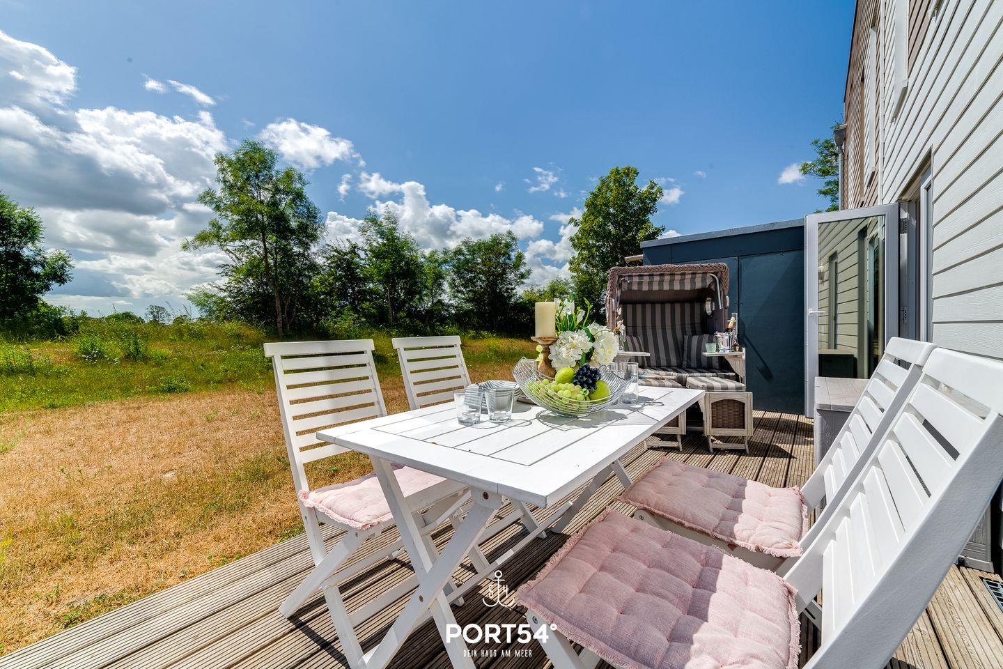 Die Terrasse verfügt über Gartenmöbel und einen Strandkorb, in dem Du auch an windigen Tagen Deinen Morgenkaffee genießen kannst.
