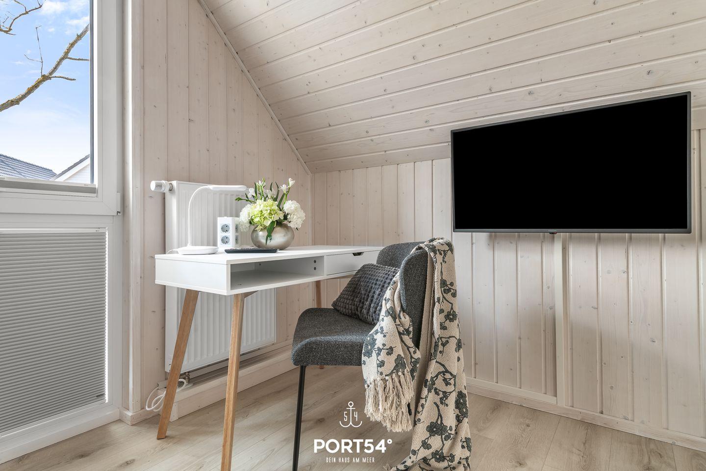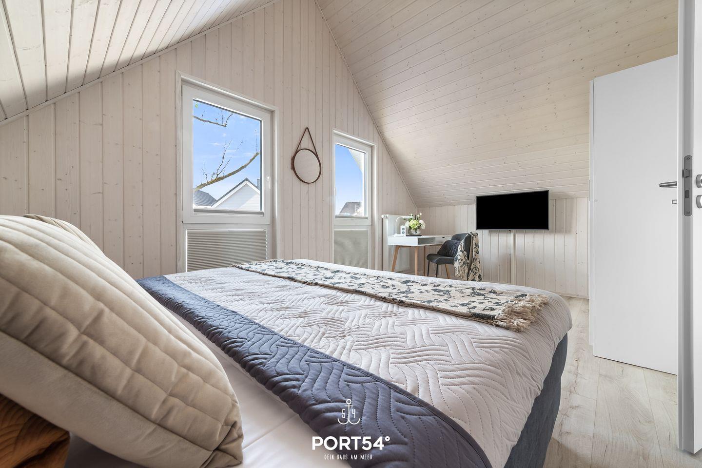 Eines der beiden Schlafzimmer im 1. Obergeschoss bietet Dir ein gemütliches Doppelbett (180x200cm), einen Schreibtisch und einen Flachbild-TV (mit Magenta TV).