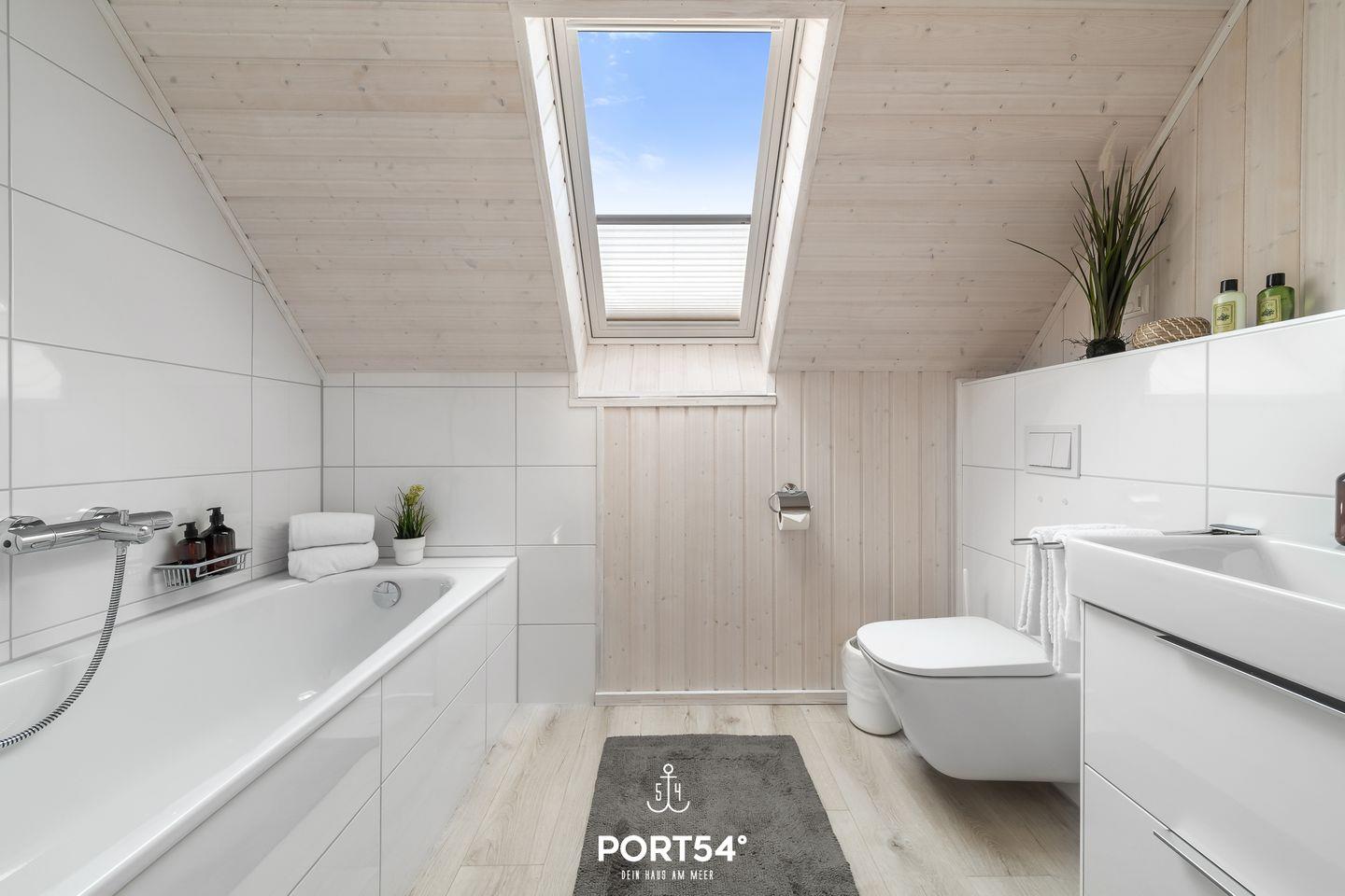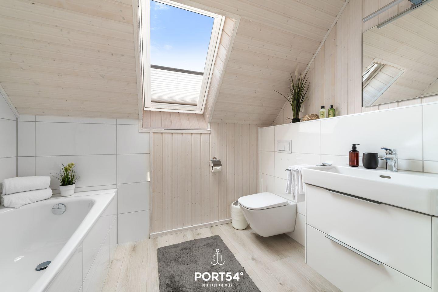 Das zweite Badezimmer im 1. Obergeschoss bietet Dir einen Handtuchtrockner, einen Föhn und eine Badewanne.