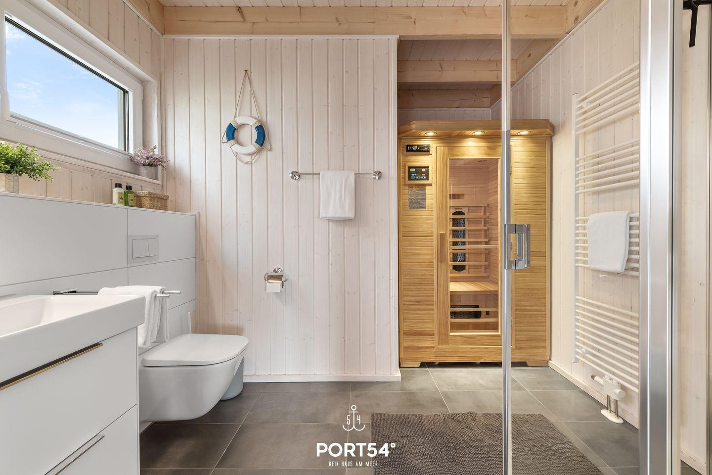 Eines der beiden Badezimmer befindet sich im Erdgeschoss und verfügt über einen Handtuchtrockner, eine Dusche und das Highlight: eine Infrarot-Sauna – Wellness pur! Hier kannst Du Dich nach langen Strandspaziergängen wieder aufwärmen und entspannen.