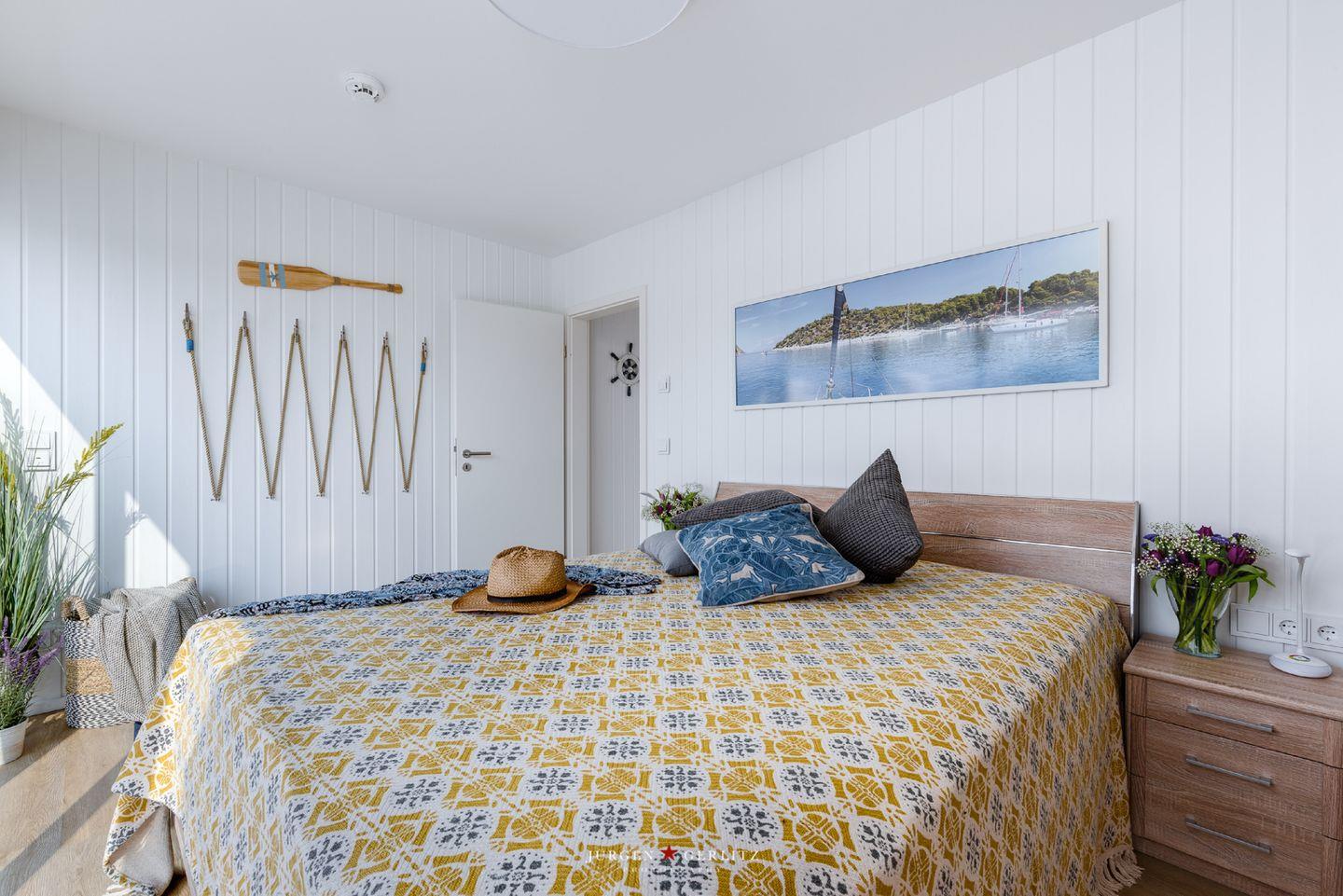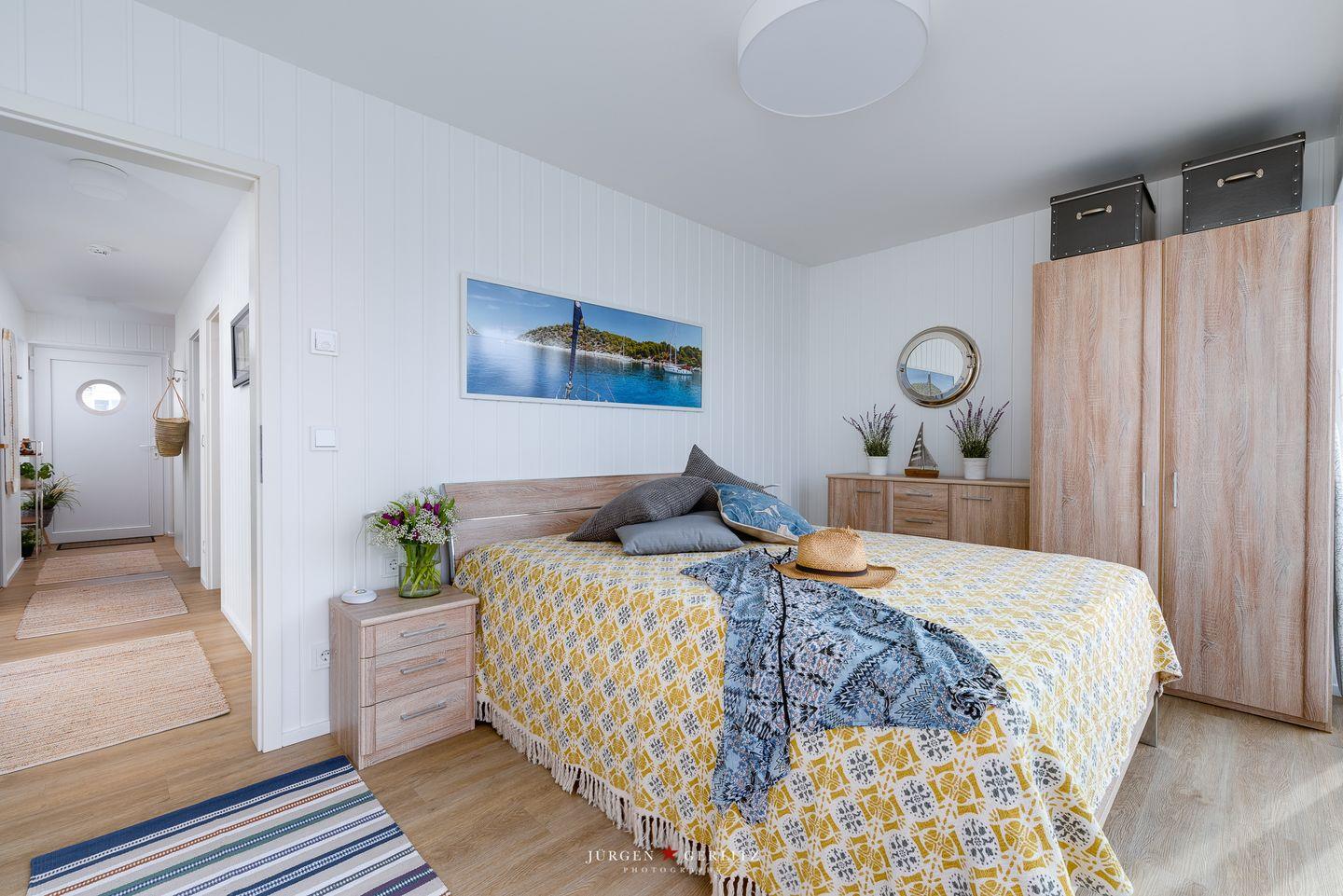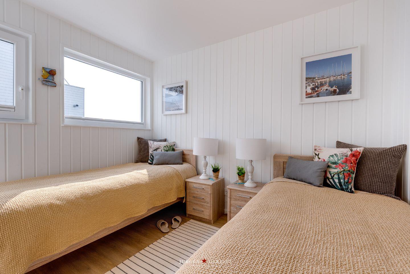Im Erdgeschoss befinden sich die beiden Schlafzimmer – eines bietet Dir ein gemütliches Doppelbett und im anderen Zimmer warten zwei Einzelbetten auf Dich. Lass Dich am Morgen von einem atemberaubenden Blick auf das glitzernde Wasser wecken.