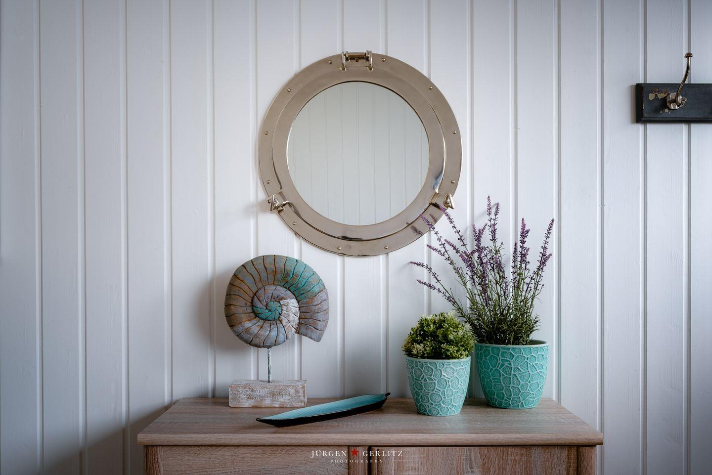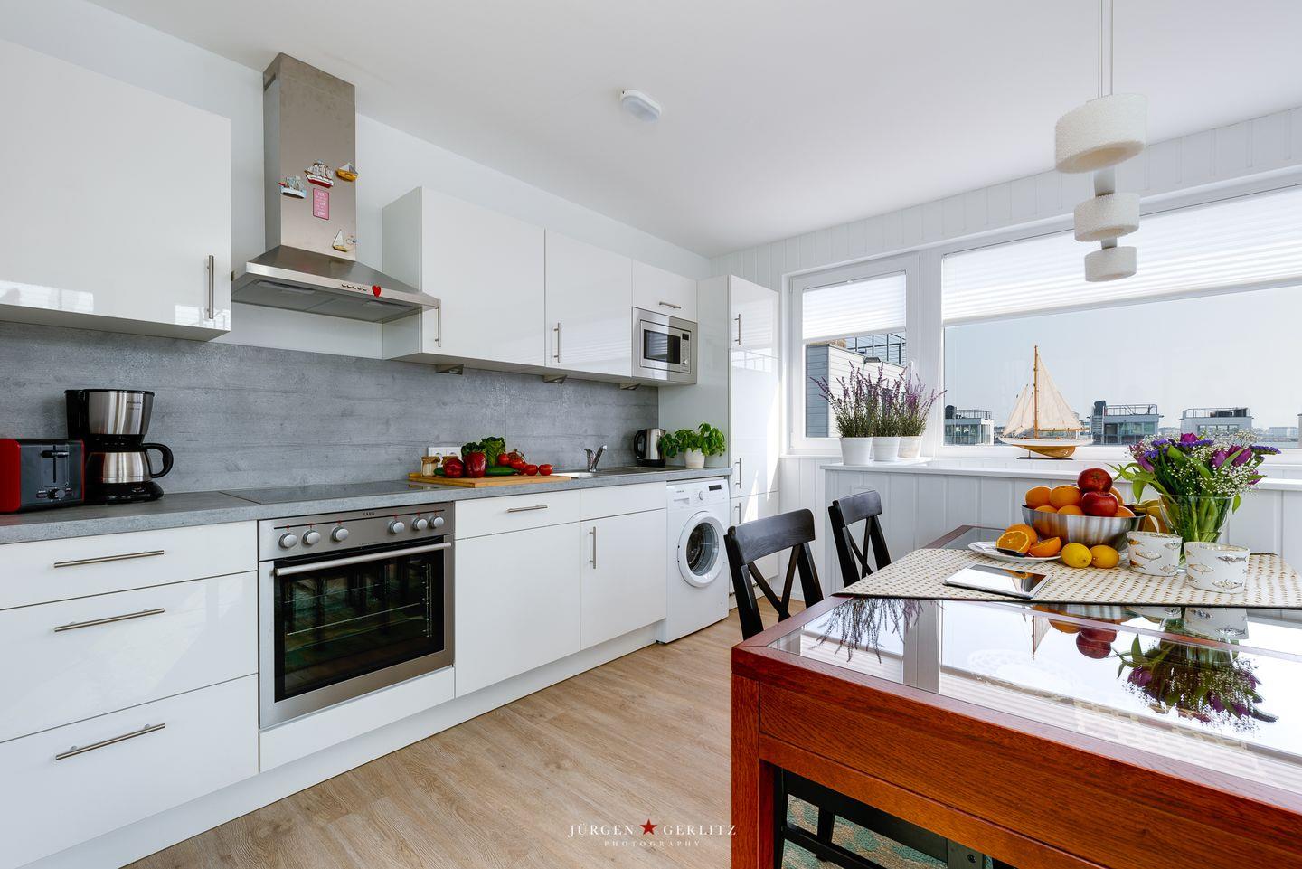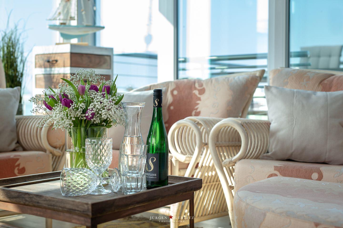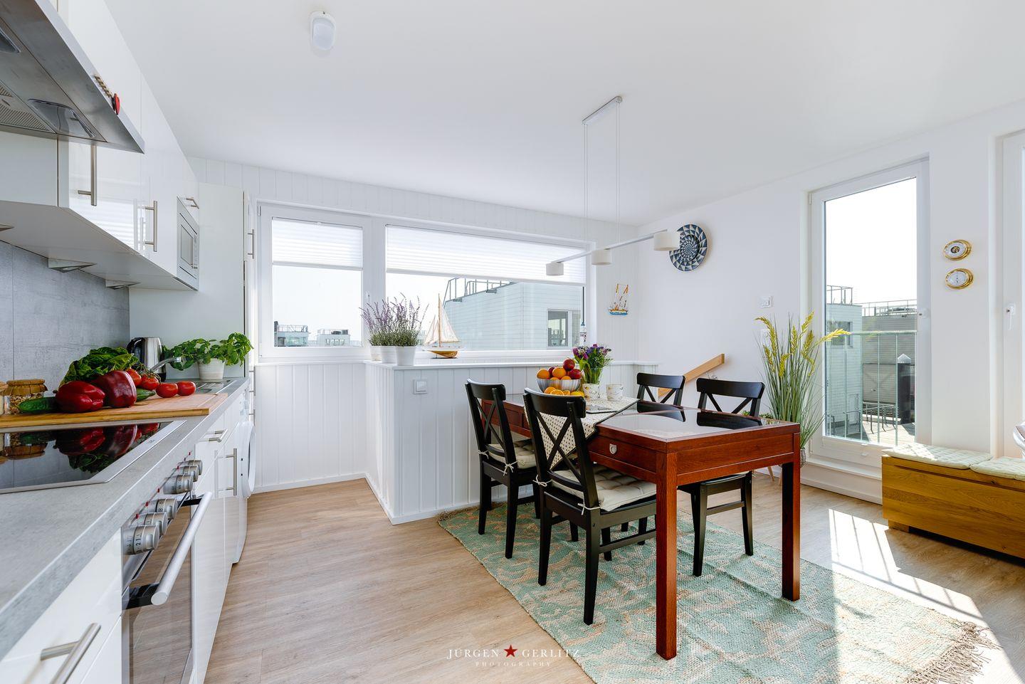 Tritt hinaus auf den großzügigen Balkon mit bequemen Gartenmöbeln und lass Dich von der frischen Brise zu einem entspannten Frühstück im Freien einladen. Die Dachterrasse, erreichbar vom Balkon aus, schenkt Dir einen traumhaften 360°-Blick auf die Schleimündung, die Ostsee und den Hafen des Resorts.