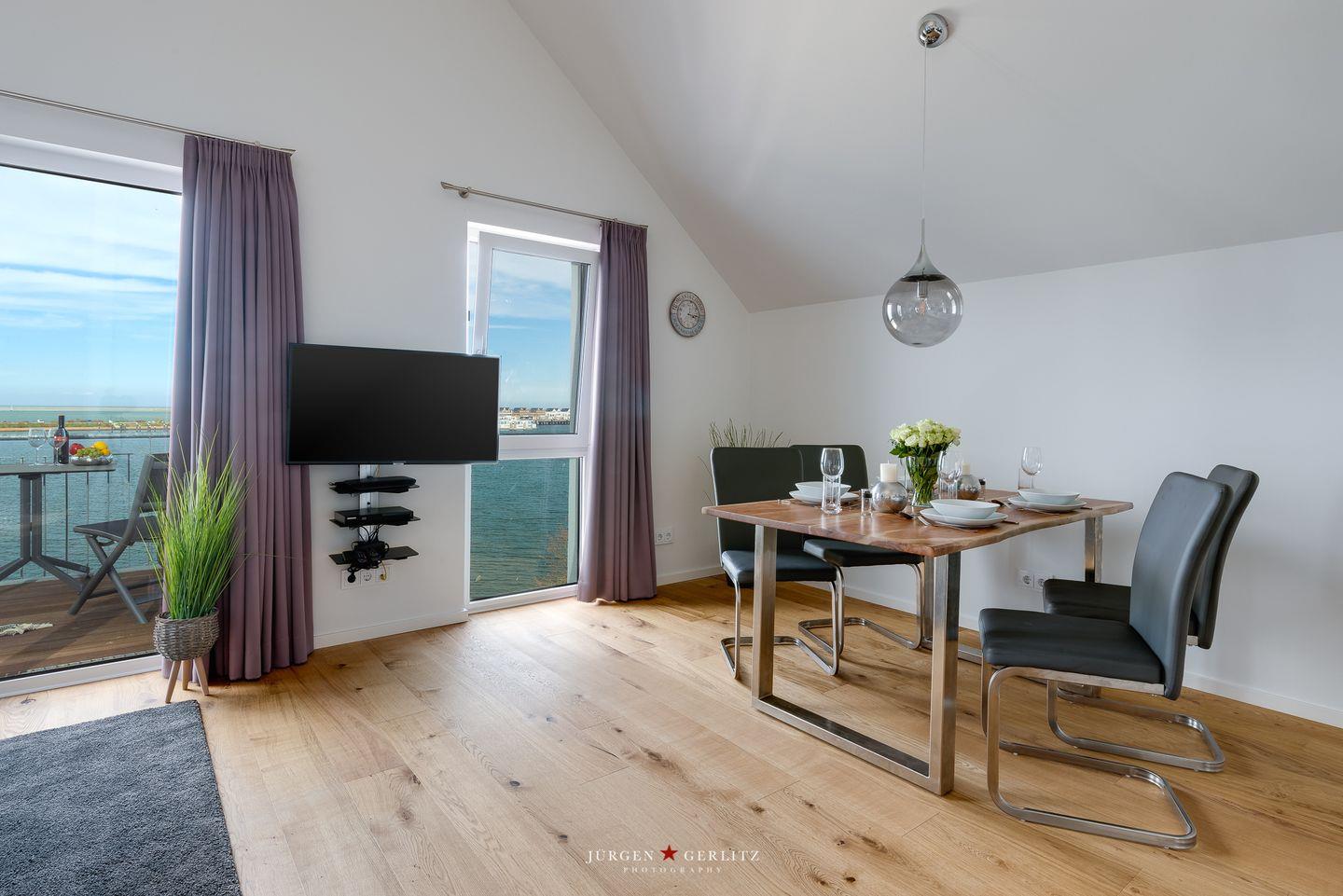 Diese exklusive Ferienwohnung „Sailors View“ liegt nur wenige Meter vom Wasser entfernt. Auf knapp 66 m² bietet sie Dir ein Schlafzimmer mit komfortablem Doppelbett, einen offenen Wohn-/Essbereich, eine Küche & ein gemütliches Schlafsofa. Das großzügige Badezimmer verfügt über eine ebenerdige Dusche. Das Highlight ist der Balkon mit Wasserblick, auf dem Du die Sonnenaufgänge genießen kannst. Ein kostenfreier Parkplatz befindet sich vor dem Haus.