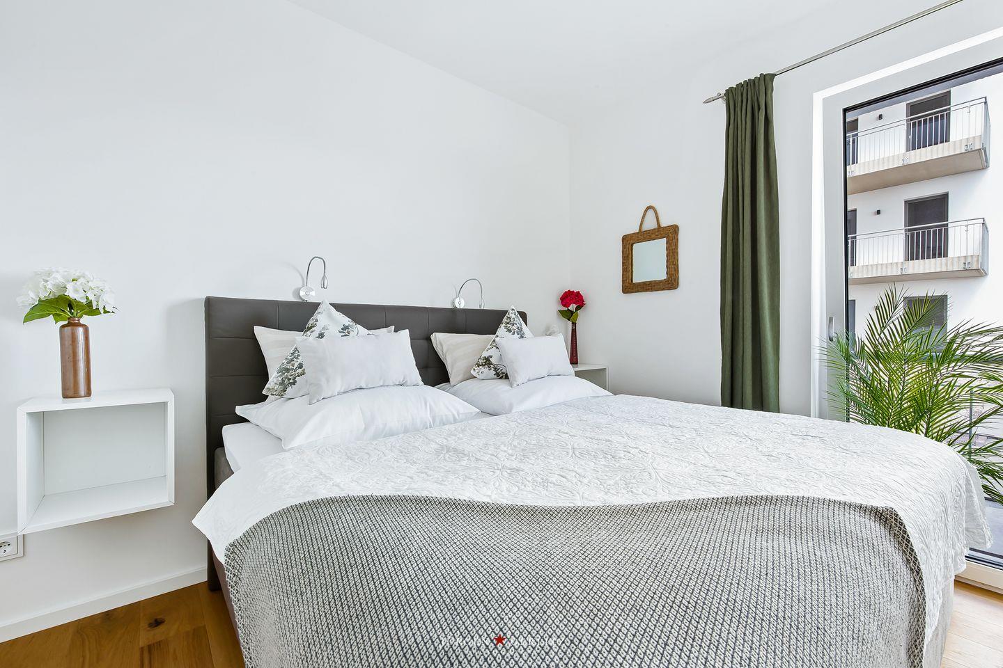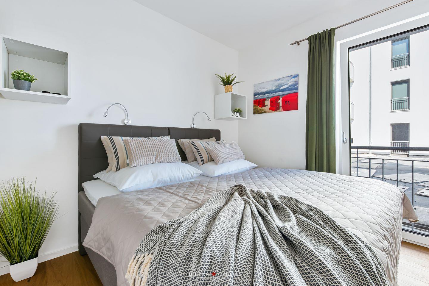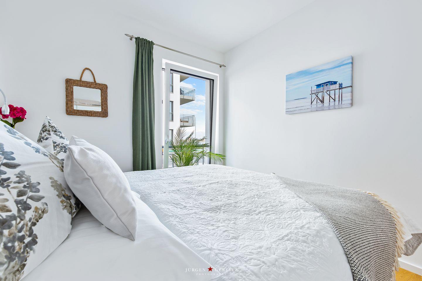 Die zwei Schlafzimmer sind mit hochwertigen Boxspringbetten ausgestattet, einem Doppel-Boxspringbett und zwei Einzel-Boxspringbetten.