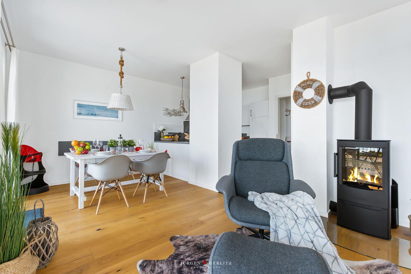 Auch in der dunklen Jahreszeit, wenn die Ostsee vor der Fensterfront ihr Temperament zeigt, genießt Du die wohlige Atmosphäre bei prasselndem Kaminfeuer.