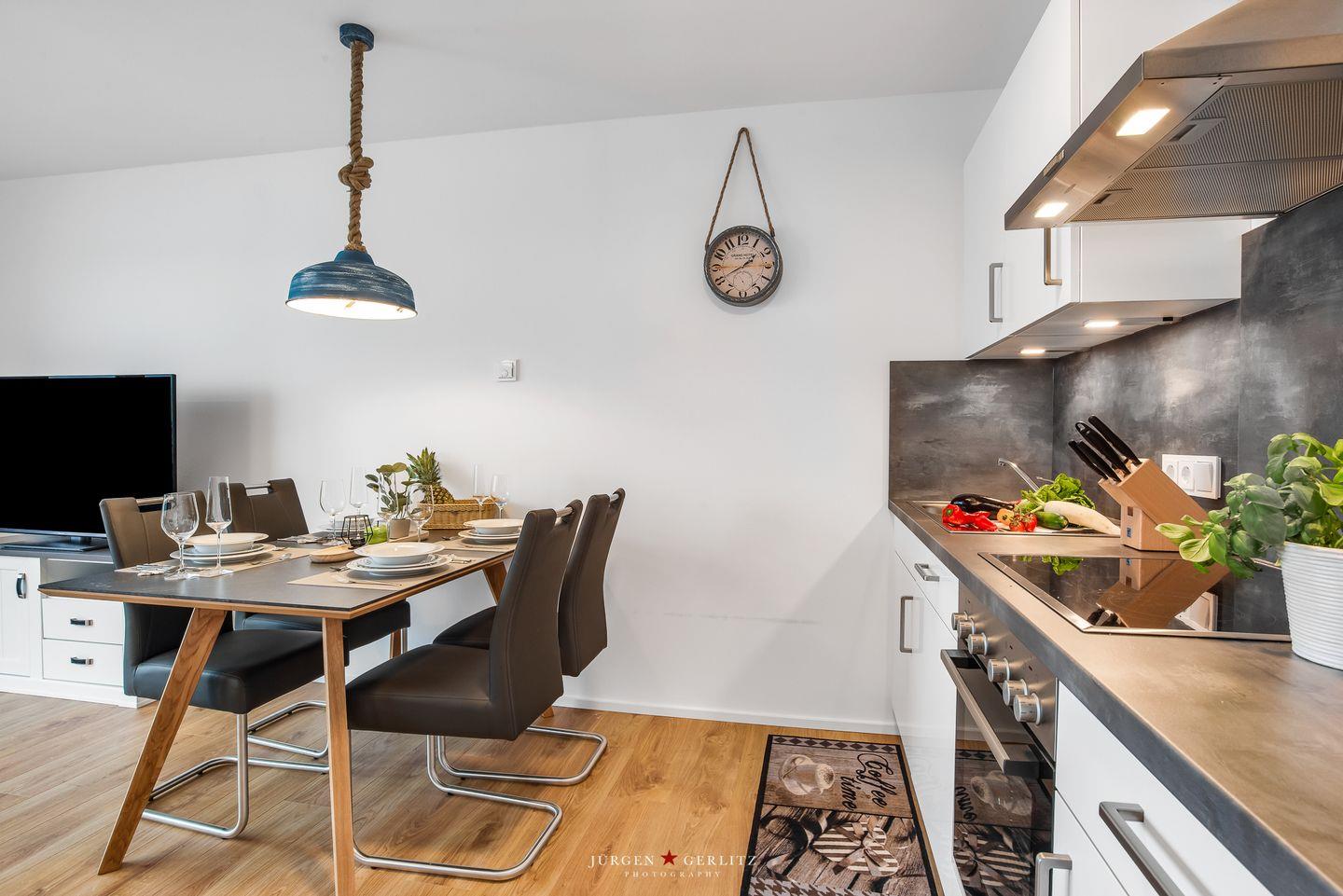 Der offene Wohnraum, geschmackvoll gestaltet und harmonisch mit einer ebenso offenen Küche kombiniert, schafft eine luftige Atmosphäre und lädt Dich dazu ein, Deine kostbare Urlaubszeit in vollen Zügen zu genießen.